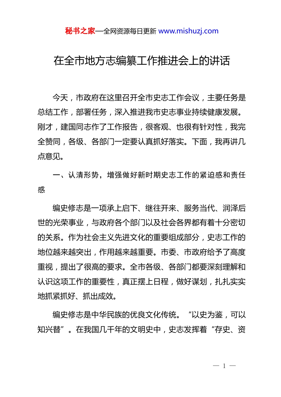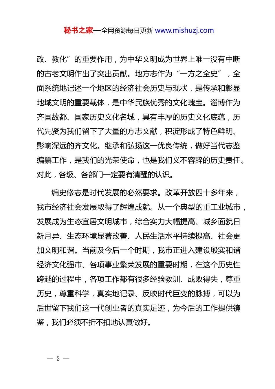 秘书之家—全网资源每日更新 www.mishuzj.com在全市地方志编纂工作推进会上的讲话今天,市政府在这里召开全市史志工作会议,主要任务是总结工作,部署任务,深入推进我市史志事业持续健康发展。刚才,建国同志作了工作报告,很客观、也很有针对性,我完全赞同,各级、各部门一定要认真抓好落实。下面,我再讲几点意见。一、认清形势,增强做好新时期史志工作的紧迫感和责任感编史修志是一项承上启下、继往开来、服务当代、润泽后世的光荣事业,与政府各个部门以及社会各界都有着十分密切的关系。作为社会主义先进文化的重要组成部分,史志工作的地位越来越突出,作用越来越重要。市委、市政府给予了高度重视,提出了很高的要求。全市各级、各部门都要深刻理解和认识这项工作的重要性,真正摆上日程,做好谋划,扎扎实实地抓紧抓好、抓出成效。编史修志是中华民族的优良文化传统。“以史为鉴,可以知兴替”。在我国几千年的文明史中,史志发挥着“存史、资— 1 —秘书之家—全网资源每日更新 www.mishuzj.com政、教化”的重要作用,为中华文明成为世界上唯一没有中断的古老文明作出了突出贡献。地方志作为“一方之全史”,全面系统地记述一个地区的经济社会历史与现状,是传承和彰显地域文明的重要载体,是中华民族优秀的文化瑰宝。淄博作为齐国故都、国家历史文化名城,具有丰厚的历史文化底蕴,历代先贤为我们留下了大量的方志文献,积淀形成了特色鲜明、影响深远的齐文化。继承和弘扬这一优良传统,做好当代志鉴编纂工作,是我们的光荣使命,也是我们义不容辞的历史责任。对此,各级、各部门一定要有清醒的认识。编史修志是时代发展的必然要求。改革开放四十多年来,我市经济社会发展取得了辉煌成就。从一个典型的重工业城市,发展成为生态宜居文明城市,综合实力大幅提高、城乡面貌日新月异、生态环境显著改善、人民生活水平持续提高、社会更加文明和谐。当前及今后一个时期,我市正进入建设殷实和谐经济文化强市、各项事业繁荣发展的重要时期,在这个历史性跨越的过程中,各项工作都有很多经验教训、成败得失,尊重历史,尊重科学,真实地记录、反映时代巨变的脉搏,可以为后世留下我们这一代创业者的真实足迹,为今后的工作提供镜鉴,我们必须不折不扣地认真做好。— 2 —秘书之家—全网资源每日更新 www.mishuzj.com编史修志是社会主义文化大发展大繁荣的重要支撑。我国志史素来推崇“春秋笔法”,在客观记述的同时,隐恶扬善,引导人民树立正确的人生观、价值观。从这一点来讲,编史修志对于推进社会主义核心价值体系建设具有积极的意义,为*、为国、为民立言,本身就是社会主义先进文化的重要组成部分。因此,要充分认识到史志工作不仅传承和彰显淄博的历史文明,而且在促进社会主义精神文明和淄博殷实和谐经济文化强市建设中具有十分重要的意义。二、科学规划,突出重点,努力实现史志工作新跨越近年来,史志工作得到市委、市政府的高度重视。史志战线的同志们甘于奉献,努力工作,取得了丰硕的成果,许多领域已处于全省甚至全国领先水平。去年以来,中国地方志指导小组领导两次来我市视察,对我市史志工作给予了高度评价。市委、市政府对全市史志系统的工作是满意的,对史志事业未来的发展也寄予厚望。各级、各部门必须按照市里的统一部署,认真专业务实地做好各自的工作。(一)加强规范管理,推动基层修志工作全面开展。新方志编纂启动后,几代史志工作者上下同心,几十年如一日,潜心研究,字斟句酌,数易其稿,志书编纂进度之快、质量之高,— 3 —秘书之家—全网资源每日更新 www.mishuzj.com在方志界有目共睹,为我市树立了良好的形象。下一步,市史志办在做好《淄博市志》全国地方志精品工程评选工作的同时,要及时总结十年来的经验教训,探索修志工作的规律,形成理论成果,供全市史志系统和修志单位交流、学习。现在,市、区县第二轮修志工作已基本完成,要把工作重点放在指导基层志书编纂上来。各区县要采取措施,鼓励乡镇、经济强村和有条件的部门、企业编修志书。基层修志不仅是对每一个修志单位发展历程的记录和总结,也是对其文化精神的提炼和塑...