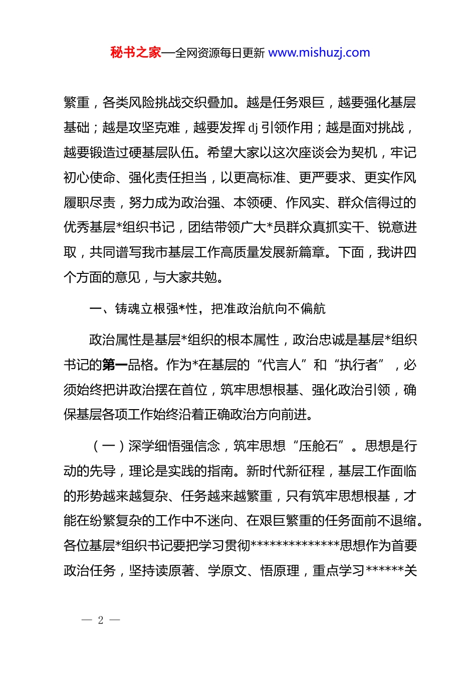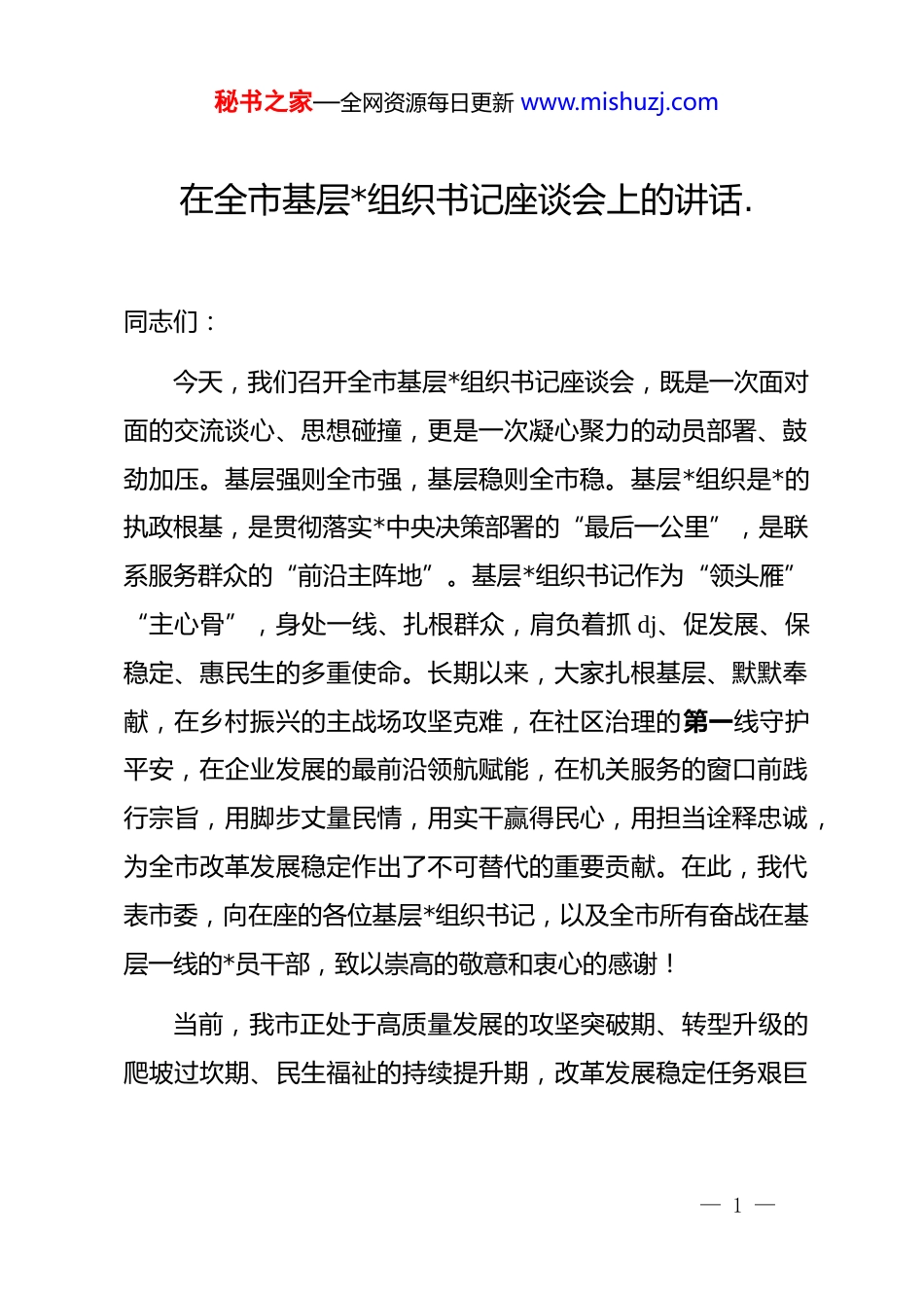 秘书之家—全网资源每日更新 www.mishuzj.com在全市基层*组织书记座谈会上的讲话.同志们:今天,我们召开全市基层*组织书记座谈会,既是一次面对面的交流谈心、思想碰撞,更是一次凝心聚力的动员部署、鼓劲加压。基层强则全市强,基层稳则全市稳。基层*组织是*的执政根基,是贯彻落实*中央决策部署的“最后一公里”,是联系服务群众的“前沿主阵地”。基层*组织书记作为“领头雁”“主心骨”,身处一线、扎根群众,肩负着抓 dj、促发展、保稳定、惠民生的多重使命。长期以来,大家扎根基层、默默奉献,在乡村振兴的主战场攻坚克难,在社区治理的第一线守护平安,在企业发展的最前沿领航赋能,在机关服务的窗口前践行宗旨,用脚步丈量民情,用实干赢得民心,用担当诠释忠诚,为全市改革发展稳定作出了不可替代的重要贡献。在此,我代表市委,向在座的各位基层*组织书记,以及全市所有奋战在基层一线的*员干部,致以崇高的敬意和衷心的感谢!当前,我市正处于高质量发展的攻坚突破期、转型升级的爬坡过坎期、民生福祉的持续提升期,改革发展稳定任务艰巨— 1 —秘书之家—全网资源每日更新 www.mishuzj.com繁重,各类风险挑战交织叠加。越是任务艰巨,越要强化基层基础;越是攻坚克难,越要发挥 dj 引领作用;越是面对挑战,越要锻造过硬基层队伍。希望大家以这次座谈会为契机,牢记初心使命、强化责任担当,以更高标准、更严要求、更实作风履职尽责,努力成为政治强、本领硬、作风实、群众信得过的优秀基层*组织书记,团结带领广大*员群众真抓实干、锐意进取,共同谱写我市基层工作高质量发展新篇章。下面,我讲四个方面的意见,与大家共勉。一、铸魂立根强*性,把准政治航向不偏航政治属性是基层*组织的根本属性,政治忠诚是基层*组织书记的第一品格。作为*在基层的“代言人”和“执行者”,必须始终把讲政治摆在首位,筑牢思想根基、强化政治引领,确保基层各项工作始终沿着正确政治方向前进。(一)深学细悟强信念,筑牢思想“压舱石”。思想是行动的先导,理论是实践的指南。新时代新征程,基层工作面临的形势越来越复杂、任务越来越繁重,只有筑牢思想根基,才能在纷繁复杂的工作中不迷向、在艰巨繁重的任务面前不退缩。各位基层*组织书记要把学习贯彻**************思想作为首要政治任务,坚持读原著、学原文、悟原理,重点学习******关— 2 —秘书之家—全网资源每日更新 www.mishuzj.com于*的建设、基层治理、乡村振兴、企业发展、民生保障等重要讲话和****批示精神,深刻领悟“两个确立”的决定性意义,增强“四个意识”、坚定“四个自信”、做到“两个维护”。要结合“三会一课”、主题*日、专题研讨等形式,推动理论学习往深里走、往实里走、往心里走,不搞形式主义、不做表面文章,真正做到学思用贯通、知信行统一。要坚持理论联系实际,把学习成果转化为解决实际问题、推动基层发展的具体举措,比如农村*组织书记要结合本村产业发展、人居环境整治等工作学,社区*组织书记要结合网格治理、便民服务等工作学,企业*组织书记要结合技术攻关、安全生产等工作学,让*的创新理论成为指导基层工作的“金钥匙”,让理想信念成为引领基层发展的“定盘星”。(二)对标对表强引领,把准政治“方向盘”。基层*组织书记作为“领头雁”,政治引领能力直接关系到基层*组织的凝聚力、战斗力和执行力,关系到*中央决策部署在基层的落地见效。要始终把政治引领贯穿基层工作全过程、各方面,坚决贯彻落实*中央大政方针和省委、市委工作部署,不打折扣、不搞变通、不做选择,确保政令畅通、令行禁止。要善于用群众通俗易懂的语言宣传解读*的路线方针政策,把“书面语”转化为— 3 —秘书之家—全网资源每日更新 www.mishuzj.com“家常话”,把“大道理”转化为“小故事”,让群众明白“惠在何处、惠从何来”,不断增强群众的政治认同、思想认同、理论认同、情感认同,引导广大*员群众听*话、跟*走。要敢于在重大原则问题上立场坚定、旗帜鲜明,在突发事件处置中冲锋在前、主动担当,在歪风邪气面前敢于斗争、坚决抵制。在急难险重任务中,要第一时间组织*员群众响应号召、投...