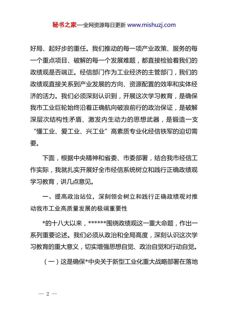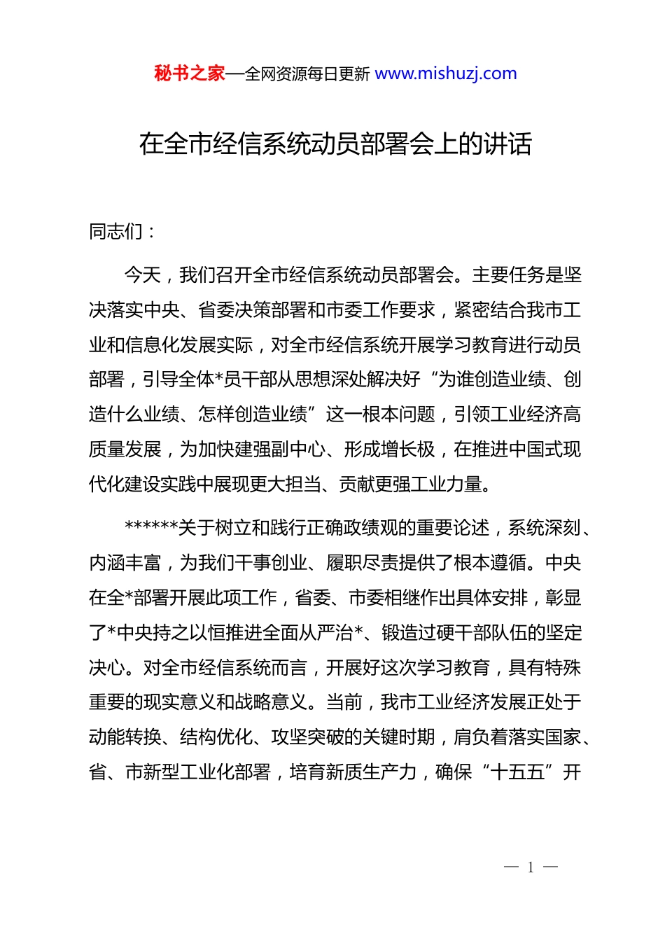 秘书之家—全网资源每日更新 www.mishuzj.com在全市经信系统动员部署会上的讲话同志们:今天,我们召开全市经信系统动员部署会。主要任务是坚决落实中央、省委决策部署和市委工作要求,紧密结合我市工业和信息化发展实际,对全市经信系统开展学习教育进行动员部署,引导全体*员干部从思想深处解决好“为谁创造业绩、创造什么业绩、怎样创造业绩”这一根本问题,引领工业经济高质量发展,为加快建强副中心、形成增长极,在推进中国式现代化建设实践中展现更大担当、贡献更强工业力量。******关于树立和践行正确政绩观的重要论述,系统深刻、内涵丰富,为我们干事创业、履职尽责提供了根本遵循。中央在全*部署开展此项工作,省委、市委相继作出具体安排,彰显了*中央持之以恒推进全面从严治*、锻造过硬干部队伍的坚定决心。对全市经信系统而言,开展好这次学习教育,具有特殊重要的现实意义和战略意义。当前,我市工业经济发展正处于动能转换、结构优化、攻坚突破的关键时期,肩负着落实国家、省、市新型工业化部署,培育新质生产力,确保“十五五”开— 1 —秘书之家—全网资源每日更新 www.mishuzj.com好局、起好步的重任。我们推动的每一项产业政策、服务的每一个重点项目、破解的每一个发展难题,都直接检验着我们的政绩观是否端正。经信部门作为工业经济的主管部门,我们的政绩观直接关系到产业发展的方向、资源配置的效率和实体经济的活力。我们必须深刻认识到,开展这次学习教育,是确保我市工业巨轮始终沿着正确航向破浪前行的政治保证,是破解深层次结构性矛盾、激发内生动力的思想武器,是锻造一支“懂工业、爱工业、兴工业”高素质专业化经信铁军的迫切需要。下面,根据中央精神和省委、市委部署,结合我市经信工作实际,我就扎实开展好全市经信系统树立和践行正确政绩观学习教育,讲几点意见。一、提高政治站位,深刻领会树立和践行正确政绩观对推动我市工业高质量发展的极端重要性*的十八大以来,******围绕政绩观这一重大命题,作出一系列重要论述。我们必须从政治和全局高度,深刻认识这次学习教育的重大意义,切实增强思想自觉、政治自觉和行动自觉。(一)这是确保*中央关于新型工业化重大战略部署在落地— 2 —秘书之家—全网资源每日更新 www.mishuzj.com生根的必然要求。推进新型工业化是中国式现代化建设的战略支撑。工信领域是主战场,经信部门是主力军。当前,我市工业经济稳中向好,2025 年全市规模以上工业增加值同比增长约6.8%,工业投资增速保持两位数增长,但产业结构偏重、创新能力亟待提升、产业链供应链韧性和安全水平有待加强等问题依然突出。正确的政绩观,是我们完整、准确、全面贯彻新发展理念,落实国家制造强国、网络强国战略的“导航仪”。如果政绩观出现偏差,就容易在落实中央决策时搞变通、打折扣,热衷于追逐投资规模大、短期内能拉动 gdp 的“显绩”项目,而忽视强基固本、培育长远竞争力的“潜绩”工作;就可能为了一时数据“好看”,忽视发展的质量和效益,甚至触碰生态红线、安全底线。只有牢固树立和践行正确政绩观,我们才能始终心怀“国之大者”,自觉将工业发展放在全国、全省大局中去谋划推进,确保产业发展的每一步都符合中央精神、顺应时代潮流、服务发展全局。(二)这是破解当前工业发展难题、推动工业行稳致远的迫切需要。当前,我市工业发展机遇与挑战交织。从机遇看,“一带一路”建设、中部地区崛起、黄河流域生态保护和高质量发展等国家战略叠加,省委、省政府对副中心城市建设支持— 3 —秘书之家—全网资源每日更新 www.mishuzj.com力度持续加大,我市产业基础、区位交通、人力资源等优势明显。从挑战看,外部环境的复杂性、严峻性、不确定性上升,国内有效需求不足,部分传统行业和企业经营压力较大,战略性新兴产业和未来产业培育需加力提速。截至 2025 年底,我市高新技术产业增加值占规模以上工业增加值比重约为 45%,部分产业链关键环节仍存在“卡脖子”风险。在这样的形势下,是选择遵循规律、久久为功,还是追求表面光鲜、数字政绩?不同的政绩观会导致截然不同的发展路径和结果。开展这次学...