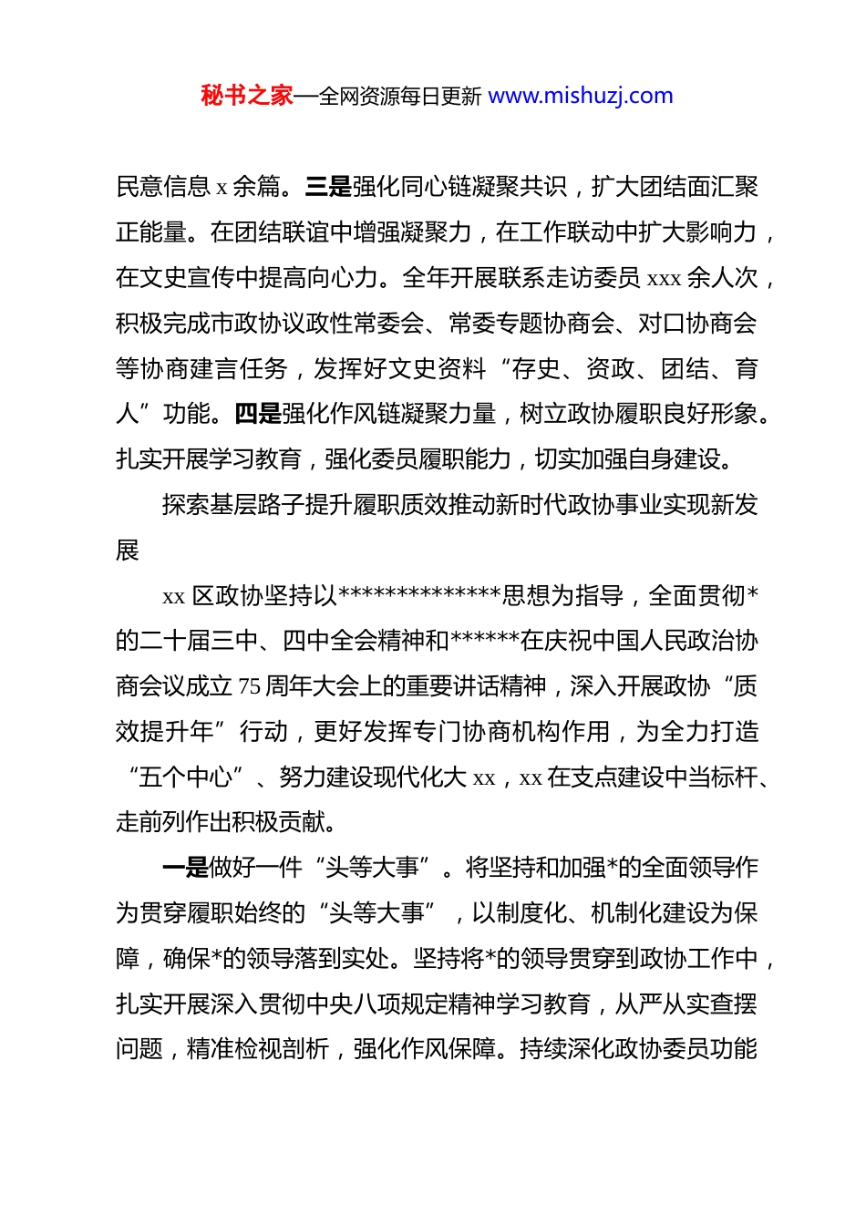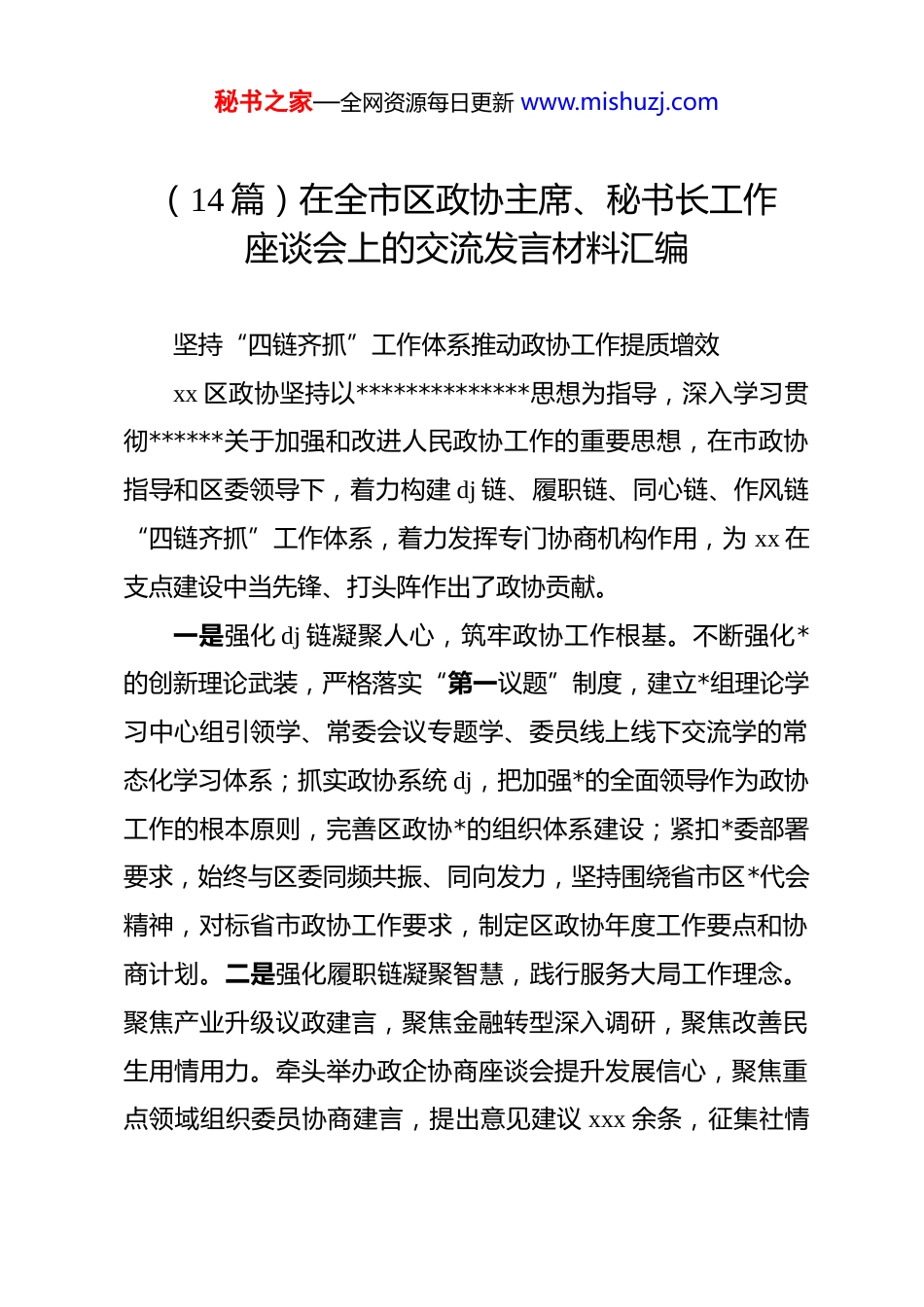 秘书之家—全网资源每日更新 www.mishuzj.com(14 篇)在全市区政协主席、秘书长工作座谈会上的交流发言材料汇编坚持“四链齐抓”工作体系推动政协工作提质增效xx 区政协坚持以**************思想为指导,深入学习贯彻******关于加强和改进人民政协工作的重要思想,在市政协指导和区委领导下,着力构建 dj 链、履职链、同心链、作风链“四链齐抓”工作体系,着力发挥专门协商机构作用,为 xx 在支点建设中当先锋、打头阵作出了政协贡献。一是强化 dj 链凝聚人心,筑牢政协工作根基。不断强化*的创新理论武装,严格落实“第一议题”制度,建立*组理论学习中心组引领学、常委会议专题学、委员线上线下交流学的常态化学习体系;抓实政协系统 dj,把加强*的全面领导作为政协工作的根本原则,完善区政协*的组织体系建设;紧扣*委部署要求,始终与区委同频共振、同向发力,坚持围绕省市区*代会精神,对标省市政协工作要求,制定区政协年度工作要点和协商计划。二是强化履职链凝聚智慧,践行服务大局工作理念。聚焦产业升级议政建言,聚焦金融转型深入调研,聚焦改善民生用情用力。牵头举办政企协商座谈会提升发展信心,聚焦重点领域组织委员协商建言,提出意见建议 xxx 余条,征集社情秘书之家—全网资源每日更新 www.mishuzj.com民意信息 x 余篇。三是强化同心链凝聚共识,扩大团结面汇聚正能量。在团结联谊中增强凝聚力,在工作联动中扩大影响力,在文史宣传中提高向心力。全年开展联系走访委员 xxx 余人次,积极完成市政协议政性常委会、常委专题协商会、对口协商会等协商建言任务,发挥好文史资料“存史、资政、团结、育人”功能。四是强化作风链凝聚力量,树立政协履职良好形象。扎实开展学习教育,强化委员履职能力,切实加强自身建设。探索基层路子提升履职质效推动新时代政协事业实现新发展xx 区政协坚持以**************思想为指导,全面贯彻*的二十届三中、四中全会精神和******在庆祝中国人民政治协商会议成立 75 周年大会上的重要讲话精神,深入开展政协“质效提升年”行动,更好发挥专门协商机构作用,为全力打造“五个中心”、努力建设现代化大 xx,xx 在支点建设中当标杆、走前列作出积极贡献。一是做好一件“头等大事”。将坚持和加强*的全面领导作为贯穿履职始终的“头等大事”,以制度化、机制化建设为保障,确保*的领导落到实处。坚持将*的领导贯穿到政协工作中,扎实开展深入贯彻中央八项规定精神学习教育,从严从实查摆问题,精准检视剖析,强化作风保障。持续深化政协委员功能秘书之家—全网资源每日更新 www.mishuzj.com型*支部融合建设,切实推动政协 dj 实现“两个全覆盖”。持续深化“书香政协”建设,强化政协自身建设。二是实现两个“质效提升”。建言资政更加精准务实,协商民主更加广泛深入。始终将调查研究作为体现政协建言质量的基础性工作,全年围绕科技创新与产业创新深度融合、首发经济、建设现代航运服务业集聚区等 x 个主题扎实开展调查研究,形成调研报告xx 篇;始终将建好用好委员履职平台作为推动政协协商向基层延伸、密切委员与界别群众联系的重要抓手,开展专题协商、界别协商、对口协商 xx 余场,提出专业化意见建议 200 余条,组织委员聚焦一线协商活动 x 余场。三是创新三个“履职品牌”。扎实开展“联系服务周走访”,擦亮“委员沙龙”品牌,创新打造“政协益家人”公益品牌。“和”合赋能“谐”以成事扎实做好“四个凝聚”工作xx 区政协坚持以**************思想为指导,按照******“为推进中国式现代化广泛凝聚人心、凝聚共识、凝聚智慧、凝聚力量”的重要要求,接续推动“忠诚、有为、为民、和谐、活力”五个政协建设,将“和谐政协建设”作为全年工作主题,集和谐之智、聚和谐之力、发和谐之声、彰和谐之能。一是政治坚定强引领,拥护定向领航“主心骨”。坚持以秘书之家—全网资源每日更新 www.mishuzj.com政治引领强根、以创新理论铸魂、以学习教育赋能,不折不扣落实*中央决策部署和省市区委的工作要求,以政协*组“示范引领学”带动政协系统“常态全面学”。二是携手并肩助发展,唱响围绕中...