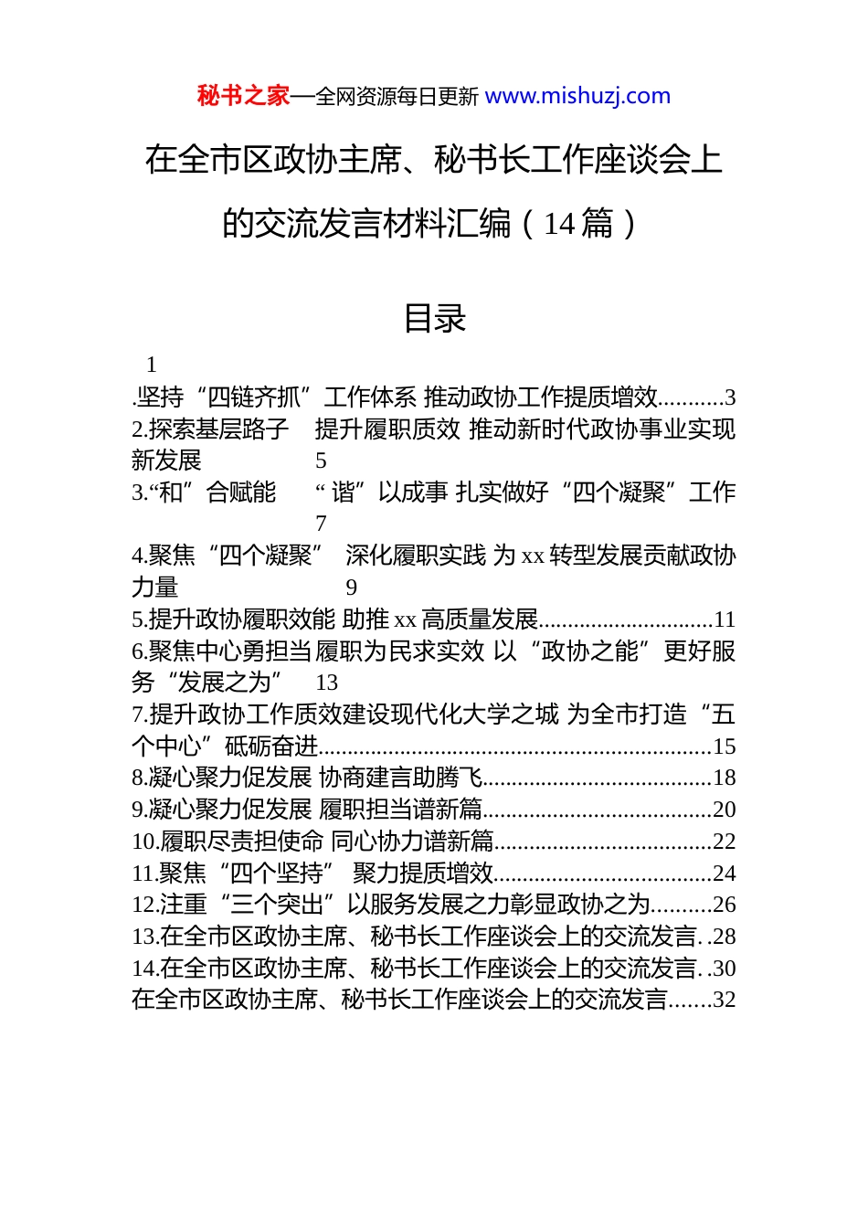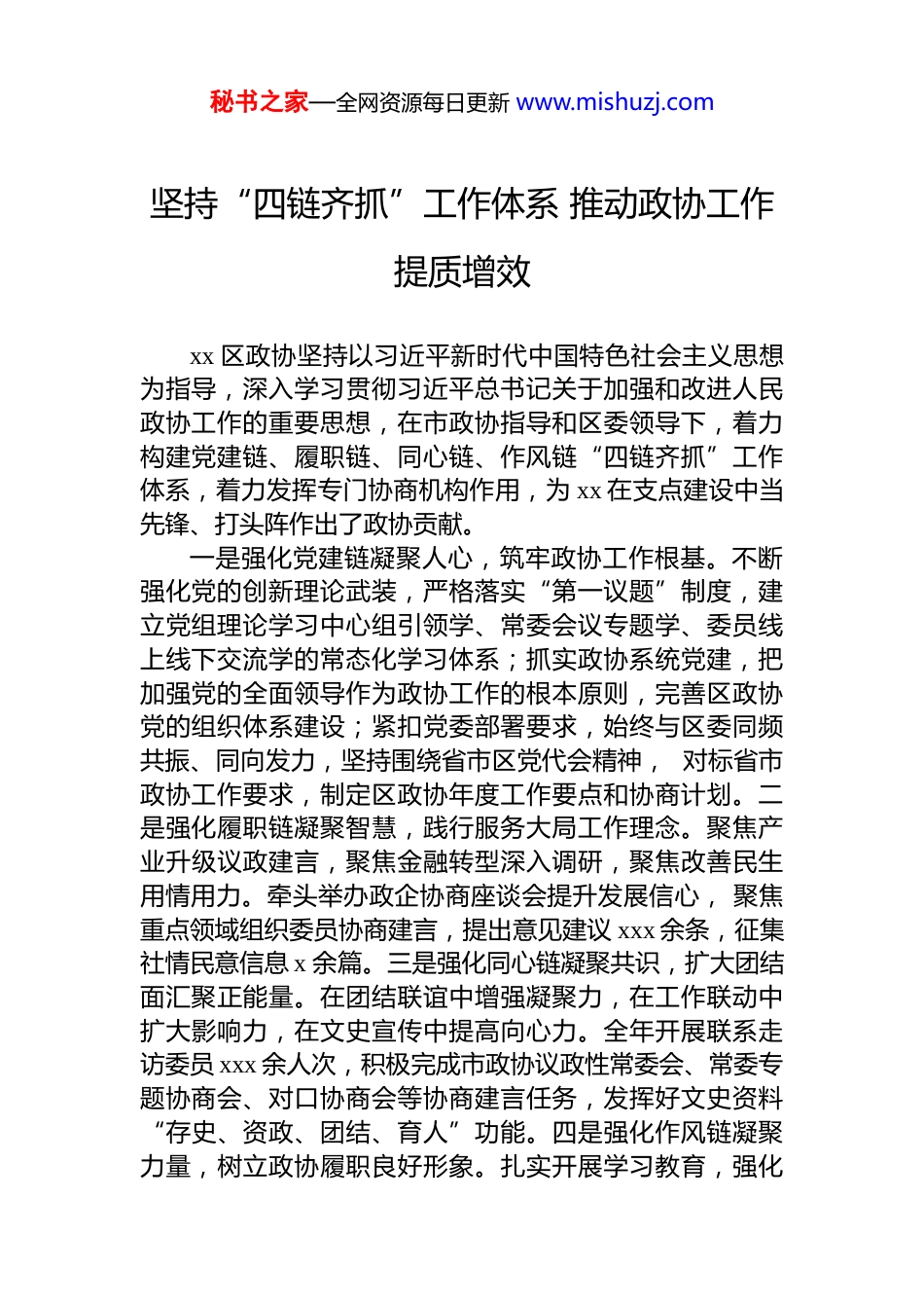 秘书之家—全网资源每日更新 www.mishuzj.com在全市区政协主席、秘书长工作座谈会上的交流发言材料汇编(14 篇)目录1.坚持“四链齐抓”工作体系 推动政协工作提质增效...........32.探索基层路子提升履职质效 推动新时代政协事业实现新发展53.“和”合赋能“ 谐”以成事 扎实做好“四个凝聚”工作74.聚焦“四个凝聚” 深化履职实践 为 xx 转型发展贡献政协力量95.提升政协履职效能 助推 xx 高质量发展..............................116.聚焦中心勇担当履职为民求实效 以“政协之能”更好服务“发展之为”137.提升政协工作质效建设现代化大学之城 为全市打造“五个中心”砥砺奋进...................................................................158.凝心聚力促发展 协商建言助腾飞.......................................189.凝心聚力促发展 履职担当谱新篇.......................................2010.履职尽责担使命 同心协力谱新篇.....................................2211.聚焦“四个坚持” 聚力提质增效.....................................2412.注重“三个突出”以服务发展之力彰显政协之为..........2613.在全市区政协主席、秘书长工作座谈会上的交流发言. .2814.在全市区政协主席、秘书长工作座谈会上的交流发言. .30在全市区政协主席、秘书长工作座谈会上的交流发言.......32秘书之家—全网资源每日更新 www.mishuzj.com坚持“四链齐抓”工作体系 推动政协工作提质增效xx 区政协坚持以习近平新时代中国特色社会主义思想为指导,深入学习贯彻习近平总书记关于加强和改进人民政协工作的重要思想,在市政协指导和区委领导下,着力构建党建链、履职链、同心链、作风链“四链齐抓”工作体系,着力发挥专门协商机构作用,为 xx 在支点建设中当先锋、打头阵作出了政协贡献。一是强化党建链凝聚人心,筑牢政协工作根基。不断强化党的创新理论武装,严格落实“第一议题”制度,建立党组理论学习中心组引领学、常委会议专题学、委员线上线下交流学的常态化学习体系;抓实政协系统党建,把加强党的全面领导作为政协工作的根本原则,完善区政协党的组织体系建设;紧扣党委部署要求,始终与区委同频共振、同向发力,坚持围绕省市区党代会精神, 对标省市政协工作要求,制定区政协年度工作要点和协商计划。二是强化履职链凝聚智慧,践行服务大局工作理念。聚焦产业升级议政建言,聚焦金融转型深入调研,聚焦改善民生用情用力。牵头举办政企协商座谈会提升发展信心, 聚焦重点领域组织委员协商建言,提出意见建议 xxx 余条,征集社情民意信息 x 余篇。三是强化同心链凝聚共识,扩大团结面汇聚正能量。在团结联谊中增强凝聚力,在工作联动中扩大影响力,在文史宣传中提高向心力。全年开展联系走访委员 xxx 余人次,积极完成市政协议政性常委会、常委专题协商会、对口协商会等协商建言任务,发挥好文史资料“存史、资政、团结、育人”功能。四是强化作风链凝聚力量,树立政协履职良好形象。扎实开展学习教育,强化秘书之家—全网资源每日更新 www.mishuzj.com委员履职能力,切实加强自身建设。 秘书之家—全网资源每日更新 www.mishuzj.com探索基层路子 提升履职质效 推动新时代政协事业实现新发展xx 区政协坚持以习近平新时代中国特色社会主义思想为指导,全面贯彻党的二十届三中、四中全会精神和习近平总书记在庆祝中国人民政治协商会议成立 75 周年大会上的重要讲话精神,深入开展政协“质效提升年”行动,更好发挥专门协商机构作用,为全力打造“五个中心”、努力建设现代化大 xx, xx 在支点建设中当标杆、走前列作出积极贡献。一是做好一件“头等大事”。将坚持和加强党的全面领导作为贯穿履职始终的“头等大事”,以制度化、机制化建设为保障,确保党的领导落到实处。坚持将党的领导贯穿到政协工作中,扎实开展深入贯彻中央八项规定精神学习教育,从严从实查摆问题,精准检视剖析,强化作风保障。持续深化政协委员功能型党支部融合建设,切实推动政协党建实现“两个全覆盖”。持续深化“书香政协”建设,强化政协自身建...