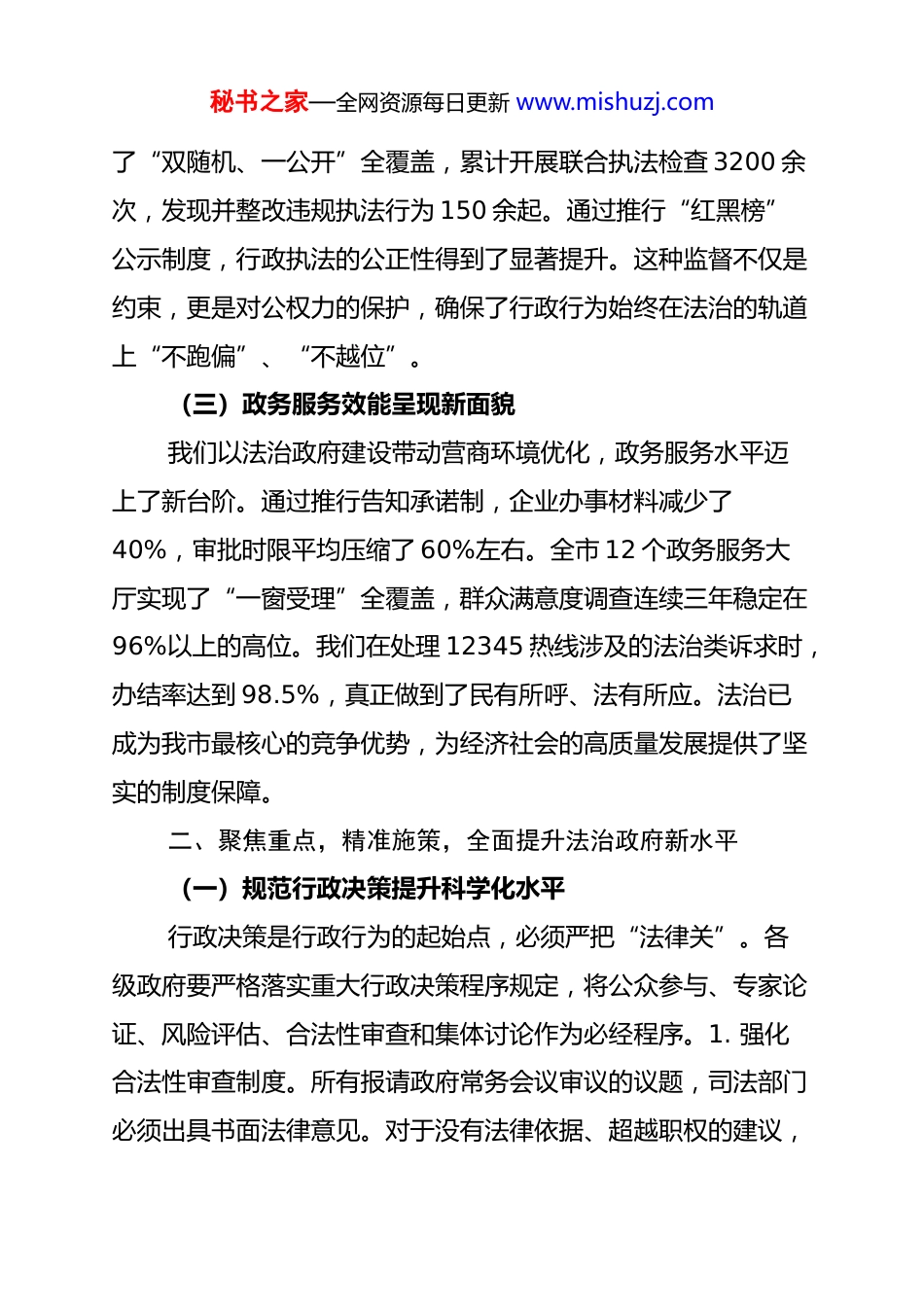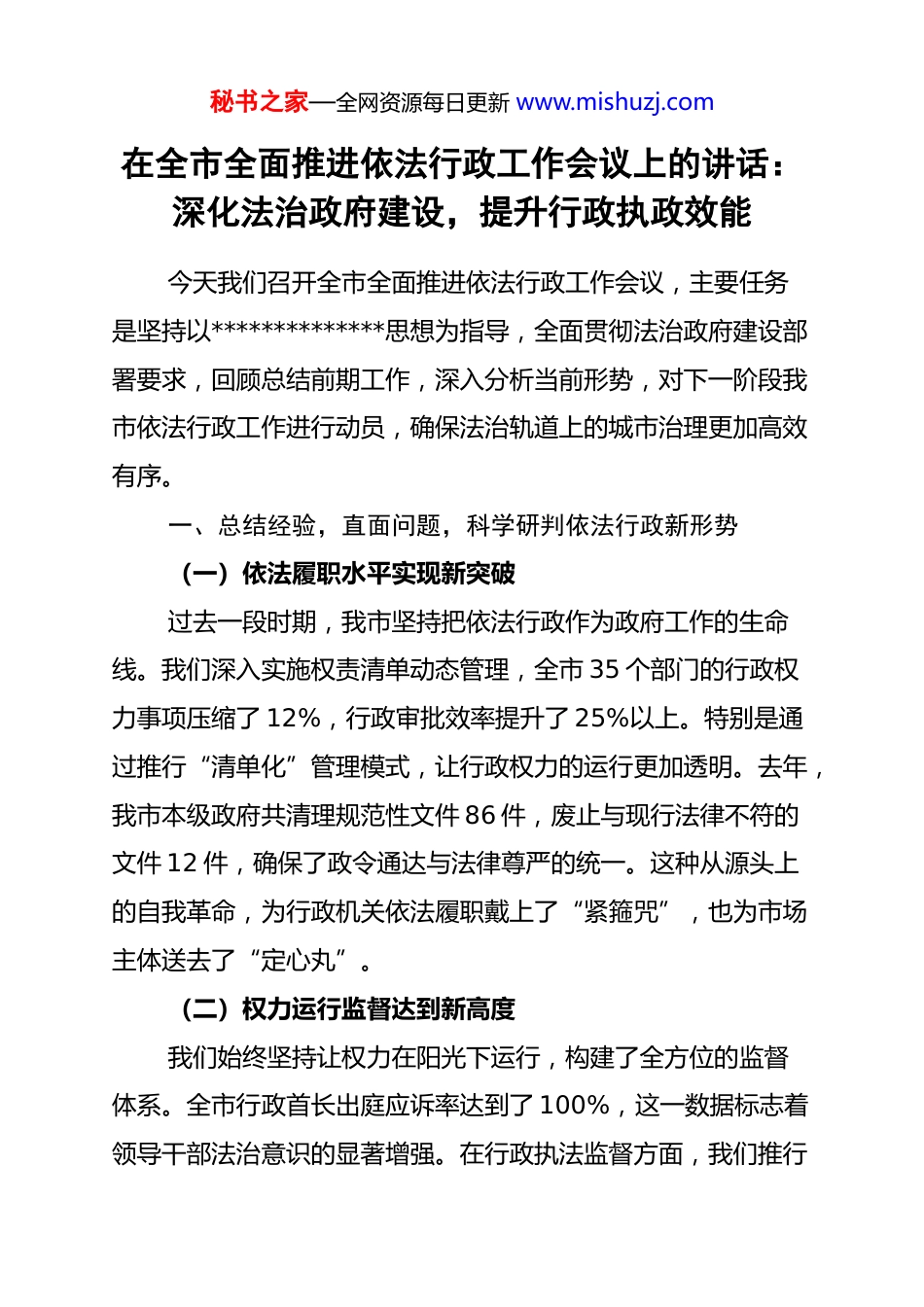 秘书之家—全网资源每日更新 www.mishuzj.com在全市全面推进依法行政工作会议上的讲话:深化法治政府建设,提升行政执政效能今天我们召开全市全面推进依法行政工作会议,主要任务是坚持以**************思想为指导,全面贯彻法治政府建设部署要求,回顾总结前期工作,深入分析当前形势,对下一阶段我市依法行政工作进行动员,确保法治轨道上的城市治理更加高效有序。一、总结经验,直面问题,科学研判依法行政新形势(一)依法履职水平实现新突破过去一段时期,我市坚持把依法行政作为政府工作的生命线。我们深入实施权责清单动态管理,全市 35 个部门的行政权力事项压缩了 12%,行政审批效率提升了 25%以上。特别是通过推行“清单化”管理模式,让行政权力的运行更加透明。去年,我市本级政府共清理规范性文件 86 件,废止与现行法律不符的文件 12 件,确保了政令通达与法律尊严的统一。这种从源头上的自我革命,为行政机关依法履职戴上了“紧箍咒”,也为市场主体送去了“定心丸”。(二)权力运行监督达到新高度我们始终坚持让权力在阳光下运行,构建了全方位的监督体系。全市行政首长出庭应诉率达到了 100%,这一数据标志着领导干部法治意识的显著增强。在行政执法监督方面,我们推行秘书之家—全网资源每日更新 www.mishuzj.com了“双随机、一公开”全覆盖,累计开展联合执法检查 3200 余次,发现并整改违规执法行为 150 余起。通过推行“红黑榜”公示制度,行政执法的公正性得到了显著提升。这种监督不仅是约束,更是对公权力的保护,确保了行政行为始终在法治的轨道上“不跑偏”、“不越位”。(三)政务服务效能呈现新面貌我们以法治政府建设带动营商环境优化,政务服务水平迈上了新台阶。通过推行告知承诺制,企业办事材料减少了40%,审批时限平均压缩了 60%左右。全市 12 个政务服务大厅实现了“一窗受理”全覆盖,群众满意度调查连续三年稳定在96%以上的高位。我们在处理 12345 热线涉及的法治类诉求时,办结率达到 98.5%,真正做到了民有所呼、法有所应。法治已成为我市最核心的竞争优势,为经济社会的高质量发展提供了坚实的制度保障。二、聚焦重点,精准施策,全面提升法治政府新水平(一)规范行政决策提升科学化水平行政决策是行政行为的起始点,必须严把“法律关”。各级政府要严格落实重大行政决策程序规定,将公众参与、专家论证、风险评估、合法性审查和集体讨论作为必经程序。1. 强化合法性审查制度。所有报请政府常务会议审议的议题,司法部门必须出具书面法律意见。对于没有法律依据、超越职权的建议,秘书之家—全网资源每日更新 www.mishuzj.com必须实行“一票否决”。2. 完善政府法律顾问制度。我们要从“有没有”转向“好不好”,让法律顾问在政策出台前进行深度参与,而不是在出事后“补漏洞”。去年法律顾问参与决策咨询400 余次,今年要进一步提高深度,让专业意见成为决策的“压舱石”。3. 建立决策后评估机制。针对已经实施的重大政策,要定期开展法治体检,发现问题及时修补,防止政策偏差带来的法治风险。(二)深化执法改革提升规范化水平行政执法是法治政府建设的“重头戏”,直接关系群众的获得感。首先,要全面推行行政执法三项制度。行政执法公示、全过程记录、合法性审核必须做到不留死角、不走过场。每一件执法案件都要有据可查、有影可看,让“暗箱操作”彻底失去空间。其次,要推进基层整合改革。针对基层执法力量分散、交叉管辖的问题,我们要大力推广“综合行政执法”模式,实现一支队伍管执法,解决“看得见的管不着、管得着的看不见”的难题。最后,要彰显执法温度。我们要大力推行“柔性执法”,完善容错免罚清单。对于初次违法、社会危害较小的行为,要多用提醒、告诫等手段,严禁“一刀切”式执法,让法治既有“力度”更有“温度”。(三)优化政务服务提升便利化水平我们要以法治思维破除体制机制障碍,在政务服务上“做秘书之家—全网资源每日更新 www.mishuzj.com减法”。一是要深化证照分离改革。要通过法律手段破除“准入不准营”的怪圈,进一步扩告知承诺制的适用范围。计划在年底前,再取消...
