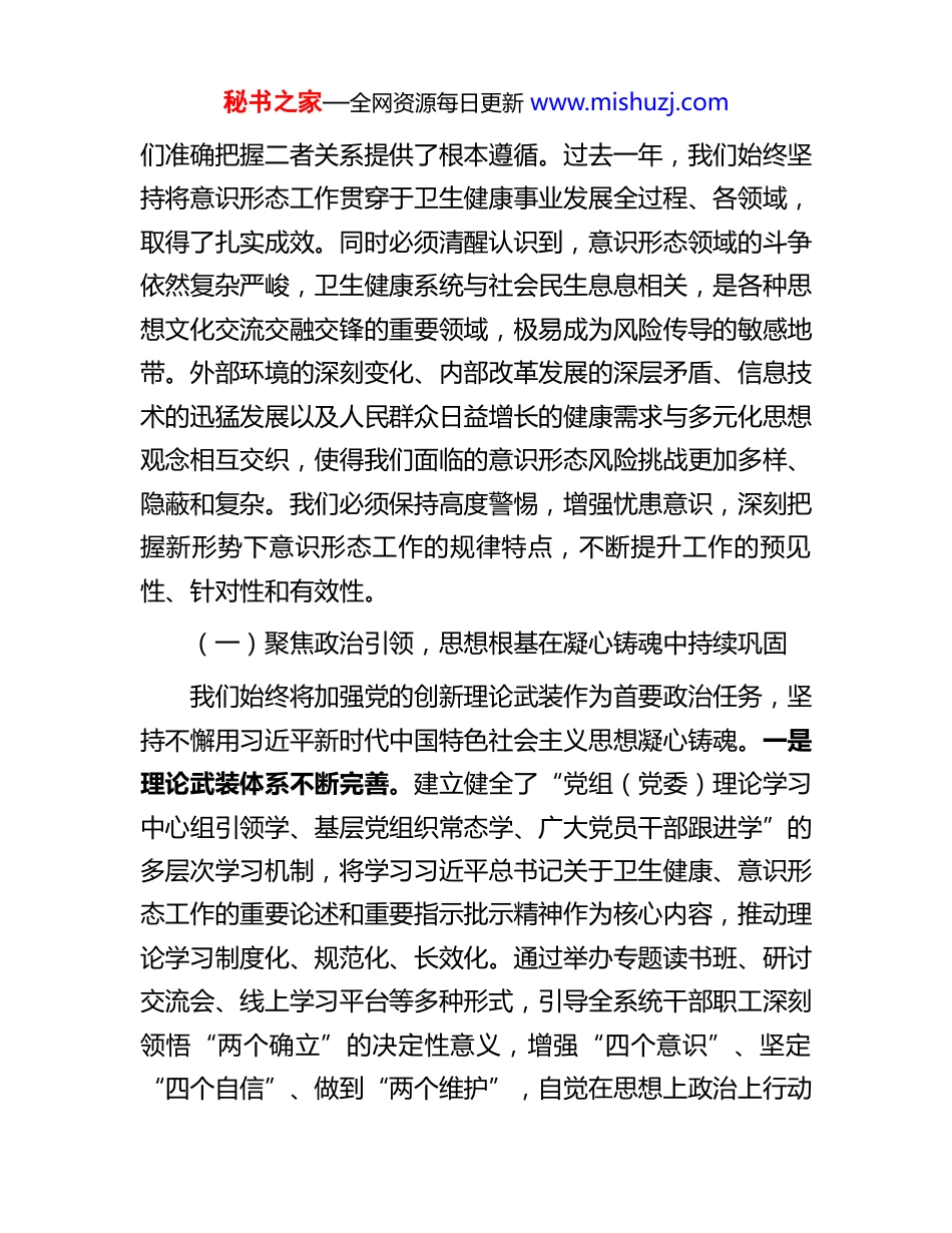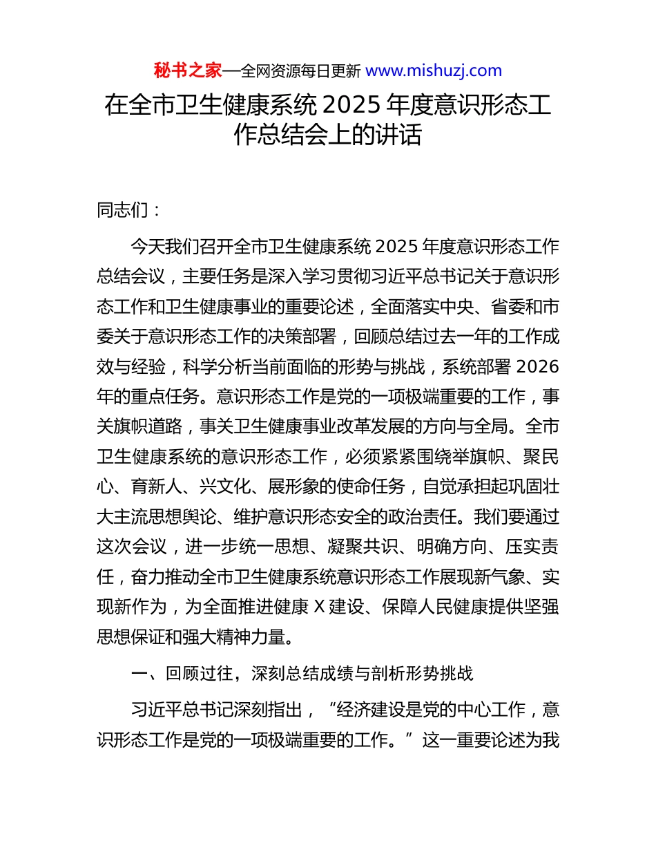 秘书之家—全网资源每日更新 www.mishuzj.com在全市卫生健康系统 2025 年度意识形态工作总结会上的讲话同志们:今天我们召开全市卫生健康系统 2025 年度意识形态工作总结会议,主要任务是深入学习贯彻习近平总书记关于意识形态工作和卫生健康事业的重要论述,全面落实中央、省委和市委关于意识形态工作的决策部署,回顾总结过去一年的工作成效与经验,科学分析当前面临的形势与挑战,系统部署 2026年的重点任务。意识形态工作是党的一项极端重要的工作,事关旗帜道路,事关卫生健康事业改革发展的方向与全局。全市卫生健康系统的意识形态工作,必须紧紧围绕举旗帜、聚民心、育新人、兴文化、展形象的使命任务,自觉承担起巩固壮大主流思想舆论、维护意识形态安全的政治责任。我们要通过这次会议,进一步统一思想、凝聚共识、明确方向、压实责任,奋力推动全市卫生健康系统意识形态工作展现新气象、实现新作为,为全面推进健康 X 建设、保障人民健康提供坚强思想保证和强大精神力量。一、回顾过往,深刻总结成绩与剖析形势挑战习近平总书记深刻指出,“经济建设是党的中心工作,意识形态工作是党的一项极端重要的工作。”这一重要论述为我秘书之家—全网资源每日更新 www.mishuzj.com们准确把握二者关系提供了根本遵循。过去一年,我们始终坚持将意识形态工作贯穿于卫生健康事业发展全过程、各领域,取得了扎实成效。同时必须清醒认识到,意识形态领域的斗争依然复杂严峻,卫生健康系统与社会民生息息相关,是各种思想文化交流交融交锋的重要领域,极易成为风险传导的敏感地带。外部环境的深刻变化、内部改革发展的深层矛盾、信息技术的迅猛发展以及人民群众日益增长的健康需求与多元化思想观念相互交织,使得我们面临的意识形态风险挑战更加多样、隐蔽和复杂。我们必须保持高度警惕,增强忧患意识,深刻把握新形势下意识形态工作的规律特点,不断提升工作的预见性、针对性和有效性。(一)聚焦政治引领,思想根基在凝心铸魂中持续巩固我们始终将加强党的创新理论武装作为首要政治任务,坚持不懈用习近平新时代中国特色社会主义思想凝心铸魂。一是理论武装体系不断完善。建立健全了“党组(党委)理论学习中心组引领学、基层党组织常态学、广大党员干部跟进学”的多层次学习机制,将学习习近平总书记关于卫生健康、意识形态工作的重要论述和重要指示批示精神作为核心内容,推动理论学习制度化、规范化、长效化。通过举办专题读书班、研讨交流会、线上学习平台等多种形式,引导全系统干部职工深刻领悟“两个确立”的决定性意义,增强“四个意识”、坚定“四个自信”、做到“两个维护”,自觉在思想上政治上行动秘书之家—全网资源每日更新 www.mishuzj.com上同党中央保持高度一致。全年组织开展各类专题学习研讨覆盖全系统各级党组织,党员干部参学率与学习实效性实现双提升。二是思想政治工作的针对性有效性显著增强。紧密结合卫生健康行业特点和干部职工思想实际,将思想政治工作融入日常管理、业务工作和队伍建设。围绕深化医药卫生体制改革、推进公立医院高质量发展、实施健康中国行动等中心任务,深入开展形势政策教育和职业精神培育,大力弘扬伟大抗疫精神和崇高职业精神,引导广大医务工作者坚定理想信念,践行初心使命,爱岗敬业奉献。针对重点人群、关键岗位,加强人文关怀和心理疏导,有效化解了改革进程中的思想疑虑和利益关切,凝聚了推动事业发展的广泛共识和强大合力。三是政治判断力、政治领悟力、政治执行力得到系统性锤炼。通过严肃党内政治生活,严明政治纪律和政治规矩,教育引导党员干部不断提高政治站位,善于从政治上看问题、想问题、作决策、办事情。在面对重大公共卫生事件、重大改革调整、重要政策出台等关键节点时,能够自觉站在党和国家工作大局、卫生健康事业发展全局的高度思考谋划,确保了中央、省委、市委的决策部署在全市卫生健康系统不折不扣落地生根,各项工作始终沿着正确的政治方向前进。(二)聚焦阵地管理,主流舆论在守正创新中不断壮大我们深刻认识到,“过不了互联网这一关,就过不了长期执政这一关。”一是宣传舆论主阵地建设迈...