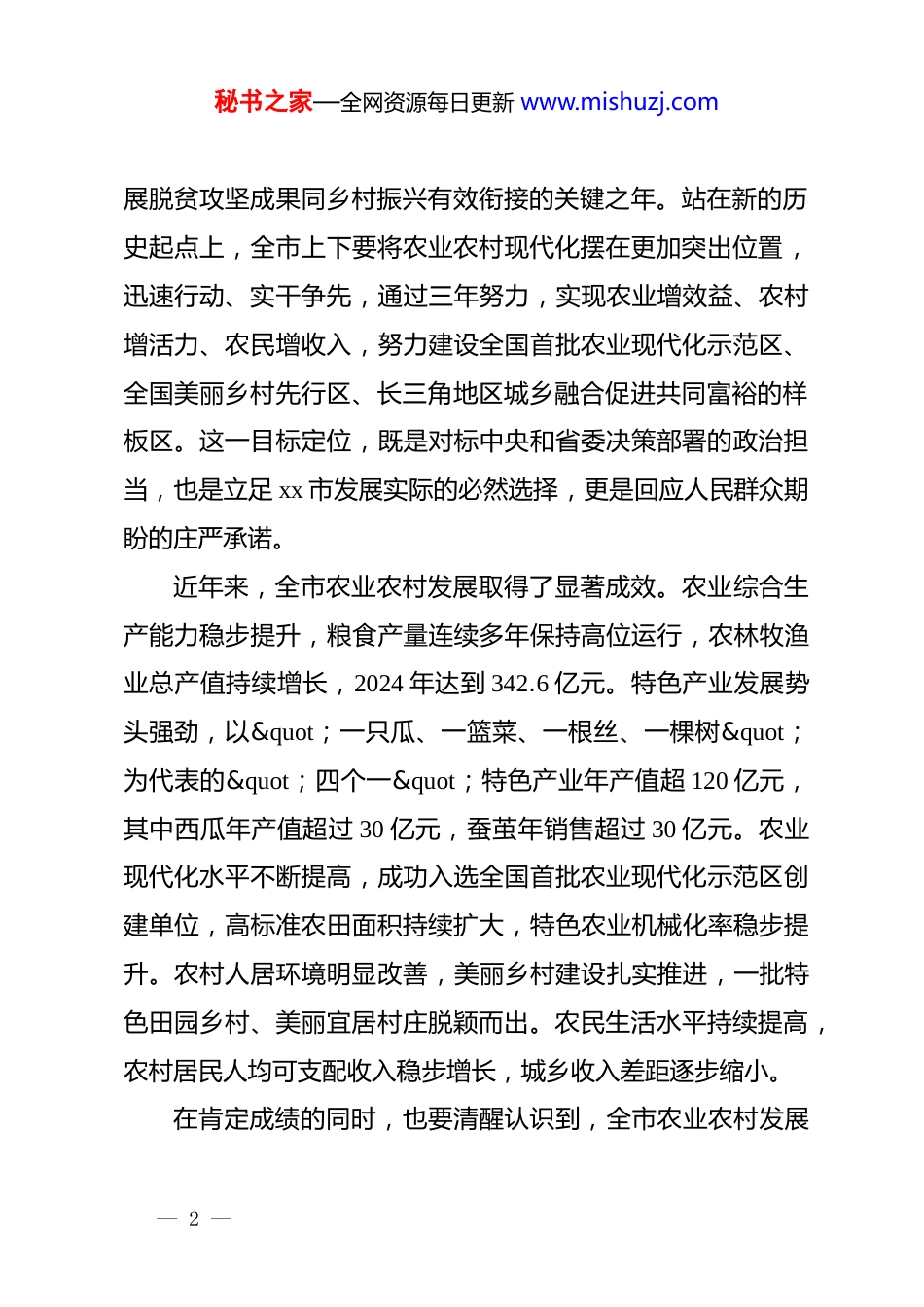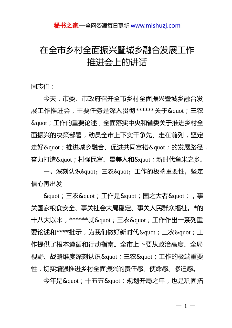 秘书之家—全网资源每日更新 www.mishuzj.com在全市乡村全面振兴暨城乡融合发展工作推进会上的讲话同志们:今天,市委、市政府召开全市乡村全面振兴暨城乡融合发展工作推进会,主要任务是深入贯彻******关于";三农";工作的重要论述,全面落实中央和省委关于推进乡村全面振兴的决策部署,动员全市上下实干争先、走在前列,坚定走好";推进城乡融合、促进共同富裕";的发展路径,奋力打造";村强民富、景美人和";新时代鱼米之乡。一、深刻认识";三农";工作的极端重要性,坚定信心再出发";三农";工作是";国之大者";,事关国家粮食安全、事关社会大局稳定、事关人民群众福祉。*的十八大以来,******就";三农";工作作出一系列重要论述和****批示,为我们做好新时代";三农";工作提供了根本遵循和行动指南。全市上下要从政治高度、全局视野、战略维度深刻认识";三农";工作的极端重要性,切实增强推进乡村全面振兴的责任感、使命感、紧迫感。今年是";十五五";规划开局之年,也是巩固拓— 1 —秘书之家—全网资源每日更新 www.mishuzj.com展脱贫攻坚成果同乡村振兴有效衔接的关键之年。站在新的历史起点上,全市上下要将农业农村现代化摆在更加突出位置,迅速行动、实干争先,通过三年努力,实现农业增效益、农村增活力、农民增收入,努力建设全国首批农业现代化示范区、全国美丽乡村先行区、长三角地区城乡融合促进共同富裕的样板区。这一目标定位,既是对标中央和省委决策部署的政治担当,也是立足 xx 市发展实际的必然选择,更是回应人民群众期盼的庄严承诺。近年来,全市农业农村发展取得了显著成效。农业综合生产能力稳步提升,粮食产量连续多年保持高位运行,农林牧渔业总产值持续增长,2024 年达到 342.6 亿元。特色产业发展势头强劲,以";一只瓜、一篮菜、一根丝、一棵树";为代表的";四个一";特色产业年产值超 120 亿元,其中西瓜年产值超过 30 亿元,蚕茧年销售超过 30 亿元。农业现代化水平不断提高,成功入选全国首批农业现代化示范区创建单位,高标准农田面积持续扩大,特色农业机械化率稳步提升。农村人居环境明显改善,美丽乡村建设扎实推进,一批特色田园乡村、美丽宜居村庄脱颖而出。农民生活水平持续提高,农村居民人均可支配收入稳步增长,城乡收入差距逐步缩小。在肯定成绩的同时,也要清醒认识到,全市农业农村发展— 2 —秘书之家—全网资源每日更新 www.mishuzj.com还存在一些短板和不足。农业产业化水平有待进一步提升,农产品精深加工能力不强,产业链条延伸不够。农村基础设施和公共服务与城市相比仍有差距,城乡融合发展体制机制还需健全。农村人才流失问题依然突出,新型职业农民培育力度需要加大。村级集体经济发展不平衡,部分村集体经济收入来源单一、增收渠道有限。对于这些问题,必须高度重视,采取有力措施切实加以解决。二、牢牢把握现代农业这个强市之基,乘势而上创优势现代农业是强市之基、富民之本。要坚持优土优种优产优储优销";五优";联动,注重现代化种植,全面提升农业质量效益和竞争力。优土是基础。要严格落实耕地保护制度,坚决遏制耕地";非农化";、防止";非粮化";,确保粮食播种面积稳定。大力推进高标准农田建设,持续提升耕地质量,到 2025 年全市高标准农田面积突破 160 万亩。加强土壤改良和地力培肥,推广测土配方施肥、有机肥替代化肥等技术,提升土壤有机质含量和综合生产能力。优种是关键。种子是农业的";芯片";。要加强种质资源保护利用,建设种质资源库和良种繁育基地。深化与科研院所合作,引进培育一批优质、高产、抗病的新品种。目— 3 —秘书之家—全网资源每日更新 www.mishuzj.com前全市已拥有 9 个国家地理标志农产品、100 余个绿色有机农产品,要继续加大品牌培育力度,提升农产品附加值和市场竞争力。优产是核心。要深入推进农业结构调整,优化产业布局,发展壮大特色优势产业。巩固提升粮食生产功能区建设,稳定粮食综合...