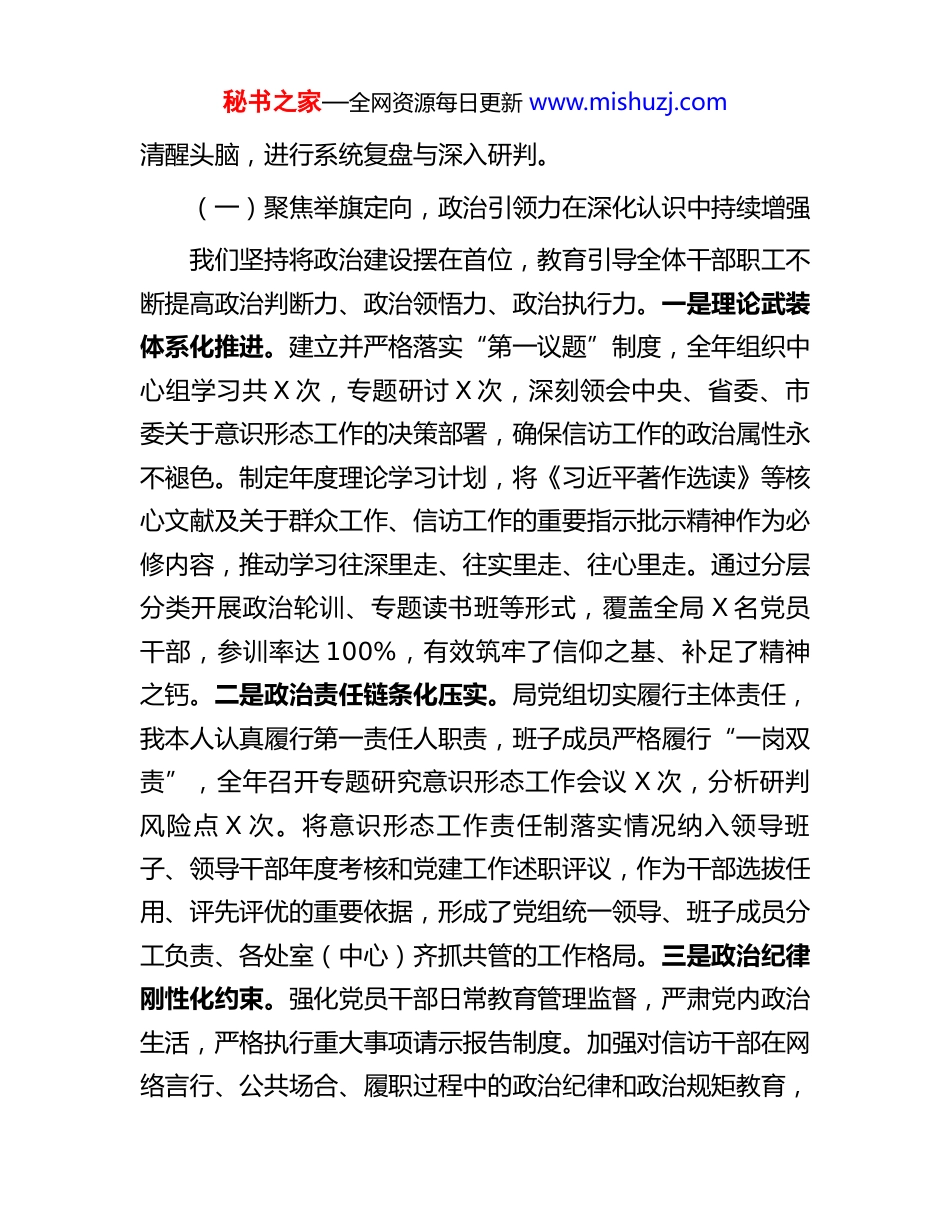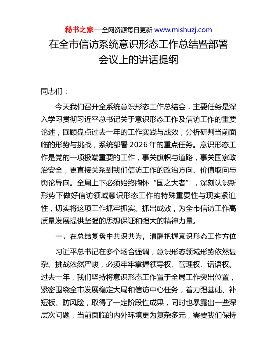 秘书之家—全网资源每日更新 www.mishuzj.com在全市信访系统意识形态工作总结暨部署会议上的讲话提纲同志们:今天我们召开全系统意识形态工作总结会,主要任务是深入学习贯彻习近平总书记关于意识形态工作及信访工作的重要论述,回顾盘点过去一年的工作实践与成效,分析研判当前面临的形势与挑战,系统部署 2026 年的重点任务。意识形态工作是党的一项极端重要的工作,事关旗帜与道路,事关国家政治安全,更直接关系到我们信访工作的政治方向、价值取向与舆论导向。全局上下必须始终胸怀“国之大者”,深刻认识新形势下做好信访领域意识形态工作的特殊重要性与现实紧迫性,切实将这项工作抓牢抓实、抓出成效,为全市信访工作高质量发展提供坚强的思想保证和强大的精神力量。一、在总结复盘中共识共为,清醒把握意识形态工作方位习近平总书记在多个场合强调,意识形态领域形势依然复杂、挑战依然严峻,必须牢牢掌握领导权、管理权、话语权。过去一年,我们坚持将意识形态工作置于全局工作突出位置,紧密围绕全市发展稳定大局和信访中心任务,着力强基础、补短板、防风险,取得了一定阶段性成果,同时也暴露出一些深层次问题,当前面临的内外环境更为复杂多元,需要我们保持秘书之家—全网资源每日更新 www.mishuzj.com清醒头脑,进行系统复盘与深入研判。(一)聚焦举旗定向,政治引领力在深化认识中持续增强我们坚持将政治建设摆在首位,教育引导全体干部职工不断提高政治判断力、政治领悟力、政治执行力。一是理论武装体系化推进。建立并严格落实“第一议题”制度,全年组织中心组学习共 X 次,专题研讨 X 次,深刻领会中央、省委、市委关于意识形态工作的决策部署,确保信访工作的政治属性永不褪色。制定年度理论学习计划,将《习近平著作选读》等核心文献及关于群众工作、信访工作的重要指示批示精神作为必修内容,推动学习往深里走、往实里走、往心里走。通过分层分类开展政治轮训、专题读书班等形式,覆盖全局 X 名党员干部,参训率达 100%,有效筑牢了信仰之基、补足了精神之钙。二是政治责任链条化压实。局党组切实履行主体责任,我本人认真履行第一责任人职责,班子成员严格履行“一岗双责”,全年召开专题研究意识形态工作会议 X 次,分析研判风险点 X 次。将意识形态工作责任制落实情况纳入领导班子、领导干部年度考核和党建工作述职评议,作为干部选拔任用、评先评优的重要依据,形成了党组统一领导、班子成员分工负责、各处室(中心)齐抓共管的工作格局。三是政治纪律刚性化约束。强化党员干部日常教育管理监督,严肃党内政治生活,严格执行重大事项请示报告制度。加强对信访干部在网络言行、公共场合、履职过程中的政治纪律和政治规矩教育,秘书之家—全网资源每日更新 www.mishuzj.com引导大家自觉在思想上政治上行动上同党中央保持高度一致,坚决反对和抵制各种错误思潮和负面言论,确保信访队伍绝对忠诚、绝对纯洁、绝对可靠。(二)聚焦凝心铸魂,理论武装力在守正创新中有效提升我们深知“思想上的统一是党的团结统一最深厚最持久最可靠的保证”,持续在理论武装的广度、深度和效度上下功夫。一是学习载体融合拓展。在坚持“三会一课”、主题党日等传统阵地基础上,积极运用“学习强国”平台、X 干部网络学院等线上资源,搭建“指尖课堂”。结合信访工作实际,创办“信访讲堂”“青年理论研习社”等特色载体,邀请专家学者、业务骨干、先进典型授课宣讲 X 场,增强了理论学习的吸引力和感染力。鼓励党员干部撰写学习心得、调研报告 X篇,促进学思用贯通。二是宣传阐释精准发力。围绕《信访工作条例》贯彻实施周年、重要时间节点等,组织开展系列主题宣传活动 X 次,制作宣传品 X 份,深入解读党的路线方针政策,特别是涉及民生保障、权益维护等方面的政策法规,将党的主张转化为社会共识。注重运用群众语言和鲜活案例,在接访窗口、官方网站、微信公众号等平台,主动设置议题,讲好党领导下的信访故事,传播信访工作正能量,全年发布原创宣传信息 X 条,阅读量超 X 万人次。三是价值引领贯穿全程。将社会主义核心价值观培育融入信...