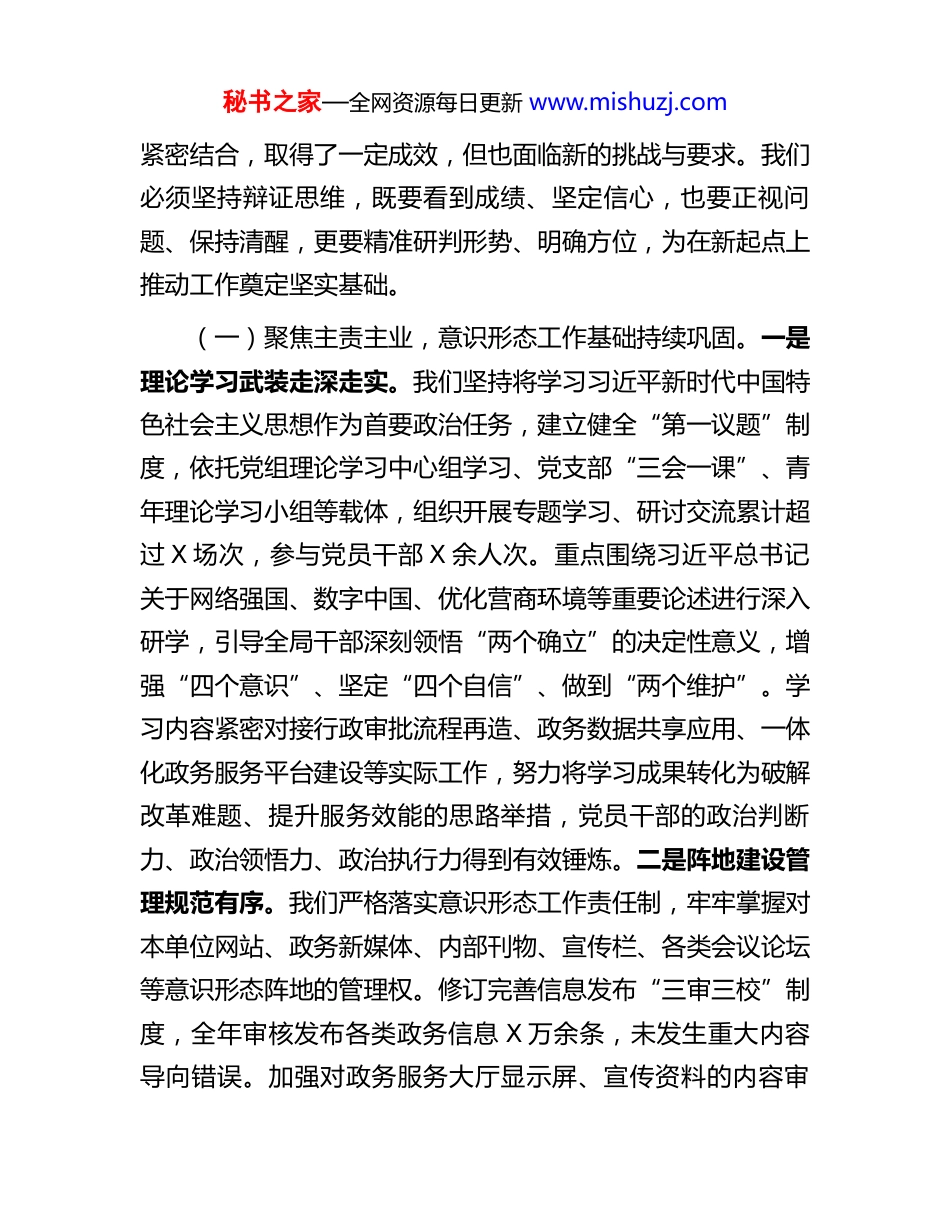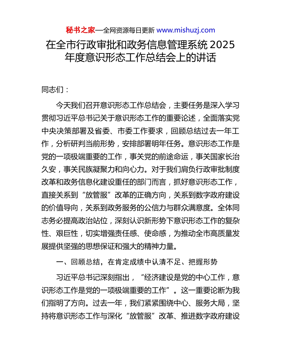 秘书之家—全网资源每日更新 www.mishuzj.com在全市行政审批和政务信息管理系统 2025年度意识形态工作总结会上的讲话同志们:今天我们召开意识形态工作总结会,主要任务是深入学习贯彻习近平总书记关于意识形态工作的重要论述,全面落实党中央决策部署及省委、市委工作要求,回顾总结过去一年工作,分析研判当前形势,安排部署明年任务。意识形态工作是党的一项极端重要的工作,事关党的前途命运,事关国家长治久安,事关民族凝聚力和向心力。对于我们肩负行政审批制度改革和政务信息化建设重任的部门而言,抓好意识形态工作,直接关系到“放管服”改革的正确方向,关系到数字政府建设的价值导向,关系到政务服务的公信力与群众满意度。全体同志务必提高政治站位,深刻认识新形势下意识形态工作的复杂性、艰巨性,切实增强责任感、使命感,为推动全市高质量发展提供坚强的思想保证和强大的精神力量。一、回顾总结,在肯定成绩中认清不足、把握形势习近平总书记深刻指出,“经济建设是党的中心工作,意识形态工作是党的一项极端重要的工作”。这一重要论断为我们指明了方向。过去一年,我们紧紧围绕中心、服务大局,坚持将意识形态工作与深化“放管服”改革、推进数字政府建设秘书之家—全网资源每日更新 www.mishuzj.com紧密结合,取得了一定成效,但也面临新的挑战与要求。我们必须坚持辩证思维,既要看到成绩、坚定信心,也要正视问题、保持清醒,更要精准研判形势、明确方位,为在新起点上推动工作奠定坚实基础。(一)聚焦主责主业,意识形态工作基础持续巩固。一是理论学习武装走深走实。我们坚持将学习习近平新时代中国特色社会主义思想作为首要政治任务,建立健全“第一议题”制度,依托党组理论学习中心组学习、党支部“三会一课”、青年理论学习小组等载体,组织开展专题学习、研讨交流累计超过 X 场次,参与党员干部 X 余人次。重点围绕习近平总书记关于网络强国、数字中国、优化营商环境等重要论述进行深入研学,引导全局干部深刻领悟“两个确立”的决定性意义,增强“四个意识”、坚定“四个自信”、做到“两个维护”。学习内容紧密对接行政审批流程再造、政务数据共享应用、一体化政务服务平台建设等实际工作,努力将学习成果转化为破解改革难题、提升服务效能的思路举措,党员干部的政治判断力、政治领悟力、政治执行力得到有效锤炼。二是阵地建设管理规范有序。我们严格落实意识形态工作责任制,牢牢掌握对本单位网站、政务新媒体、内部刊物、宣传栏、各类会议论坛等意识形态阵地的管理权。修订完善信息发布“三审三校”制度,全年审核发布各类政务信息 X 万余条,未发生重大内容导向错误。加强对政务服务大厅显示屏、宣传资料的内容审秘书之家—全网资源每日更新 www.mishuzj.com核,确保传播主流价值。密切关注涉及行政审批、政务服务领域的网络舆情,建立常态化监测预警和联动处置机制,全年稳妥处置潜在风险舆情 X 起,有效维护了政府公信力和部门形象。在推动政务数据开放共享过程中,始终坚持安全可控原则,加强数据安全和个人信息保护,防范数据滥用带来的意识形态风险。三是队伍思想动态稳定向好。我们坚持严管与厚爱结合,激励与约束并重,常态化开展党员干部思想状况分析研判,通过谈心谈话、座谈调研、民主生活会等方式,及时掌握干部思想动态,针对性做好思想政治工作。结合党纪学习教育,加强理想信念教育、廉政警示教育,引导干部筑牢拒腐防变的思想防线,树立正确的权力观、政绩观、事业观。大力弘扬“店小二”精神和“马上办”作风,评选表彰服务标兵、改革先锋,激发干部队伍干事创业的内生动力。全局干部职工精神状态积极向上,围绕优化营商环境、提升政务服务满意度等中心工作履职尽责、担当作为的氛围更加浓厚。(二)坚持问题导向,深刻剖析工作短板与薄弱环节习近平总书记强调,“要有强烈的问题意识,以重大问题为导向,抓住关键问题进一步研究思考,着力推动解决我国发展面临的一系列突出矛盾和问题”。对照更高标准和要求,我们的意识形态工作仍存在一些亟待改进的短板。一是理论联系实际的深度有待加强。部分学习研讨与行政...