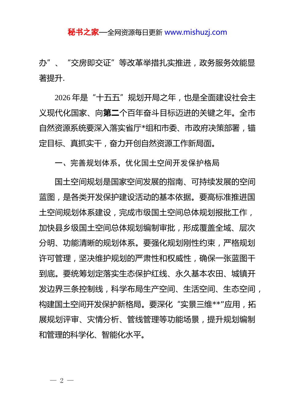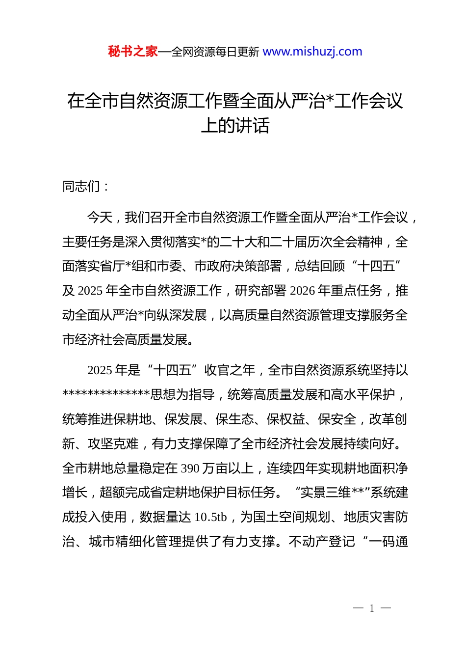 秘书之家—全网资源每日更新 www.mishuzj.com在全市自然资源工作暨全面从严治*工作会议上的讲话同志们:今天,我们召开全市自然资源工作暨全面从严治*工作会议,主要任务是深入贯彻落实*的二十大和二十届历次全会精神,全面落实省厅*组和市委、市政府决策部署,总结回顾“十四五”及 2025 年全市自然资源工作,研究部署 2026 年重点任务,推动全面从严治*向纵深发展,以高质量自然资源管理支撑服务全市经济社会高质量发展。2025 年是“十四五”收官之年,全市自然资源系统坚持以**************思想为指导,统筹高质量发展和高水平保护,统筹推进保耕地、保发展、保生态、保权益、保安全,改革创新、攻坚克难,有力支撑保障了全市经济社会发展持续向好。全市耕地总量稳定在 390 万亩以上,连续四年实现耕地面积净增长,超额完成省定耕地保护目标任务。“实景三维**”系统建成投入使用,数据量达 10.5tb,为国土空间规划、地质灾害防治、城市精细化管理提供了有力支撑。不动产登记“一码通— 1 —秘书之家—全网资源每日更新 www.mishuzj.com办”、“交房即交证”等改革举措扎实推进,政务服务效能显著提升.2026 年是“十五五”规划开局之年,也是全面建设社会主义现代化国家、向第二个百年奋斗目标迈进的关键之年。全市自然资源系统要深入落实省厅*组和市委、市政府决策部署,锚定目标、真抓实干,奋力开创自然资源工作新局面。一、完善规划体系,优化国土空间开发保护格局国土空间规划是国家空间发展的指南、可持续发展的空间蓝图,是各类开发保护建设活动的基本依据。要高标准推进国土空间规划体系建设,完成市级国土空间总体规划报批工作,加快县乡级国土空间总体规划编制审批,形成覆盖全域、层次分明、功能清晰的规划体系。要强化规划刚性约束,严格规划许可管理,坚决维护规划的严肃性和权威性,确保一张蓝图干到底。要统筹划定落实生态保护红线、永久基本农田、城镇开发边界三条控制线,科学布局生产空间、生活空间、生态空间,构建国土空间开发保护新格局。要深化“实景三维**”应用,拓展规划评审、灾情分析、管线管理等功能场景,提升规划编制和管理的科学化、智能化水平。— 2 —秘书之家—全网资源每日更新 www.mishuzj.com二、强化耕地保护,扛稳粮食安全政治责任耕地是粮食生产的命根子,耕地保护事关国家粮食安全和社会稳定大局。要深入贯彻落实******关于耕地保护的****批示精神,坚决扛起耕地保护政治责任,落实最严格的耕地保护制度。要严格执行耕地保有量和永久基本农田保护任务,确保全市耕地保有量不低于 367.70 万亩、永久基本农田不低于325.28 万亩。要深化“大耕保”工作格局,全面落实田长制,健全耕地保护责任链条,完善周调度、月排名、季奖惩工作机制。要严厉打击非法占用耕地、破坏基本农田等违法违规行为,保持“零容忍”高压态势,坚决遏制耕地“非农化”、严格管控“非粮化”。要加强耕地质量建设,推进高标准农田建设,提升耕地综合生产能力,夯实粮食安全根基。三、强化要素保障,支撑经济高质量发展土地要素是经济社会发展的重要支撑,要强化土地要素保障能力,推动资源要素向重大项目、重点产业、重要领域集聚。要精准配置土地资源,优先保障重大基础设施、重点产业项目、重要民生工程用地需求,提高土地资源配置效率。要深化土地要素市场化配置改革,健全土地要素交易平台,完善土地价格形成机制,促进土地资源优化配置。要优化审批流程,压缩审— 3 —秘书之家—全网资源每日更新 www.mishuzj.com批时限,提高审批效率,推动项目早落地、早开工、早见效。要积极服务油地融合发展,保障能源资源开发用地需求,推动油地合作走深走实。四、坚持节约集约,筑牢绿色发展屏障节约集约用地是转变经济发展方式、推动高质量发展的必然要求。要牢固树立节约集约用地理念,严格执行建设用地标准,提高土地利用效率。要深入推进存量土地盘活利用,加快处置批而未供和闲置土地,推动低效用地再开发,释放土地利用潜力。要健全土地节约集约利用评价考核机制,将节约集约用地纳入政府目标考核体系,形成奖优罚劣的激励约束机制。要坚...