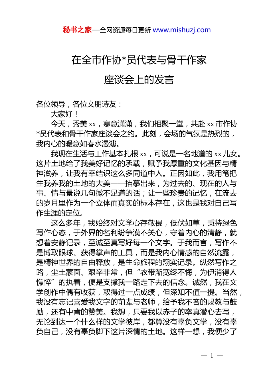 秘书之家—全网资源每日更新 www.mishuzj.com在全市作协*员代表与骨干作家座谈会上的发言各位领导,各位文朋诗友:大家好!今天,秀美 xx,寒意潇潇,我们相聚一堂,共赴 xx 市作协*员代表和骨干作家座谈会之约。此刻,会场的气氛是热烈的,我内心的暖意如春水漫漶。我现在生活与工作基本扎根 xx,可说是一名地道的 xx 儿女。这片土地给了我美好记忆的承载,赋予我厚重的文化基因与精神滋养,让我有幸结识这么多同道中人。正因如此,我用笔把生我养我的土地的大美一一描摹出来,为过去的、现在的人与事、情与景说几句微不足道的话;让一些珍贵的记忆,在流去的岁月里作为一个立体而真实的标本存在,这也是我对自己写作生涯的定位。这么多年,我始终对文学心存敬畏,低伏如草,秉持绿色写作心态,于外界的名利纷争漠不关心,守着内心的清静,就想着安静记录,至诚至真写好每一个文字。于我而言,写作不是博取眼球、获得掌声的工具,而是我内心情感的自然流露,是精神世界的自由释放,是生命旅程的翔实记录。纵然写作之路,尘土蒙面、艰辛非常,但“衣带渐宽终不悔,为伊消得人憔悴”的执着,便是支撑我一路走下去的信念。诚然,我在文学创作中偶有收获,取得过一点成绩,但深知不值一提。当然,我没有忘记喜爱我文字的前辈与老师,给予我不吝的赐教与鼓励,还有中肯的赞美。我想,只要我以赤子的率真潜心去写,无论到达一个什么样的文学彼岸,都算没有辜负文学,没有辜负自己,没有辜负脚下这片深情的土地。这样一想,我便少了— 1 —秘书之家—全网资源每日更新 www.mishuzj.com许多名利缠绕的烦恼,得以在文学的世界从容前行。这是一个多元而浮躁的时代,特别是当下 ai 技术的普及,作为一种写作辅助工具,它的确成文便利,立等可取,不可否认的是,它所生成的内容僵硬刻板、华而不实,无温度、无真心、少灵魂,走马观花的拼接,一眼假。因而,自 ai 出现以来,很多人借此滋生惰性,也有很多人发出”文学已死“”写作面临灭顶之灾“的喟叹,但我不大认同这样的观点。我的写作初心单纯而简单,骨子里,我始终是一个守本分、重真情的写作者。我坚信,无论 ai 冲击多么大,它永远无法替代一个真正意义上的写作者内心深处最真挚的情感表达,无法复制每一个生命个体独有的生活激情与人文思考。写作,本质上无非是有话要说,就要写;水喝多了,就要上厕所。哪怕写得不好,表达不够完美,每一个文字,都承载着我们自己的思想与温度,有着独属于自己的文化标签与精神印记。不过,不得不承认,每个人有自己写作的方式,有他选择的权利和自由,我并无任何将自己的观点强加于人、或者作为对立面的想法,也不可能阻挡 ai 技术发展的时代趋势。“两句三年得,一吟泪双流”的坚守,字斟句酌的苦闷与灵感乍现的欢悦,那种杜鹃泣血般的创作情怀,唯有亲历者才能体悟;也唯有原始、纯粹的创作方式,才是多么的弥足珍贵。说了这么多,归根结底,感谢此次文联座谈会的召开。感谢 xx 等人的邀请。我无比珍视今天与各位相聚的时光,珍视这份因文学而生的缘分,珍视与各位同行的情谊。愿我们往后携手并肩,牢记文学创作者的责任和使命,春蚕吐丝一样,将自己的心血注入文学的远征;愿我们用朴素的笔、赤诚的心,给xx 立传、为时代放歌,书写 xx 的时代风流与秀色华章,助力xx 作协绽放更耀眼的光彩;更愿在座的每一位文朋诗友,在写作路上步履不停,抵达属于自己的文学彼岸,收获自己的创作荣光。— 2 —秘书之家—全网资源每日更新 www.mishuzj.com最后,提前给大家拜个早年,祝大家身体康健,事事顺遂佳作频出!— 3 —