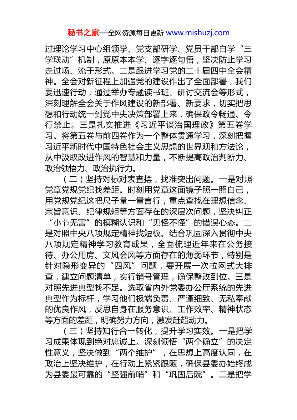 秘书之家—全网资源每日更新 www.mishuzj.com在全县领导干部加强党的作风建设专题研讨会上的交流发言同志们: 作风建设关乎党的形象,关乎人心向背,更关乎事业成败。2026 年作为“十五五”规划开局之年,站在新的历史起点上,面对改革发展稳定繁重任务,县委办公室必须以更高标准、更严要求、更实举措,在作风建设上走在前、作表率。近期,通过深入研读《习近平谈治国理政》第五卷、系统学习《关于加强党的作风建设论述摘编》以及重温《党政机关厉行节约反对浪费条例》,结合县委办工作实际,我深刻认识到,作风建设不仅是一场攻坚战,更是一场持久战,必须保持定力,寸步不让。下面,我围绕“深学细悟强根基、严守规矩树新风、担当实干促发展”三个方面,与大家交流几点体会和思考。 一、 提高政治站位,在深学细悟中筑牢作风建设思想根基 县委办作为全县运转的中枢,岗位特殊、责任重大,必须把讲政治摆在首位,将理论武装作为加强作风建设的“第一道工序”。我们要把学习贯彻党的二十届四中全会精神作为当前和今后一个时期的重要政治任务,与巩固深入贯彻中央八项规定精神学习教育成果紧密结合,在学懂弄通做实上下功夫,切实把学习成果转化为改进作风的强大动力。 (一)坚持读原著学原文,把准政治方向。一是深学细悟习近平总书记关于作风建设的重要论述。我们要把《关于加强党的作风建设论述摘编》作为案头卷、枕边书,反复研读,深刻领会“作风建设永远在路上”的深邃内涵,准确把握“四风”问题的顽固性、反复性特征。通秘书之家—全网资源每日更新 www.mishuzj.com过理论学习中心组领学、党支部研学、党员干部自学“三学联动”机制,原原本本学、逐字逐句悟,坚决防止学习走过场、流于形式。二是跟进学习党的二十届四中全会精神。全会对新征程上加强党的建设作出了全面部署,我们要迅速行动,通过举办专题读书班、研讨交流会等形式,深刻理解全会关于作风建设的新部署、新要求,切实把思想和行动统一到党中央决策部署上来,确保政令畅通、令行禁止。三是扎实推进《习近平谈治国理政》第五卷学习。将第五卷与前四卷作为一个整体贯通学习,深刻把握习近平新时代中国特色社会主义思想的世界观和方法论,从中汲取改进作风的智慧和力量,不断提高政治判断力、政治领悟力、政治执行力。 (二)坚持对标对表查摆,找准突出问题。一是对照党章党规党纪找差距。时刻用党章这面镜子照一照自己,用党规党纪这把尺子量一量言行,重点查找在理想信念、宗旨意识、纪律规矩等方面存在的深层次问题,坚决纠正“小节无害”的模糊认识和“见怪不怪”的错误心态。二是对照中央八项规定精神找短板。结合巩固深入贯彻中央八项规定精神学习教育成果,全面梳理近年来在公务接待、办公用房、文风会风等方面存在的薄弱环节,特别是针对隐形变异的“四风”问题,要开展一次拉网式大排查,建立问题清单,实行销号管理,确保整改到位。三是对照先进典型找不足。选取省内外党委办公厅系统的先进典型作为标杆,学习他们极端负责、严谨细致、无私奉献的优良作风,反思自身在服务意识、工作效率、精神状态等方面的差距,明确努力方向,激发赶超动力。 (三)坚持知行合一转化,提升学习实效。一是把学习成果体现到绝对忠诚上。深刻领悟“两个确立”的决定性意义,坚决做到“两个维护”,在思想上高度认同,在政治上坚决维护,在行动上紧紧跟随,确保县委办始终成为县委最可靠的“坚强前哨”和“巩固后院”。二是把学秘书之家—全网资源每日更新 www.mishuzj.com习成果体现到党性修养上。通过学习《党政机关厉行节约反对浪费条例》,牢固树立过“紧日子”思想,带头弘扬艰苦奋斗、勤俭节约的优良传统,坚决抵制享乐主义和奢靡之风,在细照笃行中修炼共产党人的“心学”。三是把学习成果体现到工作实践中。坚持学以致用、用以促学,将作风建设的要求融入到“三服务”工作全过程,把学习成效转化为解决实际问题的能力,转化为推动“十五五”规划开局起步的具体行动,确保学有所获、干有所成。 二、 严守纪律规矩,在正风肃纪中涵养风清气正政治生态 作风建设的核心是保持党同人民群众的血肉联...