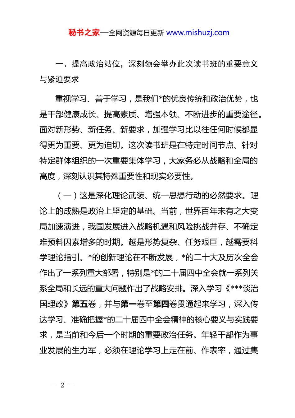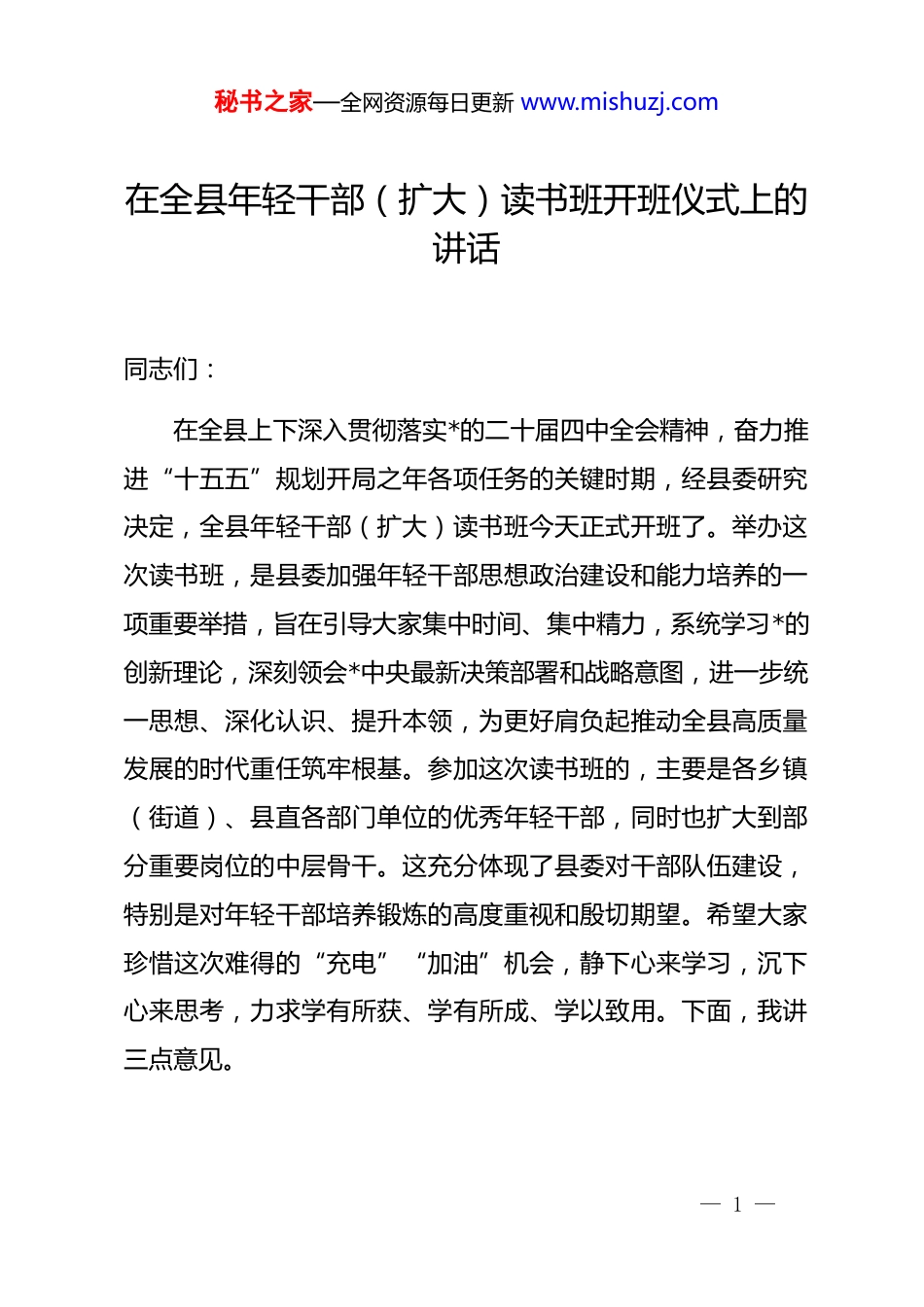 秘书之家—全网资源每日更新 www.mishuzj.com在全县年轻干部(扩大)读书班开班仪式上的讲话同志们:在全县上下深入贯彻落实*的二十届四中全会精神,奋力推进“十五五”规划开局之年各项任务的关键时期,经县委研究决定,全县年轻干部(扩大)读书班今天正式开班了。举办这次读书班,是县委加强年轻干部思想政治建设和能力培养的一项重要举措,旨在引导大家集中时间、集中精力,系统学习*的创新理论,深刻领会*中央最新决策部署和战略意图,进一步统一思想、深化认识、提升本领,为更好肩负起推动全县高质量发展的时代重任筑牢根基。参加这次读书班的,主要是各乡镇(街道)、县直各部门单位的优秀年轻干部,同时也扩大到部分重要岗位的中层骨干。这充分体现了县委对干部队伍建设,特别是对年轻干部培养锻炼的高度重视和殷切期望。希望大家珍惜这次难得的“充电”“加油”机会,静下心来学习,沉下心来思考,力求学有所获、学有所成、学以致用。下面,我讲三点意见。— 1 —秘书之家—全网资源每日更新 www.mishuzj.com一、提高政治站位,深刻领会举办此次读书班的重要意义与紧迫要求重视学习、善于学习,是我们*的优良传统和政治优势,也是干部健康成长、提高素质、增强本领、不断进步的重要途径。面对新形势、新任务、新要求,加强学习比以往任何时候都显得更为重要、更为迫切。这次读书班是在特定时间节点、针对特定群体组织的一次重要集体学习,大家务必从战略和全局的高度,深刻认识其特殊重要性和现实必要性。(一)这是深化理论武装、统一思想行动的必然要求。理论上的成熟是政治上坚定的基础。当前,世界百年未有之大变局加速演进,我国发展进入战略机遇和风险挑战并存、不确定难预料因素增多的时期。越是形势复杂、任务艰巨,越需要科学理论指引。*的创新理论在不断发展,*的二十大及历次全会作出了一系列重大部署,特别是*的二十届四中全会就一系列关系全局和长远的重大问题作出了战略安排。深入学习《***谈治国理政》第五卷,并与第一卷至第四卷贯通起来学习,深入传达学习、准确把握*的二十届四中全会精神的核心要义与实践要求,是当前和今后一个时期的重要政治任务。年轻干部作为事业发展的生力军,必须在理论学习上走在前、作表率,通过集— 2 —秘书之家—全网资源每日更新 www.mishuzj.com中系统学习,深刻领悟“两个确立”的决定性意义,坚决做到“两个维护”的实践要求,不断增进对*的创新理论的政治认同、思想认同、理论认同、情感认同,真正把学习成果转化为坚定的理想信念和正确的行动自觉,确保全县各项工作始终沿着正确方向前进。(二)这是把握发展大势、提升履职能力的现实需要。“十五五”时期是开启全面建设社会主义现代化国家新征程、向第二个百年奋斗目标进军的关键五年。2026 年作为开局之年,各项工作头绪多、任务重、挑战大。我县既面临区域竞争加剧、转型升级压力增大、资源环境约束趋紧等共性挑战,也面临自身发展不平衡不充分、产业结构有待优化、民生领域尚有短板等个性问题。破解发展难题,厚植发展优势,迫切需要一支高素质专业化的干部队伍,特别是思维活跃、富有闯劲的年轻干部队伍。读书班不仅安排政治理论学习,也结合我县实际,围绕经济发展、乡村振兴、社会治理、风险防范等领域设置专题,目的就是帮助大家跳出局部看全局,立足当前谋长远,准确把握新发展阶段、深入贯彻新发展理念、服务构建新发展格局的内在要求,全面提升适应新时代、实现新目标、落实新部署的专业素养和履职能力,更好地在“十五五”开局起步中展现新— 3 —秘书之家—全网资源每日更新 www.mishuzj.com作为、作出新贡献。(三)这是锤炼过硬作风、强化自我革命的重要抓手。干部的*性修养、道德水平、作风形象,不会随着*龄工龄的增长而自然提高,也不会随着职务的升迁而自然提升,必须持续强化自我修炼、自我约束、自我改造。年轻干部处于成长发展的关键期,世界观、人生观、价值观的塑造成型期,面对的考验和诱惑不少。近年来,县委持续深化作风建设,取得积极成效,但“四风”问题具有顽固性反复性,稍有松懈就可能反弹回潮。此次读书班安排学习《...