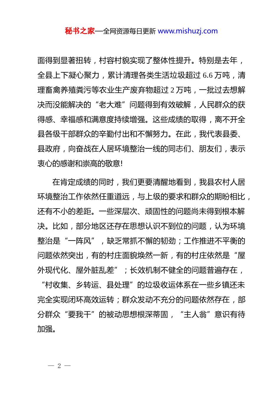 秘书之家—全网资源每日更新 www.mishuzj.com在全县农村人居环境整治工作推进会议暨冬季决战工作动员会上的讲话同志们:今天,我们在这里召开全县农村人居环境整治工作推进会议暨冬季决战工作动员会,主要任务是深入贯彻落实中央和省、市关于改善农村人居环境的决策部署,总结前一阶段工作,分析当前面临的形势和挑战,并对即将开展的“冬季决战行动”进行全面动员和部署。刚才,会议传达了省市关于农村环境净化整治“冬季决战行动”的通知精神,解读了我县的工作方案,并对垃圾转运等具体工作作了周密安排,我都完全同意。下面,我讲几点意见。一、统一思想,提高站位,深刻认识农村人居环境整治工作的极端重要性和现实紧迫性农村人居环境整治,是事关广大农民群众根本福祉的重大民生工程,是实施乡村振兴战略的第一场硬仗,也是我们必须坚决扛起的政治责任。近年来,县委、县政府始终将这项工作摆在突出位置,持续投入、强力推进,全县农村“脏乱差”局— 1 —秘书之家—全网资源每日更新 www.mishuzj.com面得到显著扭转,村容村貌实现了整体性提升。特别是去年,全县上下凝心聚力,累计清理各类生活垃圾超过 6.6 万吨,清理畜禽养殖粪污等农业生产废弃物超过 2 万吨,一批过去想解决而没能解决的“老大难”问题得到有效破解,人民群众的获得感、幸福感和满意度持续增强。这些成绩的取得,离不开全县各级干部群众的辛勤付出和不懈努力。在此,我代表县委、县政府,向奋战在人居环境整治一线的同志们、朋友们,表示衷心的感谢和崇高的敬意!在肯定成绩的同时,我们更要清醒地看到,我县农村人居环境整治工作依然任重道远,与上级的要求和群众的期盼相比,还有不小的差距。一些深层次、顽固性的问题尚未得到根本解决。比如,部分地区还存在思想认识不到位的问题,认为环境整治是“一阵风”,缺乏常抓不懈的韧劲;工作推进不平衡的问题依然突出,有的村庄面貌焕然一新,有的村庄依然是“屋外现代化、屋外脏乱差”;长效机制不健全的问题普遍存在,“村收集、乡转运、县处理”的垃圾收运体系在一些乡镇还未完全实现闭环高效运转;群众发动不充分的问题依然存在,部分群众“要我干”的被动思想根深蒂固,“主人翁”意识有待加强。— 2 —秘书之家—全网资源每日更新 www.mishuzj.com全县总人口约 44 万,其中农村常住人口超过 24 万,农村人居环境的好坏,直接关系到全县一半以上人口的生活品质,直接影响着我县乡村振兴的成色和全面小康的质量。我们必须认识到,抓好农村人居环境整治,不是一道“选择题”,而是一道必须答好的“必答题”;不是一项阶段性任务,而是一项需要常抓不懈的系统性工程。全县各级各部门必须站在讲政治、惠民生、促发展的高度,切实把思想和行动统一到县委、县政府的决策部署上来,以“等不起”的紧迫感、“慢不得”的危机感、“坐不住”的责任感,发起“冬季决战”,推动我县农村人居环境实现根本性、持久性的改善。二、聚焦重点,精准发力,以决战决胜之势坚决打赢冬季环境整治攻坚战冬季是农村生产生活的相对空闲期,也是开展环境整治、清除积存垃圾、解决突出问题的黄金期。这次“冬季决战行动”,就是要利用好这个关键窗口期,集中时间、集中力量,打一场声势浩大的歼灭战。各乡镇场街、各相关部门要对照工作方案,聚焦薄弱环节,采取超常举措,确保取得实实在在的成效。第一,要以“清仓见底”为目标,彻底清除存量垃圾。要— 3 —秘书之家—全网资源每日更新 www.mishuzj.com立即组织开展一次“横向到边、纵向到底”的全覆盖、拉网式大排查,重点聚焦村庄内外、房前屋后、田间地头、河塘沟渠等区域的积存生活垃圾、建筑垃圾、农业生产废弃物。要建立“盲区死角台账”,明确具体位置、垃圾类型、责任单位和清理时限,实行销号管理。对于排查出的问题,要立行立改,迅速组织力量进行清理。同时,要建立定期巡查回访机制,坚决防止问题反弹回潮,真正做到发现一处、清理一处、巩固一处,彻底消除环境整治的短板和死角。第二,要以“闭环高效”为核心,健全完善收运体系。垃圾治理,“收”是基础,“运”是关键。各乡镇要立足本地实际,...