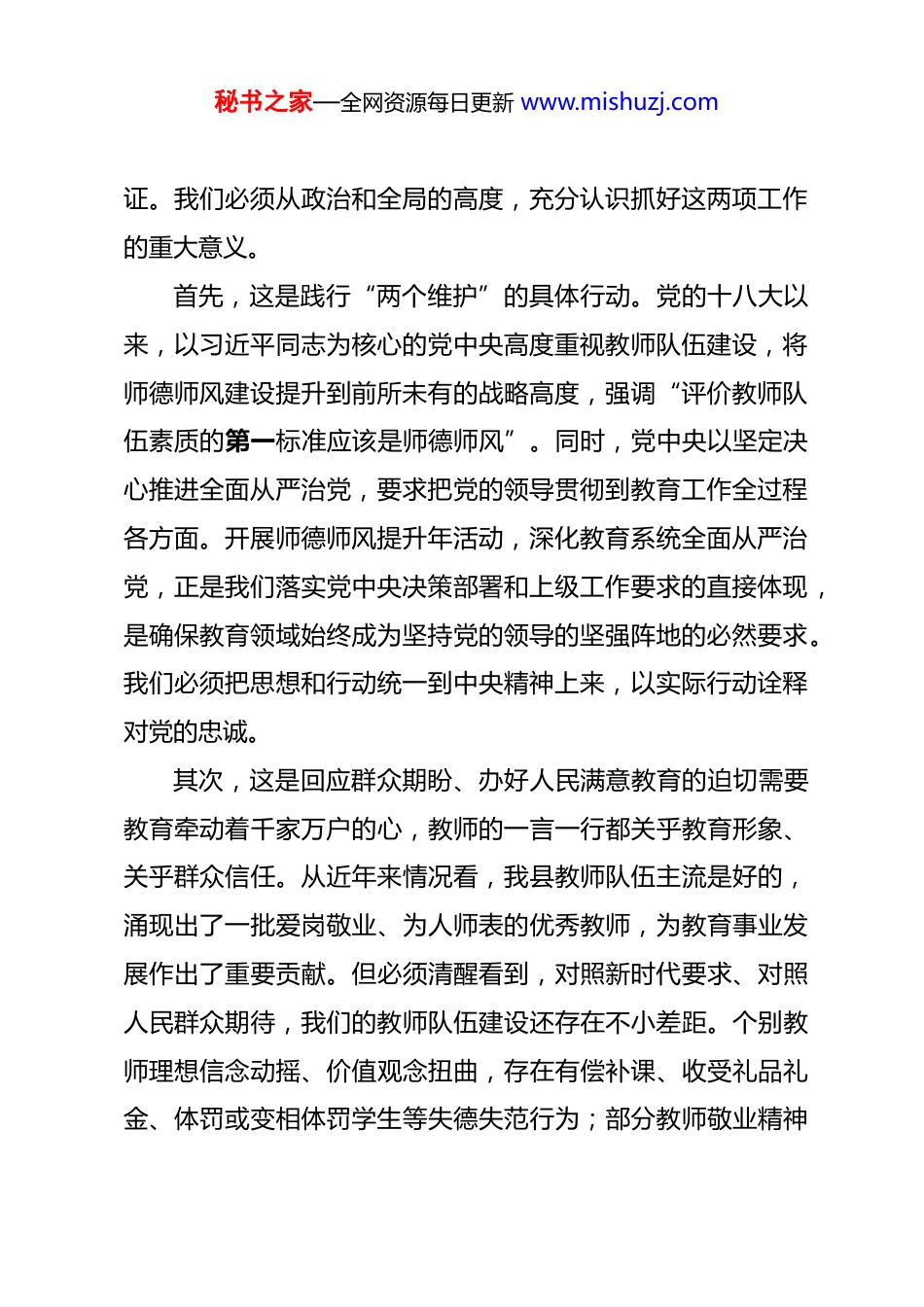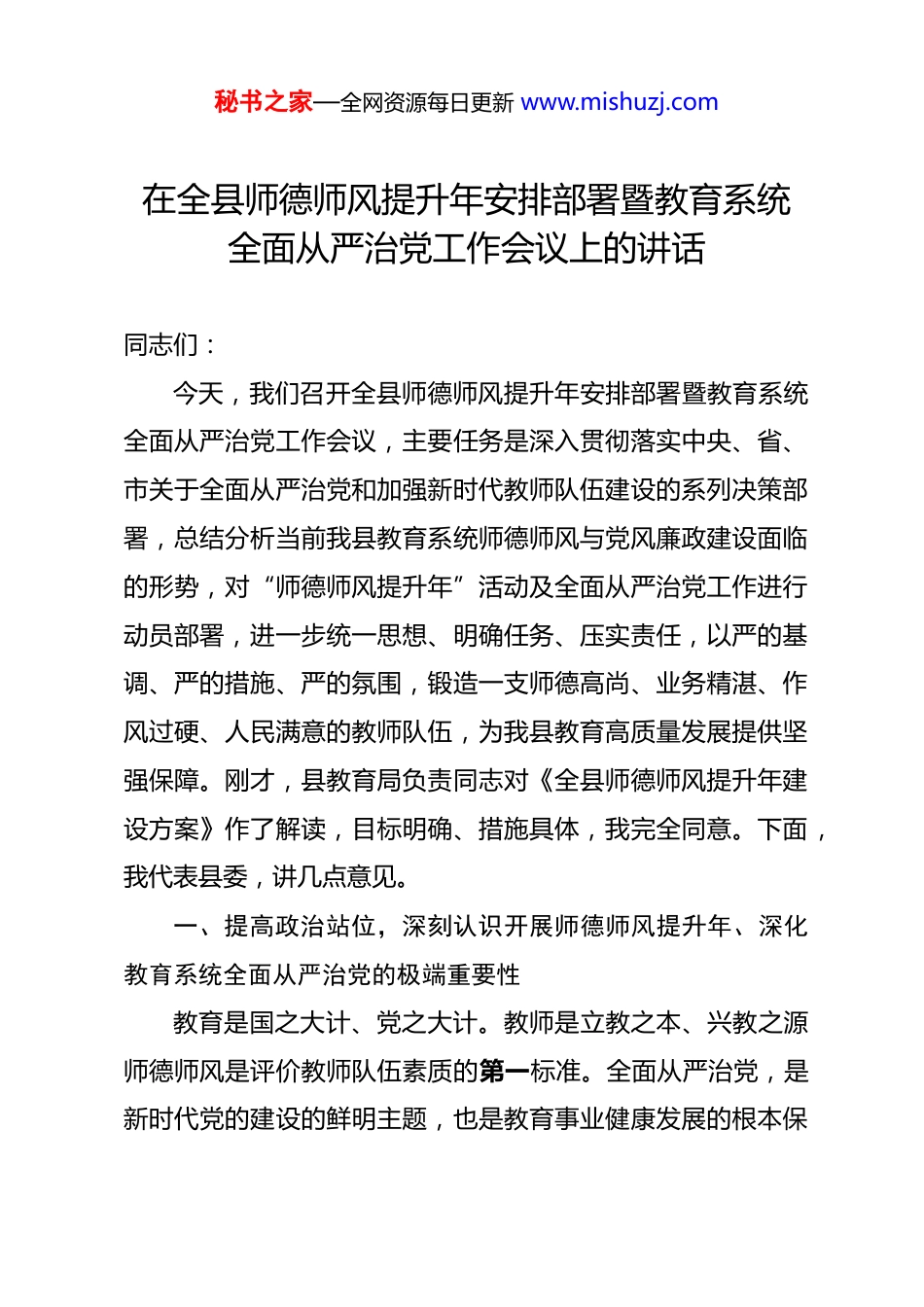 秘书之家—全网资源每日更新 www.mishuzj.com在全县师德师风提升年安排部署暨教育系统全面从严治党工作会议上的讲话 同志们:今天,我们召开全县师德师风提升年安排部署暨教育系统全面从严治党工作会议,主要任务是深入贯彻落实中央、省、市关于全面从严治党和加强新时代教师队伍建设的系列决策部署,总结分析当前我县教育系统师德师风与党风廉政建设面临的形势,对“师德师风提升年”活动及全面从严治党工作进行动员部署,进一步统一思想、明确任务、压实责任,以严的基调、严的措施、严的氛围,锻造一支师德高尚、业务精湛、作风过硬、人民满意的教师队伍,为我县教育高质量发展提供坚强保障。刚才,县教育局负责同志对《全县师德师风提升年建设方案》作了解读,目标明确、措施具体,我完全同意。下面,我代表县委,讲几点意见。一、提高政治站位,深刻认识开展师德师风提升年、深化教育系统全面从严治党的极端重要性教育是国之大计、党之大计。教师是立教之本、兴教之源师德师风是评价教师队伍素质的第一标准。全面从严治党,是新时代党的建设的鲜明主题,也是教育事业健康发展的根本保秘书之家—全网资源每日更新 www.mishuzj.com证。我们必须从政治和全局的高度,充分认识抓好这两项工作的重大意义。首先,这是践行“两个维护”的具体行动。党的十八大以来,以习近平同志为核心的党中央高度重视教师队伍建设,将师德师风建设提升到前所未有的战略高度,强调“评价教师队伍素质的第一标准应该是师德师风”。同时,党中央以坚定决心推进全面从严治党,要求把党的领导贯彻到教育工作全过程各方面。开展师德师风提升年活动,深化教育系统全面从严治党,正是我们落实党中央决策部署和上级工作要求的直接体现,是确保教育领域始终成为坚持党的领导的坚强阵地的必然要求。我们必须把思想和行动统一到中央精神上来,以实际行动诠释对党的忠诚。其次,这是回应群众期盼、办好人民满意教育的迫切需要教育牵动着千家万户的心,教师的一言一行都关乎教育形象、关乎群众信任。从近年来情况看,我县教师队伍主流是好的,涌现出了一批爱岗敬业、为人师表的优秀教师,为教育事业发展作出了重要贡献。但必须清醒看到,对照新时代要求、对照人民群众期待,我们的教师队伍建设还存在不小差距。个别教师理想信念动摇、价值观念扭曲,存在有偿补课、收受礼品礼金、体罚或变相体罚学生等失德失范行为;部分教师敬业精神秘书之家—全网资源每日更新 www.mishuzj.com不强,存在“庸懒散”问题;一些学校在师德师风建设上认识不到位、措施不得力,存在“温差”“落差”。这些问题虽然发生在少数人身上,但损害的是教师队伍的整体形象,侵蚀的是教育的公信力,群众意见很大。我们必须正视问题、刀刃向内,以刮骨疗毒的勇气进行整治,真正把教育这件民生大事办到群众心坎上。再次,这是优化教育生态、推动教育高质量发展的内在要求。当前,我县正处在加快建设教育强县的关键时期。高质量的教育,离不开高质量的教师队伍;风清气正的教育生态,是教育事业蓬勃发展的土壤。师德师风不正,教育质量就无从谈起;全面从严治党不力,教育发展就会失去保障。我们必须深刻认识到,师德师风问题和党风廉政问题,本质上都是作风问题,都是对教育生态的破坏。开展提升年活动,深化从严治党,就是要正本清源、激浊扬清,清除阻碍教育发展的“绊脚石”,为教育教学活动创造良好安全保障,为推动教育工作高质量发展提供坚强政治保证和作风保障。二、坚持问题导向,准确把握师德师风提升年活动的重点任务《全县师德师风提升年建设方案》已经明确了目标、措施和步骤,关键在于抓落实。我们要聚焦突出问题,精准发力,秘书之家—全网资源每日更新 www.mishuzj.com确保活动取得实实在在的成效。第一,要狠抓思想教育,筑牢师德师风根基。思想是行动的先导。要将以案明纪、反躬自省作为重要方法。近年来,全国各地乃至我们周边地区,教师体罚学生、学术不端、违规补课、酒驾赌博等案例时有通报,教训极其深刻。各学校要高度重视,用好这些反面教材,深入开展警示教育,让每一位教职工知敬畏、存戒惧、守底线。要巩固拓展...