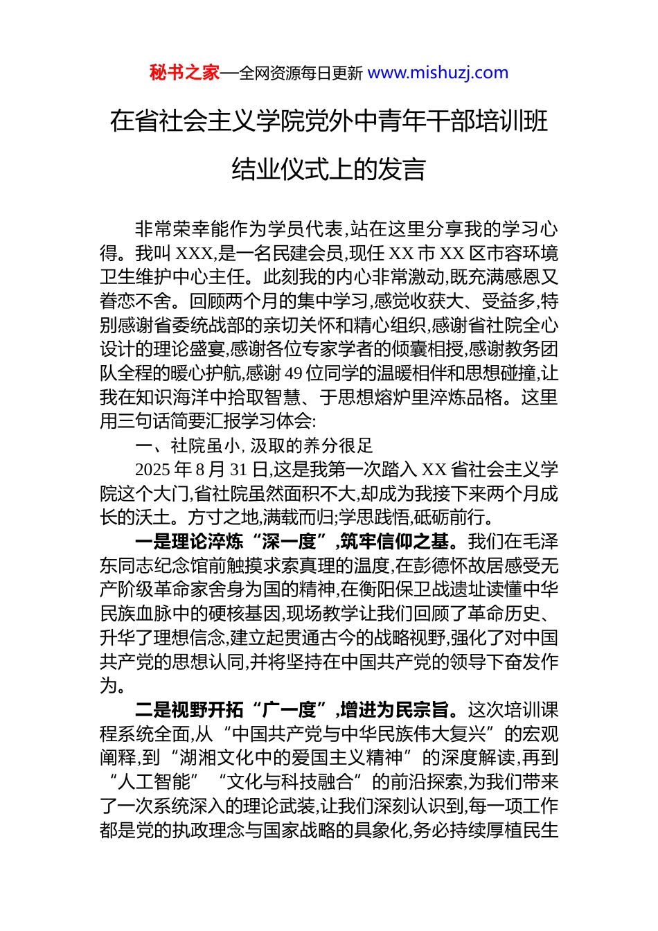 秘书之家—全网资源每日更新 www.mishuzj.com在省社会主义学院党外中青年干部培训班结业仪式上的发言非常荣幸能作为学员代表,站在这里分享我的学习心得。我叫 XXX,是一名民建会员,现任 XX 市 XX 区市容环境卫生维护中心主任。此刻我的内心非常激动,既充满感恩又眷恋不舍。回顾两个月的集中学习,感觉收获大、受益多,特别感谢省委统战部的亲切关怀和精心组织,感谢省社院全心设计的理论盛宴,感谢各位专家学者的倾囊相授,感谢教务团队全程的暖心护航,感谢 49 位同学的温暖相伴和思想碰撞,让我在知识海洋中拾取智慧、于思想熔炉里淬炼品格。这里用三句话简要汇报学习体会:一、社院虽小,汲取的养分很足2025 年 8 月 31 日,这是我第一次踏入 XX 省社会主义学院这个大门,省社院虽然面积不大,却成为我接下来两个月成长的沃土。方寸之地,满载而归;学思践悟,砥砺前行。一是理论淬炼“深一度”,筑牢信仰之基。我们在毛泽东同志纪念馆前触摸求索真理的温度,在彭德怀故居感受无产阶级革命家舍身为国的精神,在衡阳保卫战遗址读懂中华民族血脉中的硬核基因,现场教学让我们回顾了革命历史、升华了理想信念,建立起贯通古今的战略视野,强化了对中国共产党的思想认同,并将坚持在中国共产党的领导下奋发作为。二是视野开拓“广一度”,增进为民宗旨。这次培训课程系统全面,从“中国共产党与中华民族伟大复兴”的宏观阐释,到“湖湘文化中的爱国主义精神”的深度解读,再到“人工智能”“文化与科技融合”的前沿探索,为我们带来了一次系统深入的理论武装,让我们深刻认识到,每一项工作都是党的执政理念与国家战略的具象化,务必持续厚植民生秘书之家—全网资源每日更新 www.mishuzj.com情怀、改善民生福祉。三是交流互动“暖一度”,汇聚同行智慧。培训班汇聚全省各条战线的优秀党外干部,我们在课堂上专注思考、研讨中坦诚交流,从不同领域的实践案例里收获了多元解题路径,学习了多种工作方法,体会了统一战线凝聚人心的独特作用。这种思想碰撞,既增进了情谊,更凝聚了共识,让我们读懂了统战工作的丰富内涵。二、时光虽短,思想的回响很长两个月的学习时光虽短,思想的回响却绵长深远。理论的光照进心底,共识的种子生根发芽。一是喜获“金钥匙”,开启格局之门。通过学习这把“金钥匙”,帮助我们打开了视野格局,让我们清醒地认识到,平凡岗位的每一项工作,都与“三高四新”美好蓝图、中国式现代化 XX 篇章紧密相连。“小岗位”承载“大使命”,这份认知激励我们必须胸怀大局、提高站位、担当作为。二是擦净“透视镜”,看清不足之处。无论是聆听高水平专家的精彩授课,还是与优秀同学们的交流切磋,都像一面镜子,照见我们在理论素养、统战思维、创新能力等方面的差距,让我们深刻认识到,我们都还有很大的提升空间。这种清醒认知不是气馁而是鞭策,为我们指明了努力方向,激发了自我提升、自我革新的动力。三是校准“导航仪”,找准前行之向。这次培训让我们进一步明确了新时代党外干部的角色定位与责任担当,使我们深刻认识到,坚持党的领导,是统一战线发展的根本保证,也是个人成长的必然要求。未来我们要持续提升“五种能力”,争做政治坚定、业务精通、作风过硬的高素质干部,与党同心同向同行,积极投身中国式现代化 XX 实践。三、征程虽远,奋进的脚步很实近期召开的党的二十届四中全会,擘画了国家未来五年发展蓝图。宏伟蓝图已经绘就,奋斗号角已经吹响。我们被寄予厚望,也重任在肩。我们必须将学习成果转化为推动工秘书之家—全网资源每日更新 www.mishuzj.com作的强大动力和实际成效。一是将“理论养分”植入“实践土壤”。结业不是终点,而是新的起点。今后,我将结合培训所学和本职工作,在组织本单位做好日常保洁、垃圾清运的基础上,运用系统观念与创新思维,探索“环卫+智慧化”“环卫+低碳化”模式,提升城市精细化管理水平,把理论“软实力”转化为推动发展的“硬支撑”。二是将“统战思维”融入“基层阵地”。今后,我将主动运用统一战线这一法宝,在工作中注重沟通协商、凝聚共识,尤其是在公厕布局、一线工人权益保障等民生事务中,主动听取各方意见,兼顾不同群体诉求,找到最大公约数、画出最大同心圆,让统...