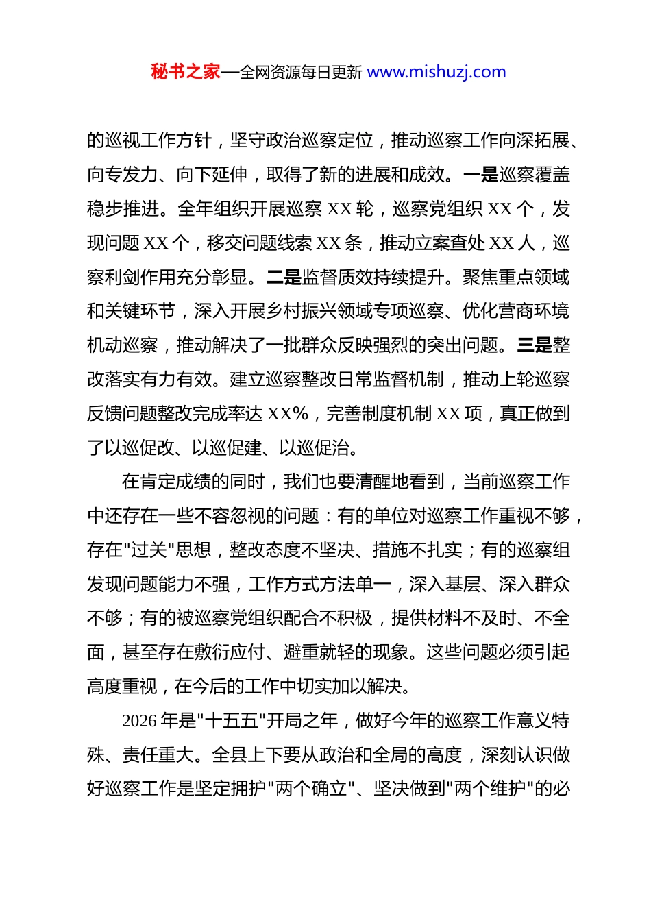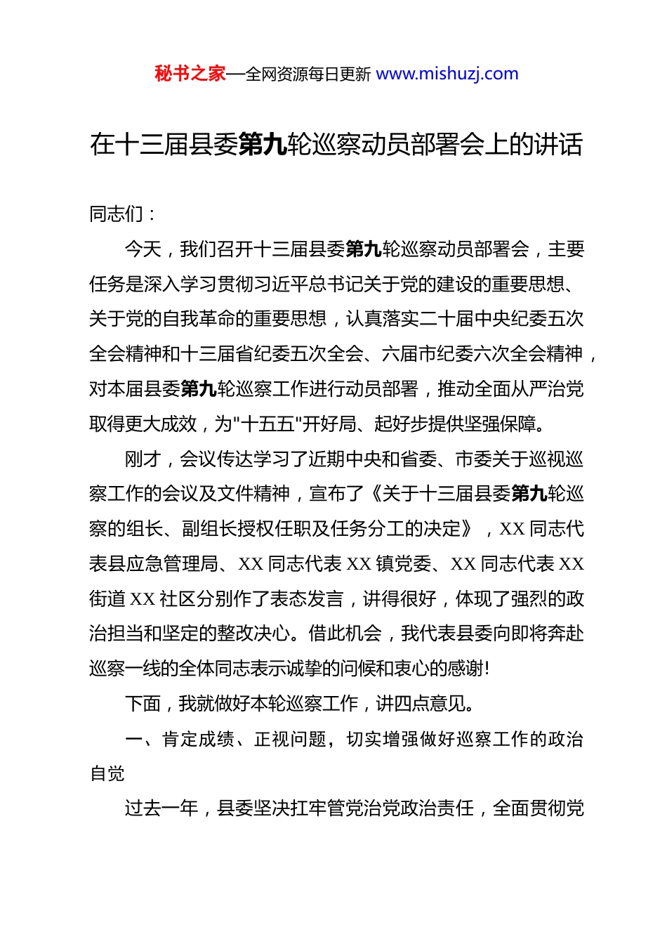 秘书之家—全网资源每日更新 www.mishuzj.com在十三届县委第九轮巡察动员部署会上的讲话 同志们:今天,我们召开十三届县委第九轮巡察动员部署会,主要任务是深入学习贯彻习近平总书记关于党的建设的重要思想、关于党的自我革命的重要思想,认真落实二十届中央纪委五次全会精神和十三届省纪委五次全会、六届市纪委六次全会精神,对本届县委第九轮巡察工作进行动员部署,推动全面从严治党取得更大成效,为"十五五"开好局、起好步提供坚强保障。刚才,会议传达学习了近期中央和省委、市委关于巡视巡察工作的会议及文件精神,宣布了《关于十三届县委第九轮巡察的组长、副组长授权任职及任务分工的决定》,XX 同志代表县应急管理局、XX 同志代表 XX 镇党委、XX 同志代表 XX街道 XX 社区分别作了表态发言,讲得很好,体现了强烈的政治担当和坚定的整改决心。借此机会,我代表县委向即将奔赴巡察一线的全体同志表示诚挚的问候和衷心的感谢!下面,我就做好本轮巡察工作,讲四点意见。一、肯定成绩、正视问题,切实增强做好巡察工作的政治自觉过去一年,县委坚决扛牢管党治党政治责任,全面贯彻党秘书之家—全网资源每日更新 www.mishuzj.com的巡视工作方针,坚守政治巡察定位,推动巡察工作向深拓展、向专发力、向下延伸,取得了新的进展和成效。一是巡察覆盖稳步推进。全年组织开展巡察 XX 轮,巡察党组织 XX 个,发现问题 XX 个,移交问题线索 XX 条,推动立案查处 XX 人,巡察利剑作用充分彰显。二是监督质效持续提升。聚焦重点领域和关键环节,深入开展乡村振兴领域专项巡察、优化营商环境机动巡察,推动解决了一批群众反映强烈的突出问题。三是整改落实有力有效。建立巡察整改日常监督机制,推动上轮巡察反馈问题整改完成率达 XX%,完善制度机制 XX 项,真正做到了以巡促改、以巡促建、以巡促治。在肯定成绩的同时,我们也要清醒地看到,当前巡察工作中还存在一些不容忽视的问题:有的单位对巡察工作重视不够,存在"过关"思想,整改态度不坚决、措施不扎实;有的巡察组发现问题能力不强,工作方式方法单一,深入基层、深入群众不够;有的被巡察党组织配合不积极,提供材料不及时、不全面,甚至存在敷衍应付、避重就轻的现象。这些问题必须引起高度重视,在今后的工作中切实加以解决。2026 年是"十五五"开局之年,做好今年的巡察工作意义特殊、责任重大。全县上下要从政治和全局的高度,深刻认识做好巡察工作是坚定拥护"两个确立"、坚决做到"两个维护"的必秘书之家—全网资源每日更新 www.mishuzj.com然要求,是推进党的自我革命、全面从严治党的重要举措,是推动高质量发展、服务保障现代化建设的有力支撑,切实把思想和行动统一到党中央决策部署和省委、市委工作要求上来,以实事求是的态度、坚决有力的行动,抓好巡察各项任务落实。二、聚焦重点、靶向发力,不断提升巡察工作的质量水平本轮巡察是十三届县委的第九轮巡察,共安排对县纪委县监委、县委宣传部、县财政局、县审计局、县统计局、县应急管理局、县退役军人事务局、县政务服务管理局等 8 个单位党组织开展常规巡察,对 XX 街道 XX 社区、XX 社区、XX 社区、XX 社区、XX 社区,XX 街道 XX 村、XX 村、XX 社区、XX村、XX 村,XX 镇 XX 村、XX 村、XX 村、XX 村、XX 村以及 XX 镇 XX 村、XX 村、XX 村、XX 村、XX 村等 20 个村级党组织开展巡察"回头看"。巡察时间为 3 月至 7 月。各巡察组要坚持问题导向,突出监督重点,切实提高巡察工作的针对性、实效性。第一,聚焦树立和践行正确政绩观深化监督。政绩观是党员干部的"总开关",决定着干事创业的方向和成效。要重点检查被巡察党组织是否牢固树立以人民为中心的发展思想,是否存在脱离实际、盲目举债、搞形象工程、政绩工程等问题,是否存在统计造假、数据注水、欺上瞒下等问题。特别是要对秘书之家—全网资源每日更新 www.mishuzj.com照"十五五"规划确定的各项目标任务,看是否真正把高质量发展要求落到实处,是否把主要精力用在打基础、利长远、惠民生的事情上,推动广大党员干部树立和践行正确政绩观...