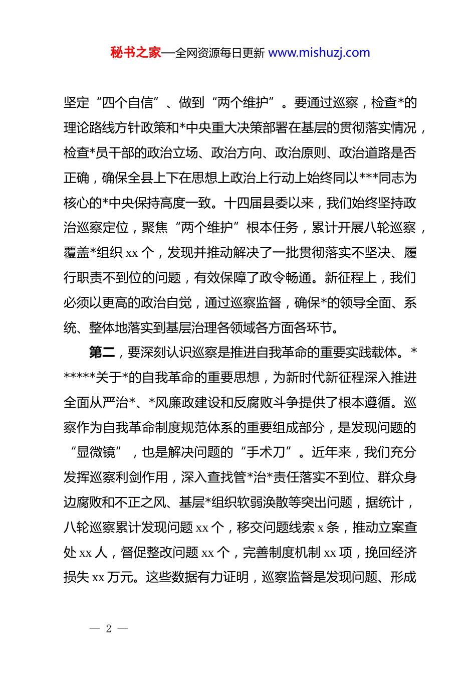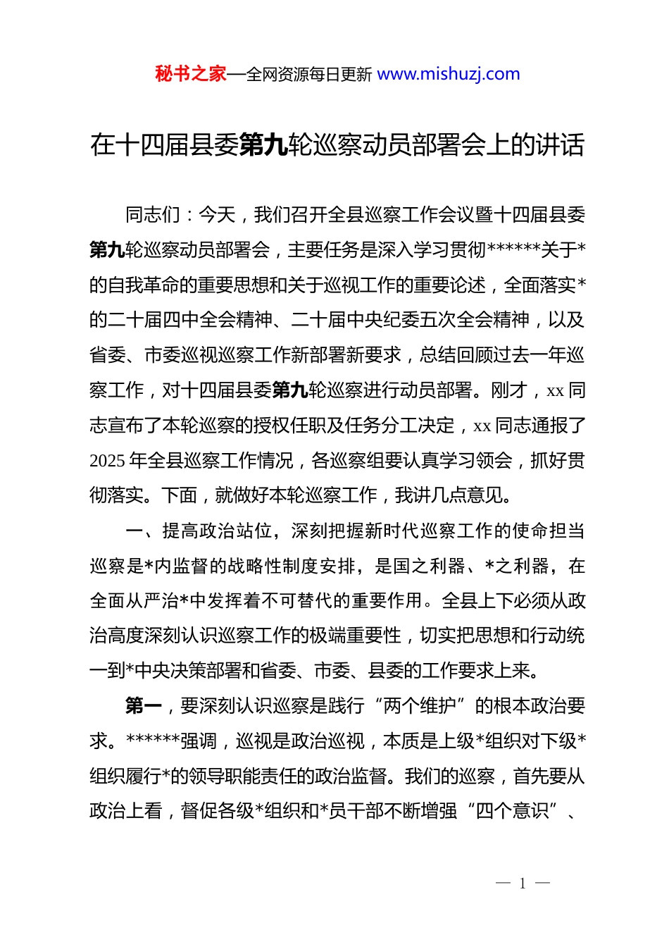 秘书之家—全网资源每日更新 www.mishuzj.com在十四届县委第九轮巡察动员部署会上的讲话同志们:今天,我们召开全县巡察工作会议暨十四届县委第九轮巡察动员部署会,主要任务是深入学习贯彻******关于*的自我革命的重要思想和关于巡视工作的重要论述,全面落实*的二十届四中全会精神、二十届中央纪委五次全会精神,以及省委、市委巡视巡察工作新部署新要求,总结回顾过去一年巡察工作,对十四届县委第九轮巡察进行动员部署。刚才,xx 同志宣布了本轮巡察的授权任职及任务分工决定,xx 同志通报了2025 年全县巡察工作情况,各巡察组要认真学习领会,抓好贯彻落实。下面,就做好本轮巡察工作,我讲几点意见。一、提高政治站位,深刻把握新时代巡察工作的使命担当巡察是*内监督的战略性制度安排,是国之利器、*之利器,在全面从严治*中发挥着不可替代的重要作用。全县上下必须从政治高度深刻认识巡察工作的极端重要性,切实把思想和行动统一到*中央决策部署和省委、市委、县委的工作要求上来。第一,要深刻认识巡察是践行“两个维护”的根本政治要求。******强调,巡视是政治巡视,本质是上级*组织对下级*组织履行*的领导职能责任的政治监督。我们的巡察,首先要从政治上看,督促各级*组织和*员干部不断增强“四个意识”、— 1 —秘书之家—全网资源每日更新 www.mishuzj.com坚定“四个自信”、做到“两个维护”。要通过巡察,检查*的理论路线方针政策和*中央重大决策部署在基层的贯彻落实情况,检查*员干部的政治立场、政治方向、政治原则、政治道路是否正确,确保全县上下在思想上政治上行动上始终同以***同志为核心的*中央保持高度一致。十四届县委以来,我们始终坚持政治巡察定位,聚焦“两个维护”根本任务,累计开展八轮巡察,覆盖*组织 xx 个,发现并推动解决了一批贯彻落实不坚决、履行职责不到位的问题,有效保障了政令畅通。新征程上,我们必须以更高的政治自觉,通过巡察监督,确保*的领导全面、系统、整体地落实到基层治理各领域各方面各环节。第二,要深刻认识巡察是推进自我革命的重要实践载体。******关于*的自我革命的重要思想,为新时代新征程深入推进全面从严治*、*风廉政建设和反腐败斗争提供了根本遵循。巡察作为自我革命制度规范体系的重要组成部分,是发现问题的“显微镜”,也是解决问题的“手术刀”。近年来,我们充分发挥巡察利剑作用,深入查找管*治*责任落实不到位、群众身边腐败和不正之风、基层*组织软弱涣散等突出问题,据统计,八轮巡察累计发现问题 xx 个,移交问题线索 x 条,推动立案查处 xx 人,督促整改问题 xx 个,完善制度机制 xx 项,挽回经济损失 xx 万元。这些数据有力证明,巡察监督是发现问题、形成— 2 —秘书之家—全网资源每日更新 www.mishuzj.com震慑,推动改革、促进发展的有效途径。必须坚持严的基调、严的措施、严的氛围,以巡察实际成效推动*的自我革命向纵深发展。第三,要深刻认识巡察是服务保障高质量发展的强大政治动力。当前,我县正处于奋力实现“十五五”时期目标的关键阶段,改革发展稳定任务繁重,巡察工作必须紧紧围绕中心、服务大局,深刻把握其政治保障作用、推动发展作用、凝聚民心作用和反腐利剑作用,我们聚焦高质量发展、民生关切、政策落实、基层强基等关键领域开展监督,正是要破解制约发展的堵点痛点难点问题。比如,通过巡察推动解决了部分项目落地难、营商环境不优、惠民政策落实打折扣、农村集体“三资”管理不规范等突出问题,盘活了闲置资产资源,引进了新项目,带动了群众就业,真正将巡察整改成效转化为推动发展的强劲动能。实践表明,哪里巡察监督有力,哪里的问题就解决得快,哪里的发展环境就更加清朗,哪里人民群众的获得感就更实在。我们必须坚定不移深化政治巡察,为实现全县经济社会高质量发展提供坚强政治保障。二、总结回顾成效,持续增强做好巡察工作的信心决心十四届县委以来,在市委巡察工作领导小组和县委的坚强领导下,全县巡察工作稳步推进、持续深化,监督质效不断提升,形成— 3 —秘书之家—全网资源每日更新 www.mishuzj.com了有效震慑,发挥了重要作...