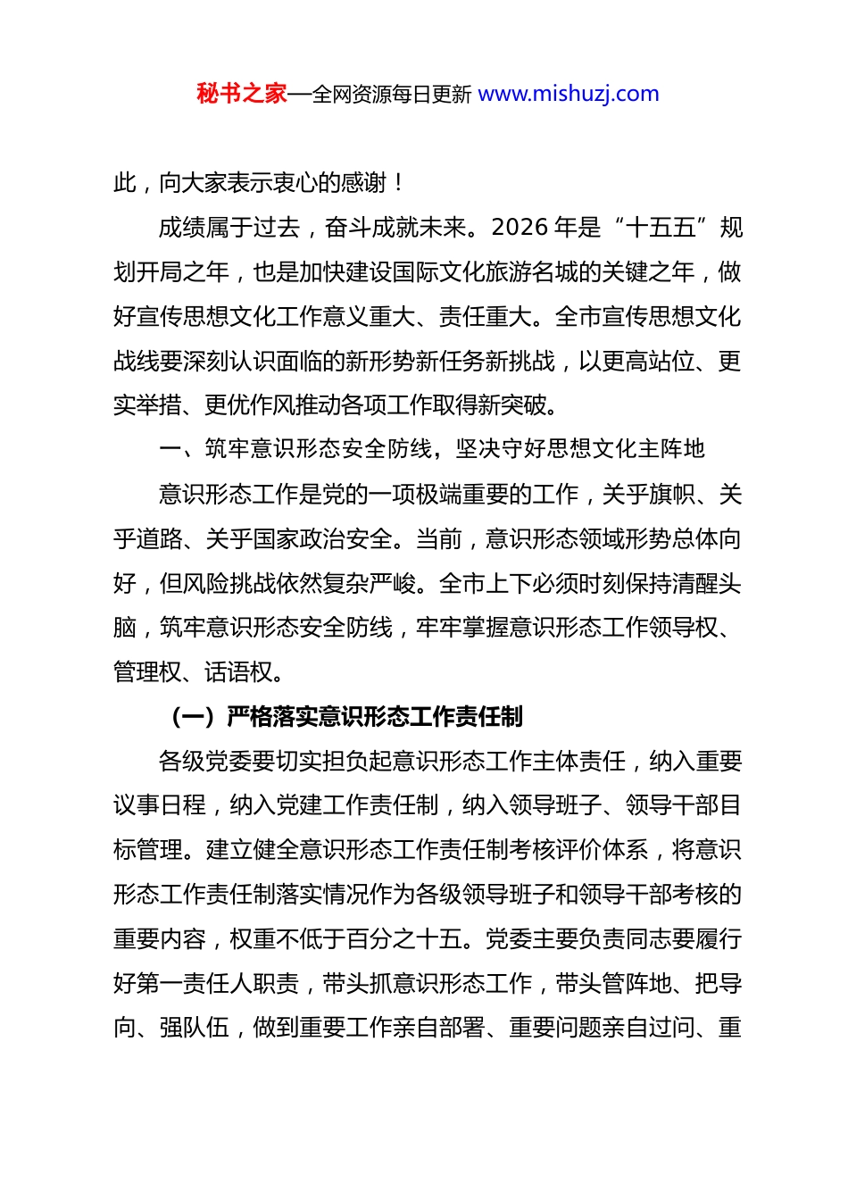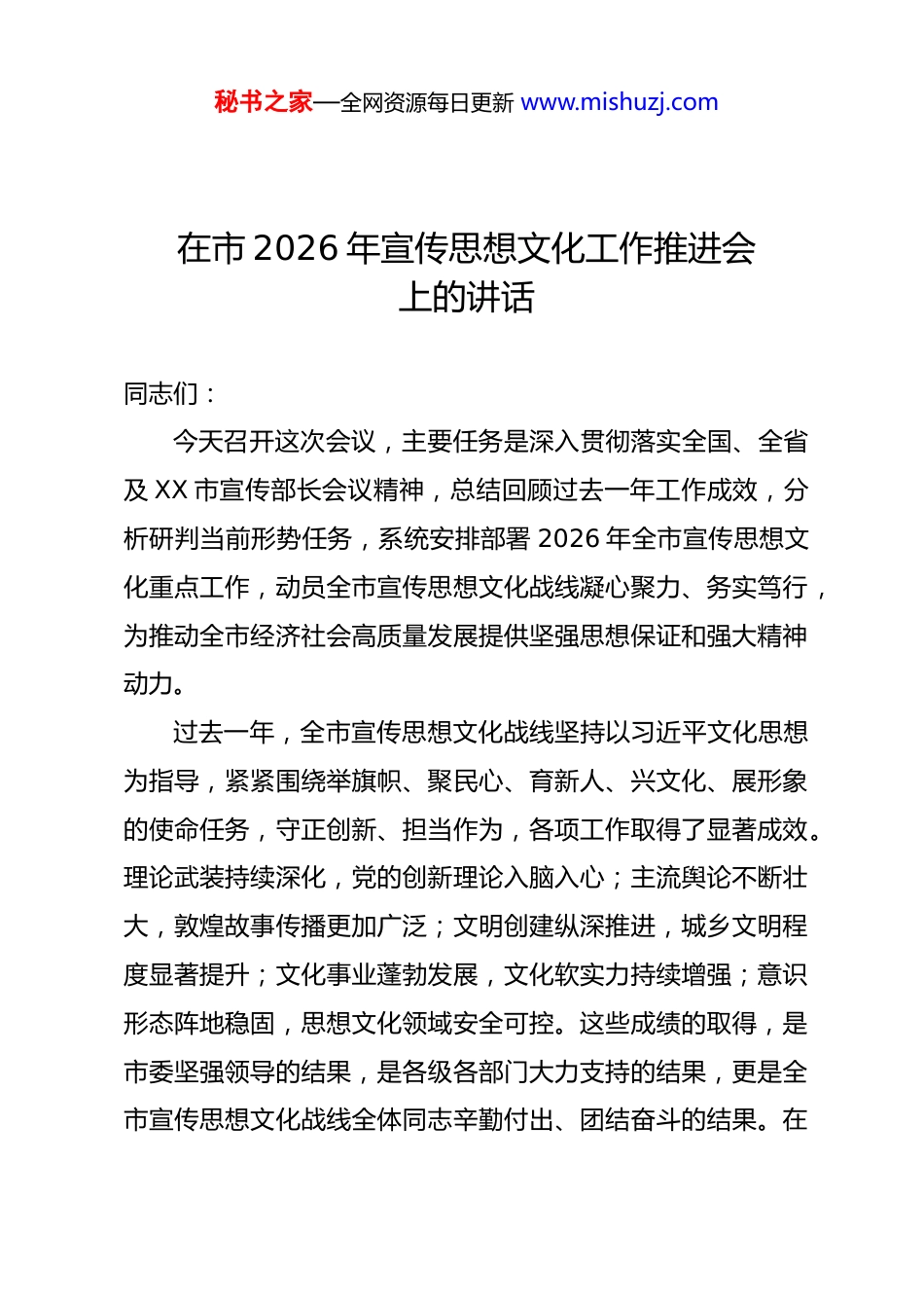 秘书之家—全网资源每日更新 www.mishuzj.com在市 2026 年宣传思想文化工作推进会上的讲话同志们:今天召开这次会议,主要任务是深入贯彻落实全国、全省及 XX 市宣传部长会议精神,总结回顾过去一年工作成效,分析研判当前形势任务,系统安排部署 2026 年全市宣传思想文化重点工作,动员全市宣传思想文化战线凝心聚力、务实笃行,为推动全市经济社会高质量发展提供坚强思想保证和强大精神动力。过去一年,全市宣传思想文化战线坚持以习近平文化思想为指导,紧紧围绕举旗帜、聚民心、育新人、兴文化、展形象的使命任务,守正创新、担当作为,各项工作取得了显著成效。理论武装持续深化,党的创新理论入脑入心;主流舆论不断壮大,敦煌故事传播更加广泛;文明创建纵深推进,城乡文明程度显著提升;文化事业蓬勃发展,文化软实力持续增强;意识形态阵地稳固,思想文化领域安全可控。这些成绩的取得,是市委坚强领导的结果,是各级各部门大力支持的结果,更是全市宣传思想文化战线全体同志辛勤付出、团结奋斗的结果。在秘书之家—全网资源每日更新 www.mishuzj.com此,向大家表示衷心的感谢!成绩属于过去,奋斗成就未来。2026 年是“十五五”规划开局之年,也是加快建设国际文化旅游名城的关键之年,做好宣传思想文化工作意义重大、责任重大。全市宣传思想文化战线要深刻认识面临的新形势新任务新挑战,以更高站位、更实举措、更优作风推动各项工作取得新突破。一、筑牢意识形态安全防线,坚决守好思想文化主阵地意识形态工作是党的一项极端重要的工作,关乎旗帜、关乎道路、关乎国家政治安全。当前,意识形态领域形势总体向好,但风险挑战依然复杂严峻。全市上下必须时刻保持清醒头脑,筑牢意识形态安全防线,牢牢掌握意识形态工作领导权、管理权、话语权。(一)严格落实意识形态工作责任制各级党委要切实担负起意识形态工作主体责任,纳入重要议事日程,纳入党建工作责任制,纳入领导班子、领导干部目标管理。建立健全意识形态工作责任制考核评价体系,将意识形态工作责任制落实情况作为各级领导班子和领导干部考核的重要内容,权重不低于百分之十五。党委主要负责同志要履行好第一责任人职责,带头抓意识形态工作,带头管阵地、把导向、强队伍,做到重要工作亲自部署、重要问题亲自过问、重秘书之家—全网资源每日更新 www.mishuzj.com大事件亲自处置。分管领导要履行好直接责任人职责,协助党委书记抓好统筹协调。班子成员要履行好“一岗双责”,抓好分管领域意识形态工作。(二)强化意识形态阵地管理坚持主管主办原则,加强对各类意识形态阵地的管理。新闻媒体要坚持正确舆论导向,严格执行三审三校制度,确保新闻宣传政治方向正确、舆论导向鲜明、价值取向健康。互联网是意识形态斗争的主战场,要依法加强网络空间治理,建立健全网络舆情监测预警、研判分析、应对处置机制。去年全市监测上报负面舆情一百五十二条,及时公开情况、正面回应一百三十二条,有效化解了一批网络舆情风险。今年要进一步完善网络舆情应对处置办法和流程,健全网络舆情会商研判机制,提升快速响应、精准处置能力,做到早发现、早研判、早处置、早化解。加强网评员队伍建设,做好网上舆论引导工作,营造清朗网络空间。(三)加强风险排查和研判预警建立健全意识形态领域风险点排查机制,定期开展风险排查和风险台账,实行动态跟踪管理。去年全市共梳理出十七个意识形态领域风险点,建立风险台账,实行动态跟踪管理。今年要持续深化风险排查工作,重点关注意识形态领域苗头性、秘书之家—全网资源每日更新 www.mishuzj.com倾向性问题,加强对敏感热点问题的分析研判,及时预警、妥善应对。健全意识形态领域情况通报制度,定期通报意识形态领域情况,及时向市委报告重大情况。(四)守牢文化安全底线加强文化市场监管,深入开展“扫黄打非”专项行动,严厉打击各类非法出版物和有害信息。加强对演出市场、娱乐场所、网吧等文化市场的监管,净化社会文化环境。强化对博物馆、图书馆、文化馆等公共文化场所的管理,确保文化阵地安全。加强对重点文化活动的审核把关,严把政治关、内容关、人员关...