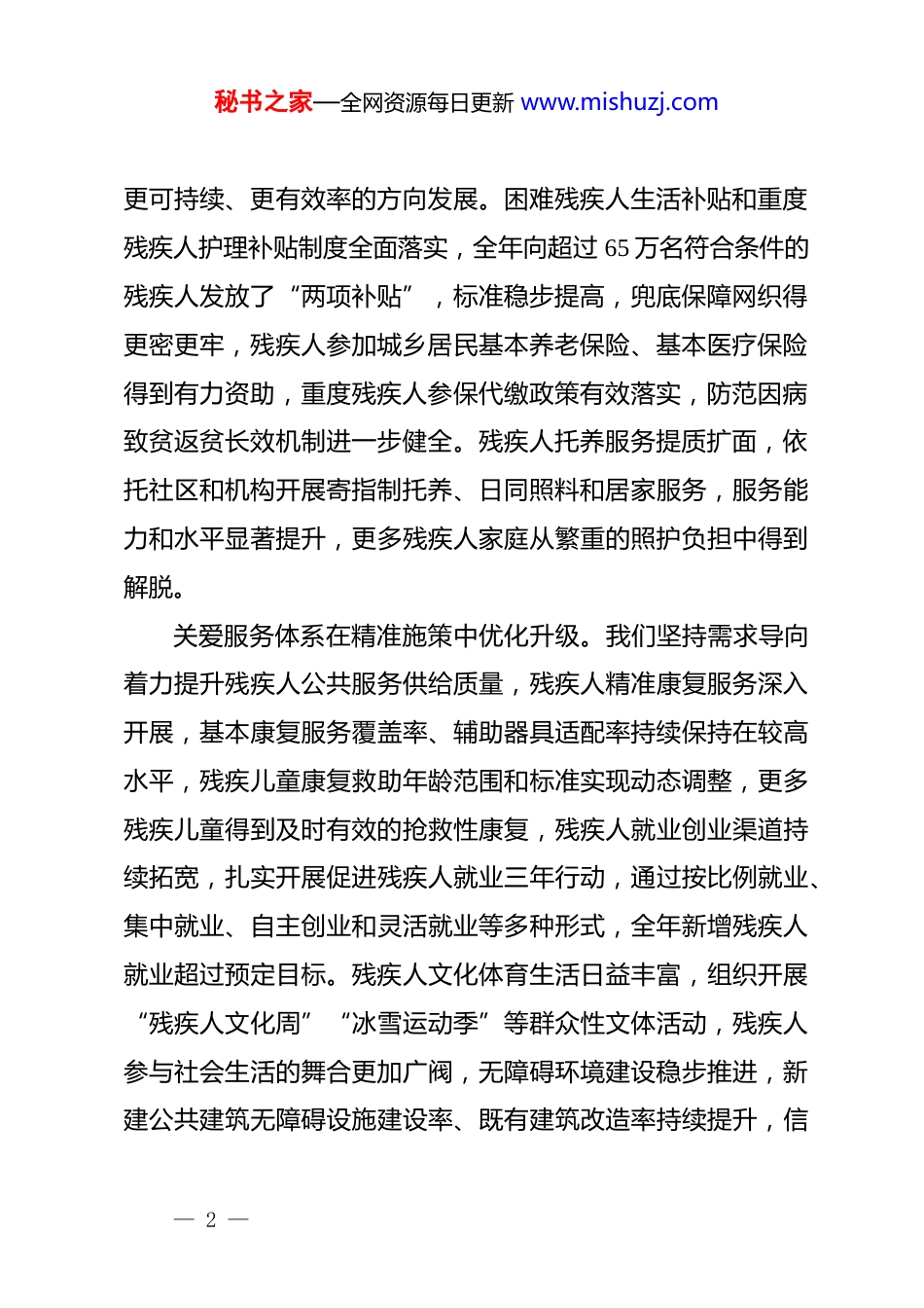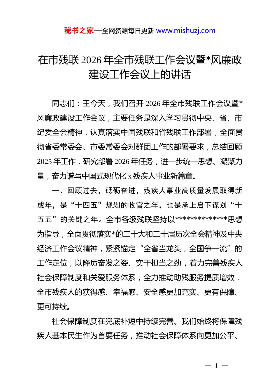 秘书之家—全网资源每日更新 www.mishuzj.com在市残联 2026 年全市残联工作会议暨*风廉政建设工作会议上的讲话同志们:王今天,我们召开 2026 年全市残联工作会议暨*风廉政建设工作会议,主要任务是深入学习贯彻中央、省、市纪委全会精神,认真落实中国残联和省残联工作部署,全面贯彻省委常委会、市委常委会对群团工作的部署要求,总结回顾2025 年工作,研究部署 2026 年任务,进一步统一思想、凝聚力量,奋力谱写中国式现代化 x 残疾人事业新篇章。一、回顾过去,砥砺奋进,残疾人事业高质量发展取得新成年,是“十四五”规划的收官之年,也是承上启下谋划“十五五”的关键之年。全市各级残联坚持以**************思想为指导,全面贯彻落实*的二十大和二十届历次全会精神及中央经济工作会议精神,紧紧锚定“全省当龙头,全国争一流”的工作定位,以降厉奋发之姿、实干担当之劲,着力完善残疾人社会保障制度和关爱服务体系,全力推动助残服务提质增效,全市残疾人的获得感、幸福感、安全感更加充实、更有保障、更可持续。社会保障制度在兜底补短中持续完善。我们始终将保障残疾人基本民生作为首要任务,推动社会保障体系向更加公平、— 1 —秘书之家—全网资源每日更新 www.mishuzj.com更可持续、更有效率的方向发展。困难残疾人生活补贴和重度残疾人护理补贴制度全面落实,全年向超过 65 万名符合条件的残疾人发放了“两项补贴”,标准稳步提高,兜底保障网织得更密更牢,残疾人参加城乡居民基本养老保险、基本医疗保险得到有力资助,重度残疾人参保代缴政策有效落实,防范因病致贫返贫长效机制进一步健全。残疾人托养服务提质扩面,依托社区和机构开展寄指制托养、日同照料和居家服务,服务能力和水平显著提升,更多残疾人家庭从繁重的照护负担中得到解脱。关爱服务体系在精准施策中优化升级。我们坚持需求导向着力提升残疾人公共服务供给质量,残疾人精准康复服务深入开展,基本康复服务覆盖率、辅助器具适配率持续保持在较高水平,残疾儿童康复救助年龄范围和标准实现动态调整,更多残疾儿童得到及时有效的抢救性康复,残疾人就业创业渠道持续拓宽,扎实开展促进残疾人就业三年行动,通过按比例就业、集中就业、自主创业和灵活就业等多种形式,全年新增残疾人就业超过预定目标。残疾人文化体育生活日益丰富,组织开展“残疾人文化周”“冰雪运动季”等群众性文体活动,残疾人参与社会生活的舞合更加广阀,无障碍环境建设稳步推进,新建公共建筑无障碍设施建设率、既有建筑改造率持续提升,信— 2 —秘书之家—全网资源每日更新 www.mishuzj.com息无障碍建设取得积极进展,残疾人出行和融入社会生活的环境更加友好。助残服务质效在改革创新中显著提升。我们以能力作风建设为抓手,推动残联组织自身改革和服务创新。残疾人证核发管理进一步规范,“跨省通办”等便民服务措施深入实施,残疾人办事便利度不断提高,科技助残应用推广力度加大,利用大数据、人工智能等新技术威能残疾人服务管理,服务精准化和智能化水平实现新的跃升。残疾人法律救助和信访维权工作扎实有效,建成残疾人法律服务站 300 余个,提供法律援助服务 500 余次,有效维护了残疾人合法权益,全市残疾人基本公共服务满意度达到 98 以上,这一成绩来之不易,凝聚着全市残联系统干部职工的辛勤付出。残疾人事业在融合发展中的社会氛围日益浓厚,我们积极营造全社会理解、尊重、关心、帮助残疾人的良好风尚。广泛开展“全国助残日”等主题宣传活动,扶残助残先进典型不断涌现。残疾人参与社会、贡献社会的意识与能力不断增强,在各个领城展现出自强不息、乐观进取的精神风貌、残疾人事业的社会关注度、支持度显著提升、形成了*委领导、政府负贵、残联组织发挥主体作用、社会力量广泛参与的残疾人事业发展格局。— 3 —秘书之家—全网资源每日更新 www.mishuzj.com这些成绩的取得,根本在于**************思想的科学指引,在于市委、市政府的坚强领导,在于省残联的有力指导,在于全市各级残联组织和广大残疾人工作者的辛勤付出,在于各相关部门和社会各界的大力支持,也在于广大残疾...