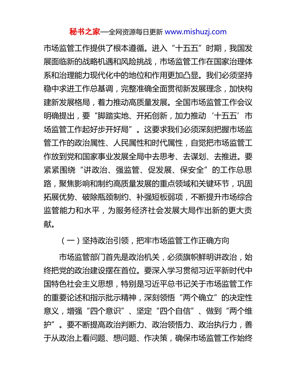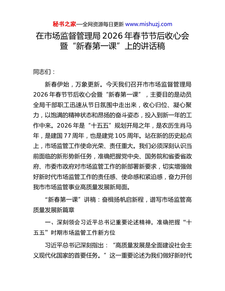 秘书之家—全网资源每日更新 www.mishuzj.com在市场监督管理局 2026 年春节节后收心会暨“新春第一课”上的讲话稿同志们:新春伊始,万象更新。今天我们召开市市场监督管理局2026 年春节节后收心会暨“新春第一课”,主要目的是动员全局干部职工迅速从节日氛围中走出来,收心归位、凝心聚力,以饱满的精神状态和昂扬的奋斗姿态,投入到新一年的工作中来。2026 年是“十五五”规划开局之年,是农历生肖马年,是建国 77 周年,也是建党 105 周年。站在新的历史起点上,市场监管工作使命光荣、责任重大。我们必须深刻认识当前面临的新形势新任务,准确把握党中央、国务院和省委省政府、市委市政府对市场监管工作的新部署新要求,切实增强做好新时代市场监管工作的责任感、使命感和紧迫感,奋力开创我市市场监管事业高质量发展新局面。“新春第一课”讲稿:奋楫扬帆启新程,谱写市场监管高质量发展新篇章一、深刻领会习近平总书记重要论述精神,准确把握“十五五”时期市场监管工作新方位习近平总书记深刻指出:“高质量发展是全面建设社会主义现代化国家的首要任务。”这一重要论述为我们做好新时代秘书之家—全网资源每日更新 www.mishuzj.com市场监管工作提供了根本遵循。进入“十五五”时期,我国发展面临新的战略机遇和风险挑战,市场监管工作在国家治理体系和治理能力现代化中的地位和作用更加凸显。我们必须坚持稳中求进工作总基调,完整准确全面贯彻新发展理念,加快构建新发展格局,着力推动高质量发展。全国市场监管工作会议明确提出,要“脚踏实地、开拓创新,加力推动‘十五五’市场监管工作起好步开好局”。这要求我们必须深刻把握市场监管工作的政治属性、人民属性和时代属性,自觉把市场监管工作放到党和国家事业发展全局中去思考、去谋划、去推进。要紧紧围绕“讲政治、强监管、促发展、保安全”的工作总思路,聚焦影响和制约高质量发展的重点领域和关键环节,巩固拓展优势、破除瓶颈制约、补强短板弱项,不断提升市场综合监管能力和水平,为服务经济社会发展大局作出新的更大贡献。(一)坚持政治引领,把牢市场监管工作正确方向市场监管部门首先是政治机关,必须旗帜鲜明讲政治,始终把党的政治建设摆在首位。要深入学习贯彻习近平新时代中国特色社会主义思想,特别是习近平总书记关于市场监管工作的重要论述和指示批示精神,深刻领悟“两个确立”的决定性意义,增强“四个意识”、坚定“四个自信”、做到“两个维护”。要不断提高政治判断力、政治领悟力、政治执行力,善于从政治上看问题、想问题、作决策,确保市场监管工作始终秘书之家—全网资源每日更新 www.mishuzj.com沿着正确政治方向前进。要自觉在思想上政治上行动上同以习近平同志为核心的党中央保持高度一致,坚决贯彻落实党中央、国务院各项决策部署,确保政令畅通、令行禁止。要严守政治纪律和政治规矩,严肃党内政治生活,营造风清气正的政治生态。要持续加强理论武装,坚持读原著、学原文、悟原理,深刻把握党的创新理论的核心要义、精神实质、丰富内涵和实践要求,自觉用以武装头脑、指导实践、推动工作。要建立健全“第一议题”制度,及时跟进学习习近平总书记最新重要讲话和重要指示批示精神,做到学思用贯通、知信行统一。要巩固拓展主题教育成果,推动党史学习教育常态化长效化,引导广大党员干部坚定理想信念、牢记初心使命、勇于担当作为。要加强意识形态阵地建设和管理,严格落实意识形态工作责任制,牢牢掌握意识形态工作领导权、管理权、话语权。要大力弘扬伟大建党精神,传承红色基因,赓续红色血脉,激发干事创业的强大精神动力。要教育引导广大党员干部胸怀“国之大者”,自觉把市场监管工作放到党和国家事业发展全局中去谋划和推进,切实担负起党和人民赋予的职责使命。(二)坚持服务大局,彰显市场监管工作时代价值市场监管工作事关经济社会发展全局,事关人民群众切身利益,必须自觉服务党和国家中心工作。要紧紧围绕推动高质量发展这一主题,找准市场监管工作的切入点和着力点,在服务构建新发展格局、建设现代化经济体系中展现新作为。要充秘书之家—全网资源每日更新...