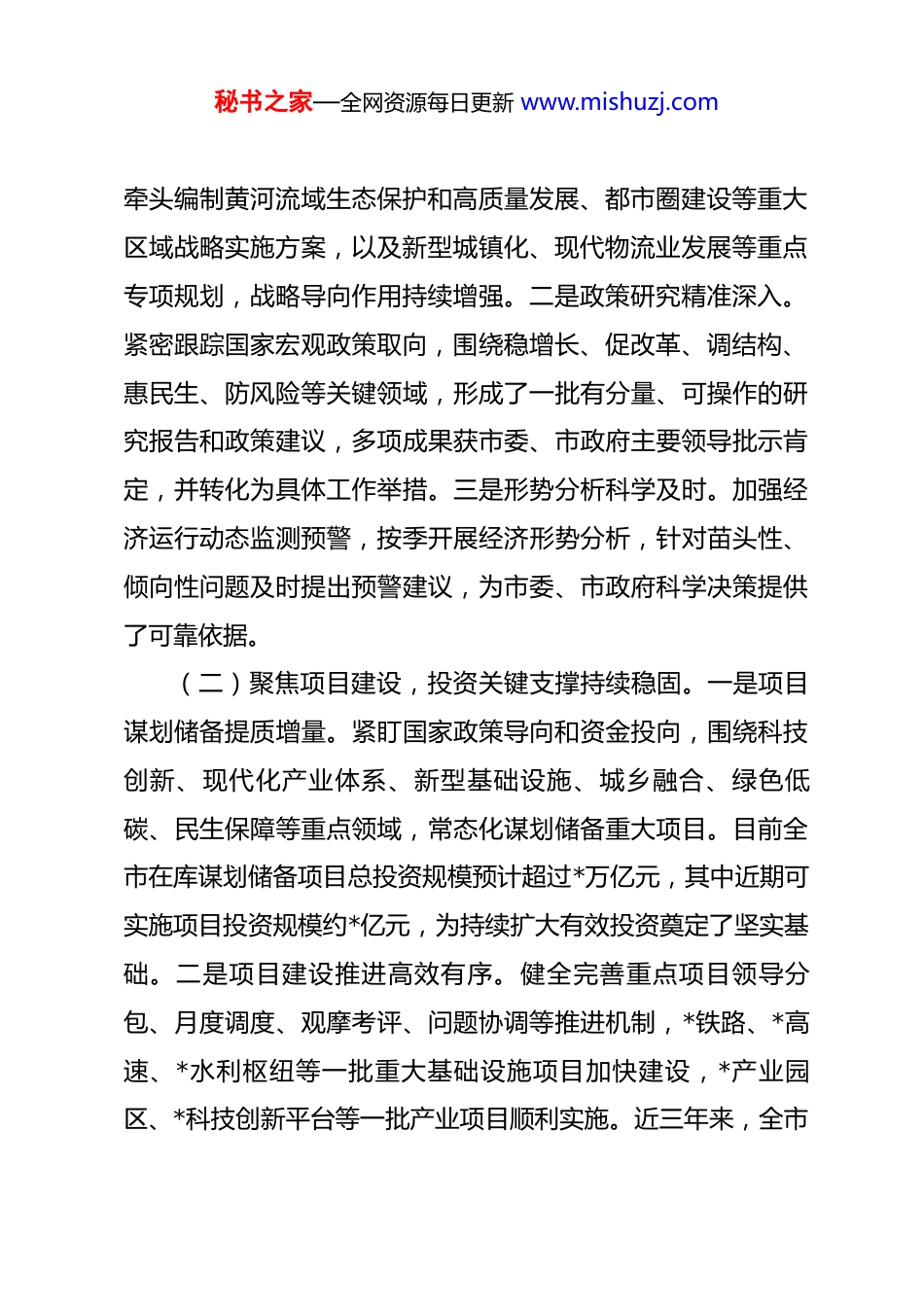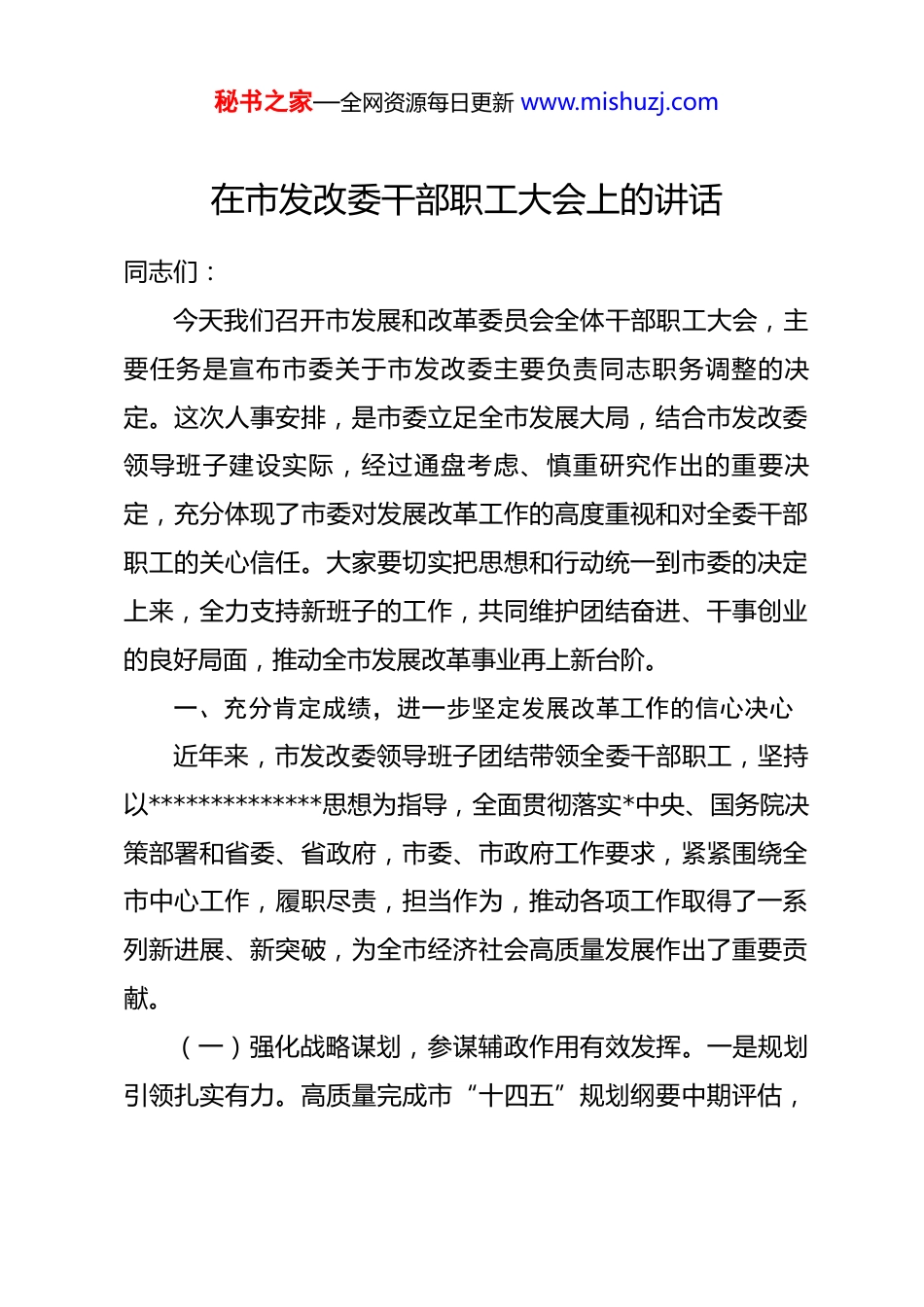 秘书之家—全网资源每日更新 www.mishuzj.com在市发改委干部职工大会上的讲话同志们:今天我们召开市发展和改革委员会全体干部职工大会,主要任务是宣布市委关于市发改委主要负责同志职务调整的决定。这次人事安排,是市委立足全市发展大局,结合市发改委领导班子建设实际,经过通盘考虑、慎重研究作出的重要决定,充分体现了市委对发展改革工作的高度重视和对全委干部职工的关心信任。大家要切实把思想和行动统一到市委的决定上来,全力支持新班子的工作,共同维护团结奋进、干事创业的良好局面,推动全市发展改革事业再上新台阶。一、充分肯定成绩,进一步坚定发展改革工作的信心决心近年来,市发改委领导班子团结带领全委干部职工,坚持以**************思想为指导,全面贯彻落实*中央、国务院决策部署和省委、省政府,市委、市政府工作要求,紧紧围绕全市中心工作,履职尽责,担当作为,推动各项工作取得了一系列新进展、新突破,为全市经济社会高质量发展作出了重要贡献。(一)强化战略谋划,参谋辅政作用有效发挥。一是规划引领扎实有力。高质量完成市“十四五”规划纲要中期评估,秘书之家—全网资源每日更新 www.mishuzj.com牵头编制黄河流域生态保护和高质量发展、都市圈建设等重大区域战略实施方案,以及新型城镇化、现代物流业发展等重点专项规划,战略导向作用持续增强。二是政策研究精准深入。紧密跟踪国家宏观政策取向,围绕稳增长、促改革、调结构、惠民生、防风险等关键领域,形成了一批有分量、可操作的研究报告和政策建议,多项成果获市委、市政府主要领导批示肯定,并转化为具体工作举措。三是形势分析科学及时。加强经济运行动态监测预警,按季开展经济形势分析,针对苗头性、倾向性问题及时提出预警建议,为市委、市政府科学决策提供了可靠依据。(二)聚焦项目建设,投资关键支撑持续稳固。一是项目谋划储备提质增量。紧盯国家政策导向和资金投向,围绕科技创新、现代化产业体系、新型基础设施、城乡融合、绿色低碳、民生保障等重点领域,常态化谋划储备重大项目。目前全市在库谋划储备项目总投资规模预计超过*万亿元,其中近期可实施项目投资规模约*亿元,为持续扩大有效投资奠定了坚实基础。二是项目建设推进高效有序。健全完善重点项目领导分包、月度调度、观摩考评、问题协调等推进机制,*铁路、*高速、*水利枢纽等一批重大基础设施项目加快建设,*产业园区、*科技创新平台等一批产业项目顺利实施。近三年来,全市秘书之家—全网资源每日更新 www.mishuzj.com省、市重点项目累计完成投资预计超过*亿元,拉动全市固定资产投资年均增长*%以上。三是资金争取成效显著。全力以赴争取中央预算内投资、地方政府专项债券、超长期特别国债等政策资金支持,预计近三年累计争取各类中央和省资金超过*亿元,有效缓解了项目建设资金压力,保障了重大项目顺利实施。(三)深化改革开放,发展动力活力不断增强。一是重点领域改革纵深推进。牵头推进要素市场化配置综合改革试点,在土地、劳动力、资本、技术、数据等领域探索形成一批改革经验。深化“放管服效”改革,牵头优化营商环境工作,聚焦企业关切,推动行政审批制度改革、信用体系建设、招投标领域整治等工作取得新进展,全市营商环境评价持续位居全省前列。二是区域合作开放走深走实。积极融入都市圈建设,在规划衔接、产业协作、交通互联、生态共治、公共服务共享等方面取得实质性合作成果。主动对接长三角、粤港澳大湾区等先进地区,组织开展系列招商推介活动,承接产业转移成效明显。三是绿色低碳转型步伐加快。牵头制定碳达峰实施方案,统筹推进能耗双控向碳排放双控转变,严控“两高”项目盲目发展,大力发展新能源和可再生能源,预计全市非化石能源消费占比提升至*%,单位 gdp 能耗累计下降*%,绿色发展底色秘书之家—全网资源每日更新 www.mishuzj.com更加鲜明。(四)保障改善民生,社会大局保持和谐稳定。一是价格调控监管平稳有序。加强重要民生商品价格监测预警,完善保供稳价机制,适时启动社会救助和保障标准与物价上涨挂钩联动机制,有效保障了市场供应和价格基本稳定。二是粮食能源安全...