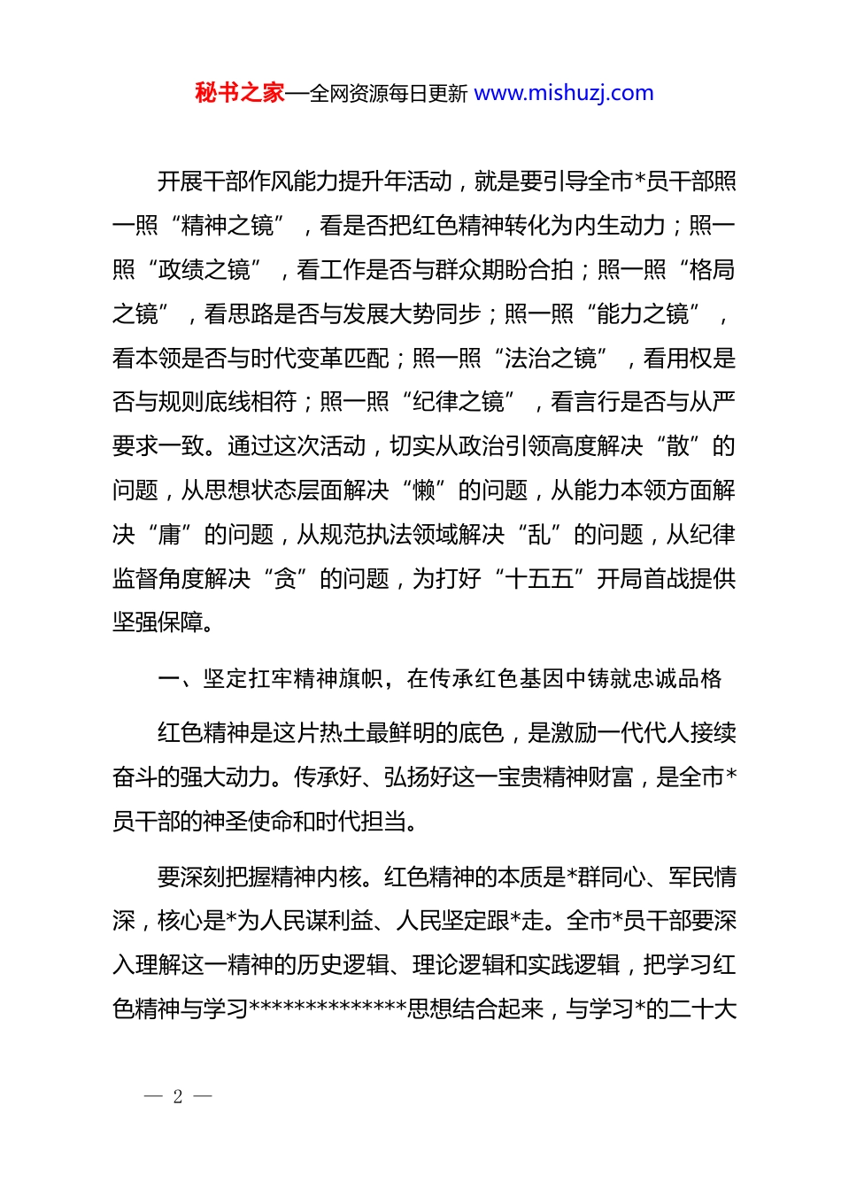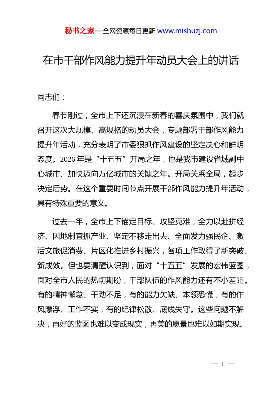 秘书之家—全网资源每日更新 www.mishuzj.com在市干部作风能力提升年动员大会上的讲话同志们:春节刚过,全市上下还沉浸在新春的喜庆氛围中,我们就召开这次大规模、高规格的动员大会,专题部署干部作风能力提升年活动,充分表明了市委狠抓作风建设的坚定决心和鲜明态度。2026 年是“十五五”开局之年,也是我市建设省域副中心城市、加快迈向万亿城市的关键之年。开局关系全局,起步决定后势。在这个重要时间节点开展干部作风能力提升年活动,具有特殊重要的意义。过去一年,全市上下锚定目标、攻坚克难,全力以赴拼经济、因地制宜抓产业、坚定不移走出去、全面发力强民企、激活文旅促消费、片区化推进乡村振兴,各项工作取得了新突破、新成效。但也要清醒认识到,面对“十五五”发展的宏伟蓝图,面对全市人民的热切期盼,干部队伍的作风能力还有不小差距。有的精神懈怠、干劲不足,有的能力欠缺、本领恐慌,有的作风漂浮、工作不实,有的纪律松散、底线失守。这些问题不解决,再好的蓝图也难以变成现实,再美的愿景也难以如期实现。— 1 —秘书之家—全网资源每日更新 www.mishuzj.com开展干部作风能力提升年活动,就是要引导全市*员干部照一照“精神之镜”,看是否把红色精神转化为内生动力;照一照“政绩之镜”,看工作是否与群众期盼合拍;照一照“格局之镜”,看思路是否与发展大势同步;照一照“能力之镜”,看本领是否与时代变革匹配;照一照“法治之镜”,看用权是否与规则底线相符;照一照“纪律之镜”,看言行是否与从严要求一致。通过这次活动,切实从政治引领高度解决“散”的问题,从思想状态层面解决“懒”的问题,从能力本领方面解决“庸”的问题,从规范执法领域解决“乱”的问题,从纪律监督角度解决“贪”的问题,为打好“十五五”开局首战提供坚强保障。一、坚定扛牢精神旗帜,在传承红色基因中铸就忠诚品格红色精神是这片热土最鲜明的底色,是激励一代代人接续奋斗的强大动力。传承好、弘扬好这一宝贵精神财富,是全市*员干部的神圣使命和时代担当。要深刻把握精神内核。红色精神的本质是*群同心、军民情深,核心是*为人民谋利益、人民坚定跟*走。全市*员干部要深入理解这一精神的历史逻辑、理论逻辑和实践逻辑,把学习红色精神与学习**************思想结合起来,与学习*的二十大— 2 —秘书之家—全网资源每日更新 www.mishuzj.com精神结合起来,在学思践悟中坚定理想信念、强化宗旨意识。各级*委要把红色精神教育纳入理论学习中心组学习内容,纳入干部教育培训必修课程,推动红色精神入脑入心、融入血脉。要自觉践行群众路线。红色精神最深厚的根源在于人民群众。全市*员干部要始终把人民放在心中最高位置,坚持问政于民、问计于民、问需于民,真正把群众呼声作为第一信号,把群众满意作为第一标准。要深入基层一线,倾听群众心声,了解群众疾苦,解决群众难题。要健全干部联系群众制度,推动各级干部下沉基层、服务群众,在密切联系群众中增进感情、提升能力、锤炼作风。要畅通群众诉求表达渠道,完善群众问题反馈办理机制,让群众有地方说话、说了有人听、听了有反馈。要始终保持奋斗姿态。艰苦奋斗是红色精神的鲜明特质。全市*员干部要继承前辈们“吃苦耐劳、勇往直前”的优良传统,保持永不懈怠的精神状态和一往无前的奋斗姿态。要敢于直面矛盾、勇于攻坚克难,在解决实际问题中增长才干、砥砺品格。要树立正确的政绩观,多做打基础、利长远的工作,不搞形式主义、不做表面文章,以实实在在的工作业绩取信于民、造福于民。— 3 —秘书之家—全网资源每日更新 www.mishuzj.com二、持续深化对标学标,在解放思想中提升发展境界思想解放的程度决定发展的速度和高度。面对新一轮科技革命和产业变革,面对区域竞争日趋激烈的态势,全市上下必须把解放思想作为“头号工程”,在对标先进中找差距、学真经、促提升。要找准标杆、明确方向。对标学习不能盲目跟风、浅尝辄止,要精准选择对标对象,既要有综合性标杆,也要有专项性标杆。要聚焦产业发展、营商环境、社会治理、民生保障等重点领域,瞄准全国先进地区和行业标杆,深入分析其发展路径、工...
