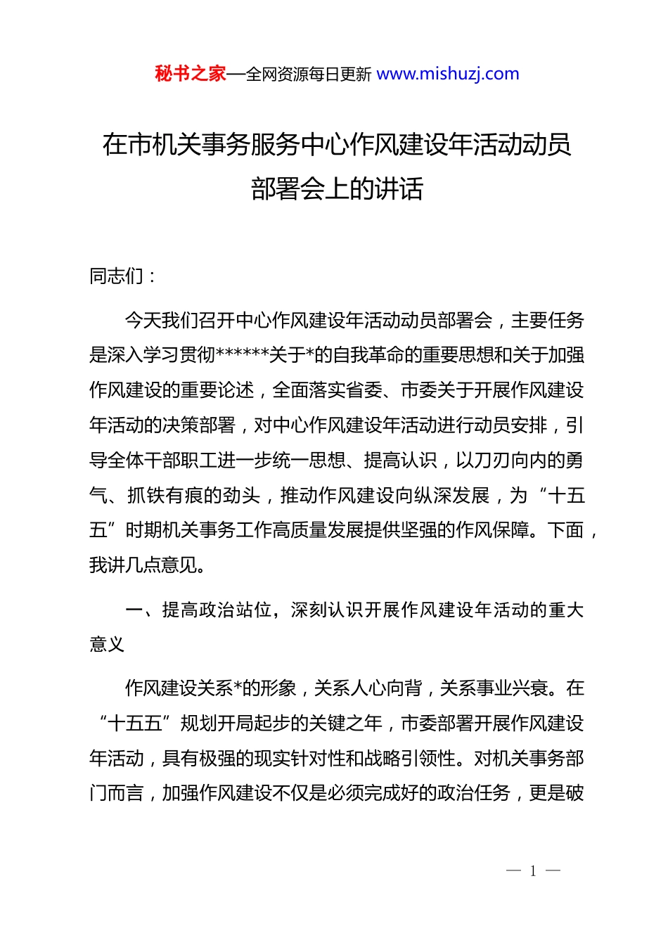 秘书之家—全网资源每日更新 www.mishuzj.com在市机关事务服务中心作风建设年活动动员部署会上的讲话同志们:今天我们召开中心作风建设年活动动员部署会,主要任务是深入学习贯彻******关于*的自我革命的重要思想和关于加强作风建设的重要论述,全面落实省委、市委关于开展作风建设年活动的决策部署,对中心作风建设年活动进行动员安排,引导全体干部职工进一步统一思想、提高认识,以刀刃向内的勇气、抓铁有痕的劲头,推动作风建设向纵深发展,为“十五五”时期机关事务工作高质量发展提供坚强的作风保障。下面,我讲几点意见。一、提高政治站位,深刻认识开展作风建设年活动的重大意义作风建设关系*的形象,关系人心向背,关系事业兴衰。在“十五五”规划开局起步的关键之年,市委部署开展作风建设年活动,具有极强的现实针对性和战略引领性。对机关事务部门而言,加强作风建设不仅是必须完成好的政治任务,更是破— 1 —秘书之家—全网资源每日更新 www.mishuzj.com解发展难题、提升保障效能、实现自身高质量发展的内在要求和迫切需要。第一,这是践行“两个维护”、筑牢政治忠诚的必然要求。机关事务工作政治性强,保障的是*政机关运转,服务的是全市工作大局。作风问题的本质是*性问题,作风建设的成效直接检验着对*忠诚的纯度。必须将作风建设作为深刻领悟“两个确立”决定性意义、坚决做到“两个维护”的具体实践,不断提高政治判断力、政治领悟力、政治执行力,确保机关事务工作始终沿着正确方向前进。第二,这是服务发展大局、保障高效运转的迫切需要 。2026 年是“十五五”开局之年,全市经济社会发展任务艰巨繁重。机关事务工作承担着“保障、服务、管理”的重要职能,是机关运行的“大后方”。没有过硬的作风,就难以提供高水平、高质量、高效能的保障服务,就可能影响全市中心工作的推进。必须通过作风建设,锤炼一支关键时刻拉得出、冲得上、打得赢的过硬队伍,切实当好机关运行的“保障部”、重大活动的“服务队”。第三,这是破解瓶颈问题、锻造过硬队伍的关键举措。对标新时代新要求,对照市委指出的“十个方面”突出问题,中— 2 —秘书之家—全网资源每日更新 www.mishuzj.com心干部队伍在思想观念、能力素质、工作作风、服务效能上仍有提升空间。有的同志存在“按部就班、求稳怕难”的思想,创新突破意识不强;有的存在“重管理、轻服务”的倾向,精细化、人性化服务水平有待提高;有的在制度执行上打折扣、搞变通,节约型机关建设仍需深化。开展作风建设年活动,就是要以自我革命精神,深挖细查这些问题,动真碰硬加以解决,锻造一支忠诚干净担当的机关事务铁军。二、坚持问题导向,精准把握作风建设年活动的目标任务市委对这次作风建设年活动提出了“动真碰硬转作风、锚定目标提效能”的明确要求。中心全体干部职工必须坚持问题导向、目标导向、结果导向相统一,将活动要求不折不扣落到实处。重点要围绕以下方面查摆整改、提升突破:一要聚焦“政治过硬”,着力解决思想认识有偏差、执行决策打折扣的问题。要深入查摆在贯彻落实中央、省委、市委决策部署上是否存在“中梗阻”“慢半拍”现象,是否存在对机关事务工作的政治属性认识不到位、将业务与政治割裂开来的问题。必须把讲政治摆在首位,确保各项保障服务工作都紧扣全市中心大局,体现政治效果。— 3 —秘书之家—全网资源每日更新 www.mishuzj.com二要聚焦“担当作为”,着力解决履职尽责不到位、攻坚克难劲头不足的问题。对照“十个方面”问题表现,重点查摆是否存在“太平官”思想,习惯于“守摊子”、不愿“闯路子”;是否存在“二传手”现象,对上级部署简单传达、层层转批,缺乏一抓到底的韧劲;是否存在“新官不理旧账”、面对历史遗留问题绕道走的情况。要激发“逢山开路、遇水架桥”的担当精神,在资产管理、服务保障、节能降耗等难点工作上敢于碰硬、善于破题。三要聚焦“服务提质”,着力解决宗旨意识不牢固、服务保障不精细的问题。机关事务工作的价值体现在服务。要深入查摆服务意识强不强,“六心”服务精神践行得到不到位;服务模式优不优,是否还存在“门好进、脸好看、事...