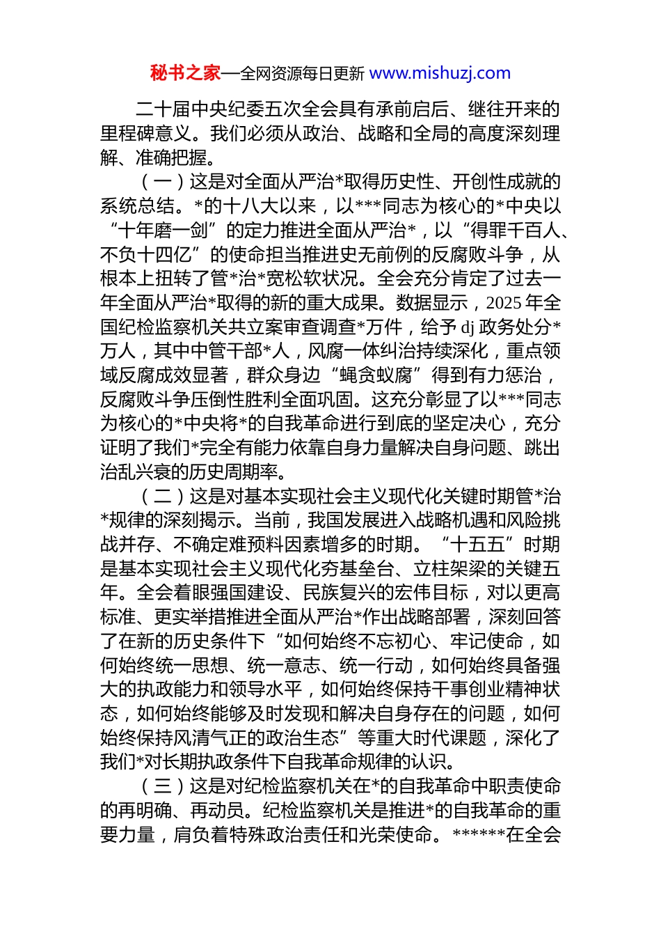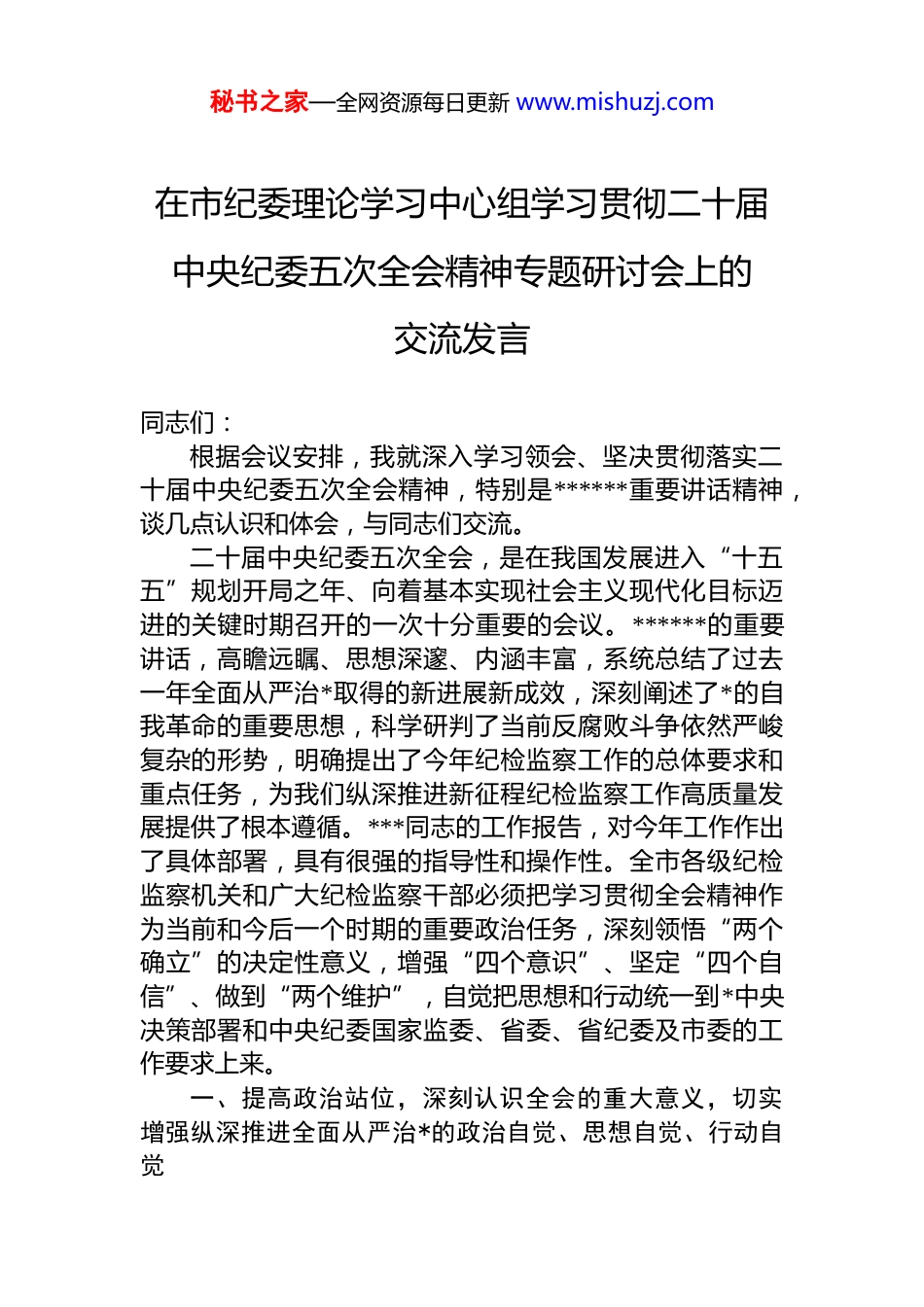 秘书之家—全网资源每日更新 www.mishuzj.com在市纪委理论学习中心组学习贯彻二十届中央纪委五次全会精神专题研讨会上的交流发言同志们:根据会议安排,我就深入学习领会、坚决贯彻落实二十届中央纪委五次全会精神,特别是******重要讲话精神,谈几点认识和体会,与同志们交流。二十届中央纪委五次全会,是在我国发展进入“十五五”规划开局之年、向着基本实现社会主义现代化目标迈进的关键时期召开的一次十分重要的会议。******的重要讲话,高瞻远瞩、思想深邃、内涵丰富,系统总结了过去一年全面从严治*取得的新进展新成效,深刻阐述了*的自我革命的重要思想,科学研判了当前反腐败斗争依然严峻复杂的形势,明确提出了今年纪检监察工作的总体要求和重点任务,为我们纵深推进新征程纪检监察工作高质量发展提供了根本遵循。***同志的工作报告,对今年工作作出了具体部署,具有很强的指导性和操作性。全市各级纪检监察机关和广大纪检监察干部必须把学习贯彻全会精神作为当前和今后一个时期的重要政治任务,深刻领悟“两个确立”的决定性意义,增强“四个意识”、坚定“四个自信”、做到“两个维护”,自觉把思想和行动统一到*中央决策部署和中央纪委国家监委、省委、省纪委及市委的工作要求上来。一、提高政治站位,深刻认识全会的重大意义,切实增强纵深推进全面从严治*的政治自觉、思想自觉、行动自觉秘书之家—全网资源每日更新 www.mishuzj.com二十届中央纪委五次全会具有承前启后、继往开来的里程碑意义。我们必须从政治、战略和全局的高度深刻理解、准确把握。(一)这是对全面从严治*取得历史性、开创性成就的系统总结。*的十八大以来,以***同志为核心的*中央以“十年磨一剑”的定力推进全面从严治*,以“得罪千百人、不负十四亿”的使命担当推进史无前例的反腐败斗争,从根本上扭转了管*治*宽松软状况。全会充分肯定了过去一年全面从严治*取得的新的重大成果。数据显示,2025 年全国纪检监察机关共立案审查调查*万件,给予 dj 政务处分*万人,其中中管干部*人,风腐一体纠治持续深化,重点领域反腐成效显著,群众身边“蝇贪蚁腐”得到有力惩治,反腐败斗争压倒性胜利全面巩固。这充分彰显了以***同志为核心的*中央将*的自我革命进行到底的坚定决心,充分证明了我们*完全有能力依靠自身力量解决自身问题、跳出治乱兴衰的历史周期率。(二)这是对基本实现社会主义现代化关键时期管*治*规律的深刻揭示。当前,我国发展进入战略机遇和风险挑战并存、不确定难预料因素增多的时期。“十五五”时期是基本实现社会主义现代化夯基垒台、立柱架梁的关键五年。全会着眼强国建设、民族复兴的宏伟目标,对以更高标准、更实举措推进全面从严治*作出战略部署,深刻回答了在新的历史条件下“如何始终不忘初心、牢记使命,如何始终统一思想、统一意志、统一行动,如何始终具备强大的执政能力和领导水平,如何始终保持干事创业精神状态,如何始终能够及时发现和解决自身存在的问题,如何始终保持风清气正的政治生态”等重大时代课题,深化了我们*对长期执政条件下自我革命规律的认识。(三)这是对纪检监察机关在*的自我革命中职责使命的再明确、再动员。纪检监察机关是推进*的自我革命的重要力量,肩负着特殊政治责任和光荣使命。******在全会秘书之家—全网资源每日更新 www.mishuzj.com上对纪检监察干部队伍提出了“政治过硬、能力过硬、作风过硬、廉洁过硬”的明确要求,这“四个过硬”既是对我们的殷切期望,更是严格的政治要求。全会部署的各项任务,每一项都事关*的执政根基巩固,事关*和国家事业兴衰成败。我们必须深刻认识自身在*和国家监督体系中的地位作用,准确把握在*的自我革命中的职责任务,始终做到忠诚干净担当、敢于善于斗争,以彻底的自我革命精神锻造纯度更高、成色更足的纪检监察铁军。二、聚焦职责使命,准确把握全会的核心要义与实践要求,切实将学习成果转化为推动工作的强大动力学习贯彻全会精神,关键在于结合实际,抓好落实。我们要准确把握全会部署的重点任务,找准纪检监察工作服务保障“十五五”规划顺利实施、推进中国式现代化我市实践的切入点和着力...