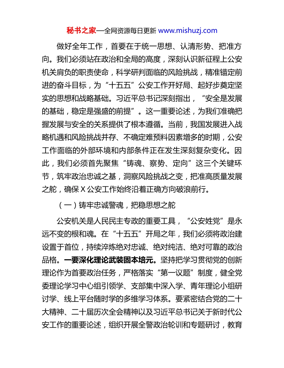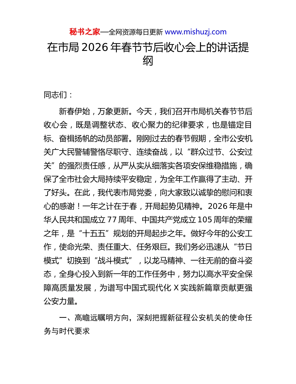 秘书之家—全网资源每日更新 www.mishuzj.com在市局 2026 年春节节后收心会上的讲话提纲同志们:新春伊始,万象更新。今天,我们召开市局机关春节节后收心会,既是调整状态、收心聚力的纪律要求,也是锚定目标、奋楫扬帆的动员部署。刚刚过去的春节假期,全市公安机关广大民警辅警恪尽职守、连续奋战,以“群众过节、公安过关”的强烈责任感,从严从实从细落实各项安保维稳措施,确保了全市社会大局持续平安稳定,为全年工作赢得了主动、开了好头。在此,我代表市局党委,向大家致以诚挚的慰问和衷心的感谢!一年之计在于春,开局起势见精神。2026 年是中华人民共和国成立 77 周年、中国共产党成立 105 周年的荣耀之年,是“十五五”规划的开局起步之年。做好今年的公安工作,使命光荣、责任重大、任务艰巨。我们务必迅速从“节日模式”切换到“战斗模式”,以龙马精神、一往无前的奋斗姿态,全身心投入到新一年的工作任务中,努力以高水平安全保障高质量发展,为谱写中国式现代化 X 实践新篇章贡献更强公安力量。一、高瞻远瞩明方向,深刻把握新征程公安机关的使命任务与时代要求秘书之家—全网资源每日更新 www.mishuzj.com做好全年工作,首要在于统一思想、认清形势、把准方向。我们必须站在政治和全局的高度,深刻认识新征程上公安机关肩负的职责使命,科学研判面临的风险挑战,精准锚定前进的奋斗目标,为“十五五”公安工作开好局、起好步奠定坚实的思想和战略基础。习近平总书记深刻指出,“安全是发展的基础,稳定是强盛的前提”。这一重要论述,为我们准确把握发展与安全的关系提供了根本遵循。当前,我国发展进入战略机遇和风险挑战并存、不确定难预料因素增多的时期,公安工作面临的外部环境和内部条件正在发生深刻复杂变化。因此,我们必须首先聚焦“铸魂、察势、定向”这三个关键环节,筑牢政治忠诚之基,洞察风险挑战之变,把准高质量发展之舵,确保 X 公安工作始终沿着正确方向破浪前行。(一)铸牢忠诚警魂,把稳思想之舵公安机关是人民民主专政的重要工具,“公安姓党”是永远不变的根和魂。在“十五五”开局之年,我们必须将政治建设置于首位,持续淬炼绝对忠诚、绝对纯洁、绝对可靠的政治品格。一要深化理论武装固本培元。坚持把学习贯彻党的创新理论作为首要政治任务,严格落实“第一议题”制度,健全党委理论学习中心组引领学、支部集中深入学、青年理论小组研讨学、线上平台随时学的多维学习体系。要紧密结合党的二十大精神、二十届历次全会精神以及习近平总书记关于新时代公安工作的重要论述,组织开展全警政治轮训和专题研讨,教育秘书之家—全网资源每日更新 www.mishuzj.com引导全体民警深刻领悟“两个确立”的决定性意义,增强“四个意识”、坚定“四个自信”、做到“两个维护”的思想自觉、政治自觉和行动自觉,确保党的路线方针政策在市局机关不折不扣贯彻执行。二要严守政治纪律规矩底线。始终心怀“国之大者”,不断提高政治判断力、政治领悟力、政治执行力。要坚决同一切违背和损害“两个维护”的言行作斗争,严格落实重大事项请示报告制度,确保政令警令绝对畅通。要严肃党内政治生活,严格执行“三会一课”、民主生活会、组织生活会等制度,用好批评和自我批评武器,营造风清气正的政治生态。三要锻造坚强有力战斗堡垒。牢固树立“抓好党建是最大政绩”的理念,深入实施基层党建提质增效工程。持续推进“五星”党支部创建和“一支部一品牌”建设,推动党建与业务工作深度融合、相互促进。要充分发挥党支部在重大任务攻坚、重大风险防控、队伍教育管理中的战斗堡垒作用,把党的政治优势、组织优势转化为推动公安工作现代化的强大效能。(二)科学研判形势,洞察风险之变明者防祸于未萌,智者图患于将来。准确把握“时”与“势”,是制定科学策略、赢得工作主动的前提。我们必须增强忧患意识,坚持底线思维,全面、辩证、长远地审视公安工作面临的内外环境。一方面,要清醒认识外部风险挑战的复杂性严峻性。世界百年变局加速演进,地缘政治冲突加剧,不确秘书之家—全网资源每日更新 www.mishuzj.com定不稳定因素显著增多,维护国...