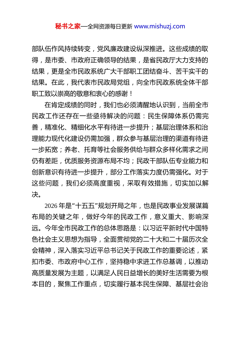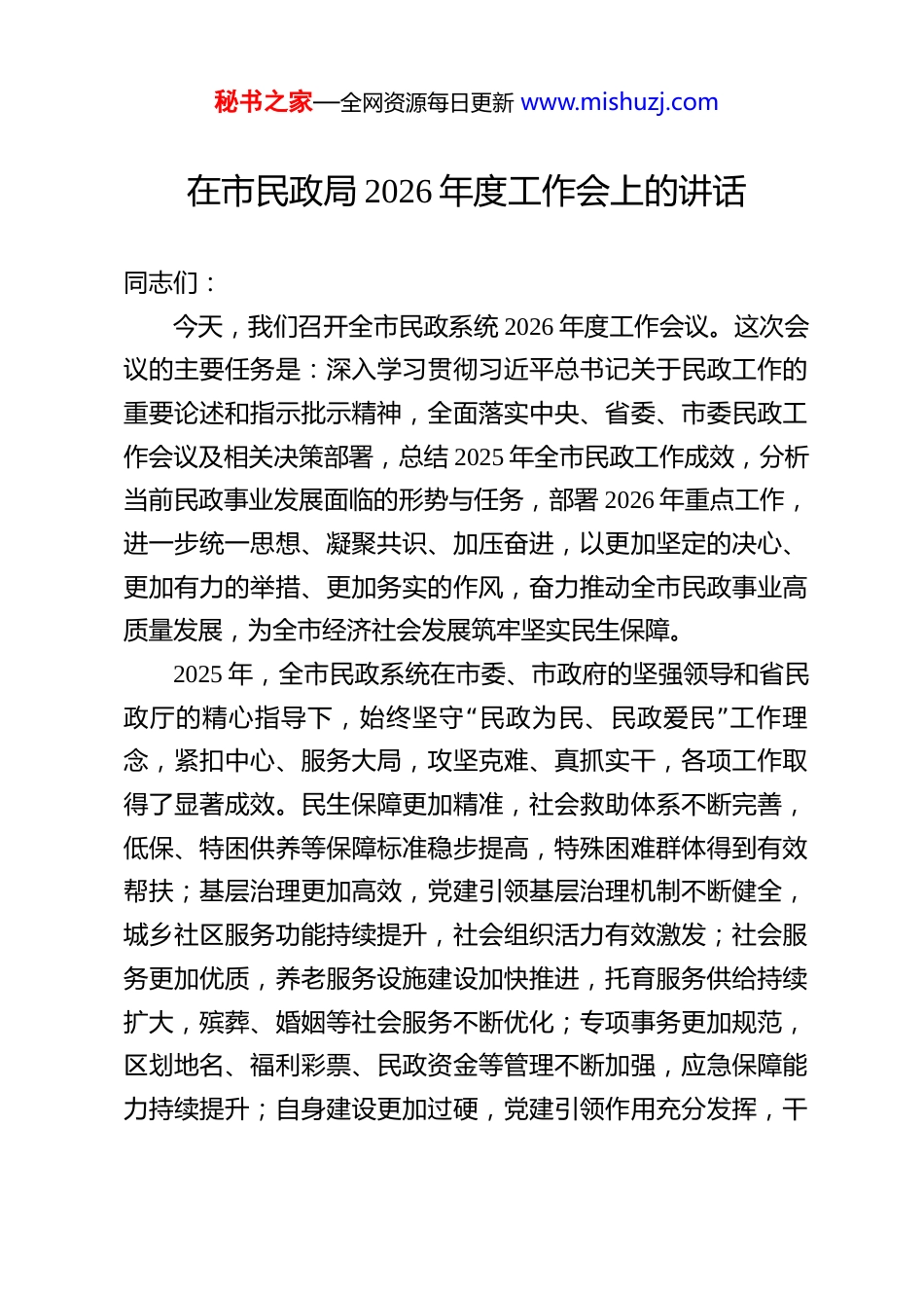 秘书之家—全网资源每日更新 www.mishuzj.com在市民政局 2026 年度工作会上的讲话 同志们:今天,我们召开全市民政系统 2026 年度工作会议。这次会议的主要任务是:深入学习贯彻习近平总书记关于民政工作的重要论述和指示批示精神,全面落实中央、省委、市委民政工作会议及相关决策部署,总结 2025 年全市民政工作成效,分析当前民政事业发展面临的形势与任务,部署 2026 年重点工作,进一步统一思想、凝聚共识、加压奋进,以更加坚定的决心、更加有力的举措、更加务实的作风,奋力推动全市民政事业高质量发展,为全市经济社会发展筑牢坚实民生保障。2025 年,全市民政系统在市委、市政府的坚强领导和省民“”政厅的精心指导下,始终坚守 民政为民、民政爱民 工作理念,紧扣中心、服务大局,攻坚克难、真抓实干,各项工作取得了显著成效。民生保障更加精准,社会救助体系不断完善,低保、特困供养等保障标准稳步提高,特殊困难群体得到有效帮扶;基层治理更加高效,党建引领基层治理机制不断健全,城乡社区服务功能持续提升,社会组织活力有效激发;社会服务更加优质,养老服务设施建设加快推进,托育服务供给持续扩大,殡葬、婚姻等社会服务不断优化;专项事务更加规范,区划地名、福利彩票、民政资金等管理不断加强,应急保障能力持续提升;自身建设更加过硬,党建引领作用充分发挥,干秘书之家—全网资源每日更新 www.mishuzj.com部队伍作风持续转变,党风廉政建设纵深推进。这些成绩的取得,是市委、市政府正确领导的结果,是省民政厅大力支持的结果,更是全市民政系统广大干部职工团结奋斗、苦干实干的结果。在此,我代表市民政局党组,向全市民政系统全体干部职工致以崇高的敬意和衷心的感谢!在肯定成绩的同时,我们也必须清醒地认识到,当前全市民政工作还存在一些亟待解决的问题:民生保障体系仍需完善,精准化、精细化水平有待进一步提升;基层治理体系和治理能力现代化建设仍需加强,群众参与基层治理的渠道有待进一步拓宽;养老、托育等社会服务供给与群众多样化需求之间仍有差距,优质服务资源布局不均;民政干部队伍专业能力和创新意识有待进一步提升,部分工作落实力度仍需强化。对于这些问题,我们必须高度重视,采取有效措施,切实加以解决。2026“”年是 十五五 规划开局之年,也是民政事业发展谋篇布局的关键之年,做好今年的民政工作,意义重大、影响深远。今年全市民政工作的总体思路是:以习近平新时代中国特色社会主义思想为指导,全面贯彻党的二十大和二十届历次全会精神,深入落实习近平总书记关于民政工作的重要论述,紧扣市委、市政府中心工作,坚持稳中求进工作总基调,以推动高质量发展为主题,以满足人民日益增长的美好生活需要为根本目的,聚焦工作重点,切实履行基本民生保障、基层社会治秘书之家—全网资源每日更新 www.mishuzj.com理、基本社会服务核心职能,着力建设精准化、法治化、智能化、社会化的现代民政,奋力谱写全市民政事业高质量发展新篇章。围绕上述总体思路,今年我们要重点抓好五个方面的工作:一、聚力精准兜底,筑牢民生保障防线,在民生福祉提升上实现新跨越民政工作是民生工作的兜底线,特殊困难群体的保障是民政工作的重中之重。我们要始终坚持以人民为中心的发展思想,聚焦低保对象、特困人员、儿童、残疾人等重点群体,健全精准保障体系,织密织牢民生保障网,让困难群众感受到党和政府的温暖。(一)精准识别摸排,做到底数清、情况明。“健全 大数据+网格化+”入户核查 三位一体摸排识别机制,整合民政、乡村振兴、医保、残联、公安、人社等部门数据资源,搭建全市社会救助大数据平台,实现特殊困难群体数据实时共享、动态监测。组织基层干部、网格员开展常态化入户核查,深入了解困难群众实际生活状况,做到村(社区)全覆盖、无死角。完善家庭经济状况核对机制,优化核对流程、拓宽核对范围,提高“核对精准度,确保符合条件的困难群众 应保尽保、应救尽”救 。秘书之家—全网资源每日更新 www.mishuzj.com(二)优化政策体系,做到标准实、效能高。严格落实上级社会救助政策,结合我市经济社会...