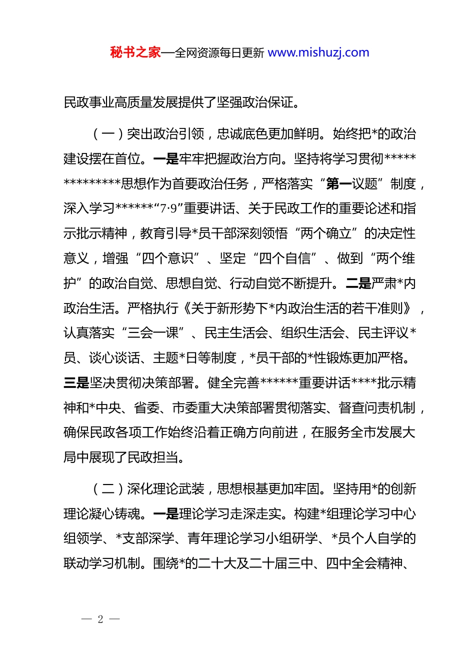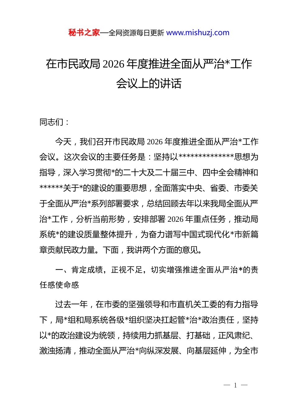 秘书之家—全网资源每日更新 www.mishuzj.com在市民政局 2026 年度推进全面从严治*工作会议上的讲话同志们:今天,我们召开市民政局 2026 年度推进全面从严治*工作会议。这次会议的主要任务是:坚持以**************思想为指导,深入学习贯彻*的二十大及二十届三中、四中全会精神和******关于*的建设的重要思想,全面落实中央、省委、市委关于全面从严治*系列部署要求,总结回顾去年以来我局全面从严治*工作,分析当前形势,安排部署 2026 年重点任务,推动局系统*的建设质量整体提升,为奋力谱写中国式现代化*市新篇章贡献民政力量。下面,我讲两个方面的意见。一、肯定成绩,正视不足,切实增强推进全面从严治*的责任感使命感过去一年,在市委的坚强领导和市直机关工委的有力指导下,局*组和局系统各级*组织坚决扛起管*治*政治责任,坚持以*的政治建设为统领,持续用力抓基层、打基础,正风肃纪、激浊扬清,推动全面从严治*向纵深发展、向基层延伸,为全市— 1 —秘书之家—全网资源每日更新 www.mishuzj.com民政事业高质量发展提供了坚强政治保证。(一)突出政治引领,忠诚底色更加鲜明。始终把*的政治建设摆在首位。一是牢牢把握政治方向。坚持将学习贯彻**************思想作为首要政治任务,严格落实“第一议题”制度,深入学习******“7·9”重要讲话、关于民政工作的重要论述和指示批示精神,教育引导*员干部深刻领悟“两个确立”的决定性意义,增强“四个意识”、坚定“四个自信”、做到“两个维护”的政治自觉、思想自觉、行动自觉不断提升。二是严肃*内政治生活。严格执行《关于新形势下*内政治生活的若干准则》,认真落实“三会一课”、民主生活会、组织生活会、民主评议*员、谈心谈话、主题*日等制度,*员干部的*性锻炼更加严格。三是坚决贯彻决策部署。健全完善******重要讲话****批示精神和*中央、省委、市委重大决策部署贯彻落实、督查问责机制,确保民政各项工作始终沿着正确方向前进,在服务全市发展大局中展现了民政担当。(二)深化理论武装,思想根基更加牢固。坚持用*的创新理论凝心铸魂。一是理论学习走深走实。构建*组理论学习中心组领学、*支部深学、青年理论学习小组研学、*员个人自学的联动学习机制。围绕*的二十大及二十届三中、四中全会精神、— 2 —秘书之家—全网资源每日更新 www.mishuzj.com******关于民生民政工作系列重要论述等,组织专题学习研讨、辅导报告,*员干部的政治判断力、政治领悟力、政治执行力有效提升。二是教育形式丰富多样。结合民政工作实际,开展“走进福利院、感悟为民情”“深入社区、服务基层”等主题*日活动,将学习课堂搬到服务群众一线。利用*市红色教育资源,开展革命传统教育,传承红色基因。三是研究阐释结合实际。围绕基本民生保障、基层社会治理、基本社会服务等民政主责主业,组织开展专题调研和理论研讨,努力把学习成果转化为推动民政事业改革发展的思路举措。(三)夯实基层基础,组织体系更加健全。牢固树立大抓基层的鲜明导向。一是支部建设规范提升。持续推进*支部标准化规范化建设,严格落实《中国共产*支部工作条例(试行)》,开展*支部“对标晋级”活动,一批基层*组织战斗堡垒作用更加凸显。二是 dj 业务深度融合。积极探索“dj+”模式,推动 dj工作与养老服务、儿童福利、社会救助、社区治理、殡葬改革、区划地名等业务工作同谋划、同部署、同落实。在重点项目、重大任务一线设立“*员责任区”“*员先锋岗”,引导*员在兜牢民生底线、优化公共服务中当先锋、作表率。三是*员队伍活力增强。严把*员发展“入口关”,加强*员教育管理监督,落— 3 —秘书之家—全网资源每日更新 www.mishuzj.com实*内关怀帮扶机制。组织开展“*员亮身份、服务暖民心”等活动,*员先锋模范作用在为民服务中得到充分发挥。(四)持续正风肃纪,政治生态更加清朗。始终坚持严的基调不动摇。一是作风建设常抓不懈。深入开展干部作风能力提升年活动,大力整治形式主义、官僚主义,着力纠治“慵懒散慢虚粗”等不良习气。严格落实中央八项规定及其实施细则精神,健全为基层减负长效机制,文件会议、督查检...