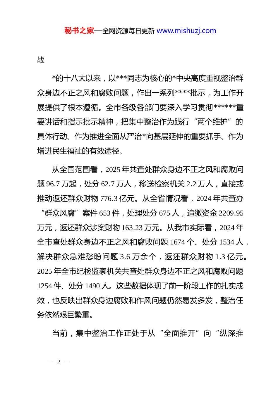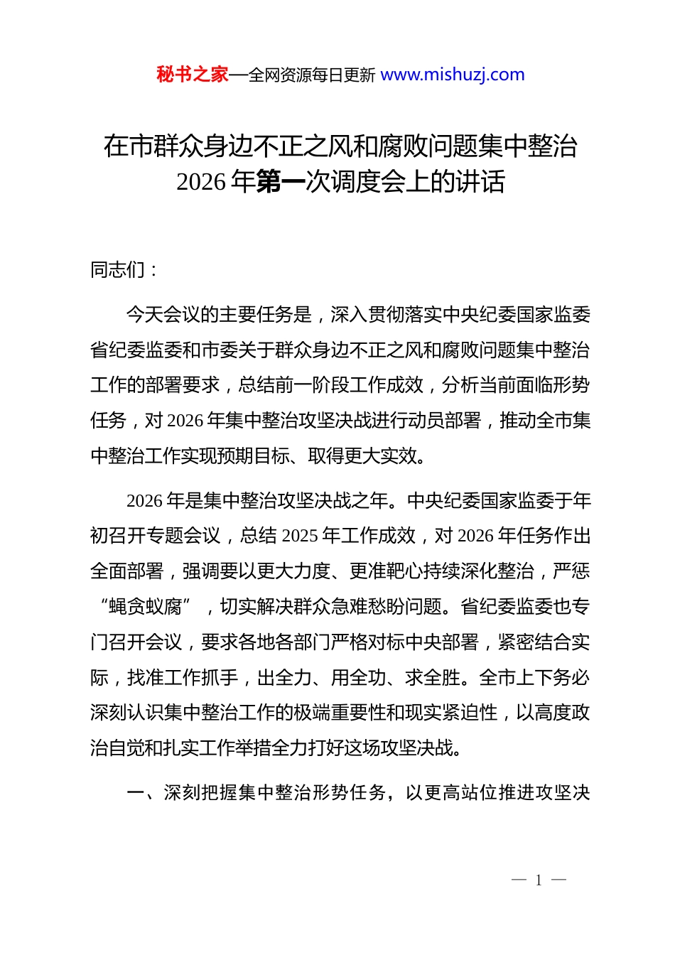 秘书之家—全网资源每日更新 www.mishuzj.com在市群众身边不正之风和腐败问题集中整治2026 年第一次调度会上的讲话同志们:今天会议的主要任务是,深入贯彻落实中央纪委国家监委省纪委监委和市委关于群众身边不正之风和腐败问题集中整治工作的部署要求,总结前一阶段工作成效,分析当前面临形势任务,对 2026 年集中整治攻坚决战进行动员部署,推动全市集中整治工作实现预期目标、取得更大实效。2026 年是集中整治攻坚决战之年。中央纪委国家监委于年初召开专题会议,总结 2025 年工作成效,对 2026 年任务作出全面部署,强调要以更大力度、更准靶心持续深化整治,严惩“蝇贪蚁腐”,切实解决群众急难愁盼问题。省纪委监委也专门召开会议,要求各地各部门严格对标中央部署,紧密结合实际,找准工作抓手,出全力、用全功、求全胜。全市上下务必深刻认识集中整治工作的极端重要性和现实紧迫性,以高度政治自觉和扎实工作举措全力打好这场攻坚决战。一、深刻把握集中整治形势任务,以更高站位推进攻坚决— 1 —秘书之家—全网资源每日更新 www.mishuzj.com战*的十八大以来,以***同志为核心的*中央高度重视整治群众身边不正之风和腐败问题,作出一系列****批示,为工作开展提供了根本遵循。全市各级各部门要深入学习贯彻******重要讲话和指示批示精神,把集中整治作为践行“两个维护”的具体行动、作为推进全面从严治*向基层延伸的重要抓手、作为增进民生福祉的有效途径。从全国范围看,2025 年共查处群众身边不正之风和腐败问题 96.7 万起,处分 62.7 万人,移送检察机关 2.2 万人,直接或推动返还群众财物 776.3 亿元。从全省情况看,2024 年共查办“群众风腐”案件 653 件,处理处分 675 人,追缴资金 2209.95万元,返还群众涉案财物 163.23 万元。从我市实际看,2024 年全市查处群众身边不正之风和腐败问题 1674 个、处分 1534 人,解决群众急难愁盼问题 3.6 万余个,返还群众财物 1.3 亿元。2025 年全市纪检监察机关共查处群众身边不正之风和腐败问题1254 件、处分 1490 人。这些数据体现了前一阶段工作的扎实成效,也反映出群众身边腐败和作风问题仍然易发多发,整治任务依然艰巨繁重。当前,集中整治工作正处于从“全面推开”向“纵深推— 2 —秘书之家—全网资源每日更新 www.mishuzj.com进”转变、从“集中攻坚”向“常态长效”拓展的关键阶段。要清醒认识到,群众身边腐败问题存量尚未清底、增量仍有发生,教育医疗、养老社保、农村“三资”等重点领域问题依然突出,一些地方和部门责任落实不够到位、工作推进不够平衡、制度机制不够完善。各地各部门必须以攻坚决战的姿态,想尽一切办法、调动一切资源、克服一切困难,推动集中整治工作取得更大成效。二、坚定落实集中整治各项部署,以更实举措攻坚重点领域中央纪委国家监委明确,2026 年整治工作将围绕“力度更大、靶心更准”的思路推进,重点整治农村集体“三资”管理、医保基金、养老服务、高标准农田建设等领域问题。省纪委监委在政府工作报告中专门强调,要深化整治校园殡葬、高标准农田建设、农村集体“三资”管理、医保基金管理等领域群众身边不正之风和腐败问题。全市上下要紧扣这些重点领域,精准发力、持续攻坚。在教育领域,要紧盯学校食堂管理、物资采购、工程建设招生录取等关键环节,严肃查处虚报冒领、克扣截留、收受回扣等违纪违法行为。加强师德师风建设,坚决整治在职教师有— 3 —秘书之家—全网资源每日更新 www.mishuzj.com偿补课、违规收受礼品礼金等问题。规范教育收费行为,杜绝乱收费、乱摊派、乱集资现象。在医疗领域,要聚焦药品耗材采购、设备购置、工程建设等重点环节,严查医药领域腐败问题。着力整治虚假诊疗、过度医疗、欺诈骗保等侵害群众利益行为。规范医疗服务行为,整治收受红包、开单提成、违规转诊等问题。今年要在全市公立医院推进纪检组织规范化建设,以规范监督筑牢医疗廉洁屏障。在养老社保领域,要严厉打击侵占养老保险金、挪用养老社保资金等违纪违法行为。规范养老服务资金使用管理,严查虚报冒领、截留挪用、优亲厚友等问...