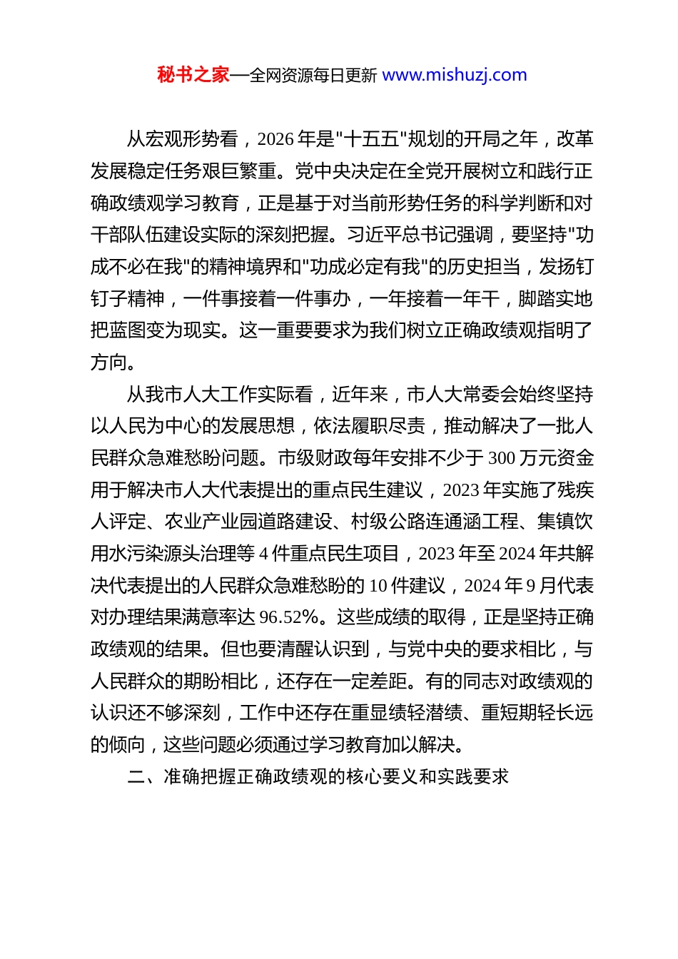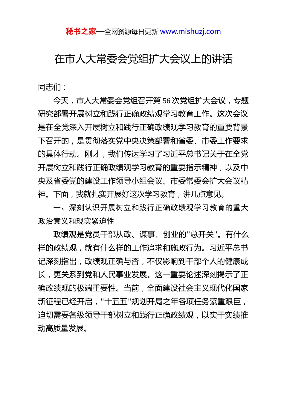 秘书之家—全网资源每日更新 www.mishuzj.com在市人大常委会党组扩大会议上的讲话 同志们:今天,市人大常委会党组召开第 56 次党组扩大会议,专题研究部署开展树立和践行正确政绩观学习教育工作。这次会议是在全党深入开展树立和践行正确政绩观学习教育的重要背景下召开的,是贯彻落实党中央决策部署和省委、市委工作要求的具体行动。刚才,我们传达学习了习近平总书记关于在全党开展树立和践行正确政绩观学习教育的重要指示精神,以及中央及省委党的建设工作领导小组会议、市委常委会扩大会议精神。下面,我就扎实开展好这次学习教育,讲几点意见。一、深刻认识开展树立和践行正确政绩观学习教育的重大政治意义和现实紧迫性政绩观是党员干部从政、谋事、创业的"总开关"。有什么样的政绩观,就有什么样的工作追求和施政行为。习近平总书记深刻指出,政绩观正确与否,不仅影响到干部个人的健康成长,更关系到党和人民事业发展。这一重要论述深刻揭示了正确政绩观的极端重要性。当前,全面建设社会主义现代化国家新征程已经开启,"十五五"规划开局之年各项任务繁重艰巨,迫切需要各级领导干部树立和践行正确政绩观,以实干实绩推动高质量发展。秘书之家—全网资源每日更新 www.mishuzj.com从宏观形势看,2026 年是"十五五"规划的开局之年,改革发展稳定任务艰巨繁重。党中央决定在全党开展树立和践行正确政绩观学习教育,正是基于对当前形势任务的科学判断和对干部队伍建设实际的深刻把握。习近平总书记强调,要坚持"功成不必在我"的精神境界和"功成必定有我"的历史担当,发扬钉钉子精神,一件事接着一件事办,一年接着一年干,脚踏实地把蓝图变为现实。这一重要要求为我们树立正确政绩观指明了方向。从我市人大工作实际看,近年来,市人大常委会始终坚持以人民为中心的发展思想,依法履职尽责,推动解决了一批人民群众急难愁盼问题。市级财政每年安排不少于 300 万元资金用于解决市人大代表提出的重点民生建议,2023 年实施了残疾人评定、农业产业园道路建设、村级公路连通涵工程、集镇饮用水污染源头治理等 4 件重点民生项目,2023 年至 2024 年共解决代表提出的人民群众急难愁盼的 10 件建议,2024 年 9 月代表对办理结果满意率达 96.52%。这些成绩的取得,正是坚持正确政绩观的结果。但也要清醒认识到,与党中央的要求相比,与人民群众的期盼相比,还存在一定差距。有的同志对政绩观的认识还不够深刻,工作中还存在重显绩轻潜绩、重短期轻长远的倾向,这些问题必须通过学习教育加以解决。二、准确把握正确政绩观的核心要义和实践要求秘书之家—全网资源每日更新 www.mishuzj.com习近平总书记关于树立和践行正确政绩观的重要论述,系统回答了"为谁创造业绩、创造什么样的业绩、怎样创造业绩"这一根本问题,内涵丰富、思想深邃,必须深入学习领会、准确把握精神实质。第一,坚持以人民为中心是正确政绩观的核心灵魂。习近平总书记强调,要将为民造福作为最大政绩,把人民对美好生活的向往作为奋斗目标,坚持权为民所用、情为民所系、利为民所谋。政绩好不好,最终要看人民群众满不满意、答不答应。我市 2023 年一般公共预算民生支出占比提升至 74.8%,这充分体现了以人民为中心的发展思想。人大作为代表机关、权力机关,更要牢固树立人民至上理念,把人民群众的利益放在首位,把人民群众的呼声作为第一信号,把人民群众的满意作为第一标准。第二,坚持实事求是是正确政绩观的根本方法。实事求是是实现政绩的基本途径,必须从实际出发谋划事业和工作,符合实际情况、客观规律和科学精神,坚决反对形式主义、官僚主义和弄虚作假。2023 年市政府收到市人大常委会交办的市人大代表建议 142 件,其中已解决或基本解决的有 95 件,这一成绩的取得正是坚持实事求是的结果。在学习教育中,要深入查找工作中是否存在脱离实际、好大喜功、弄虚作假等问题,切实加以整改。秘书之家—全网资源每日更新 www.mishuzj.com第三,坚持求真务实是正确政绩观的鲜明品格。要真抓实干、狠抓落实,力戒形式主义、官僚主义,不搞脱离实际的盲目攀比、不搞劳民伤财的形象工...