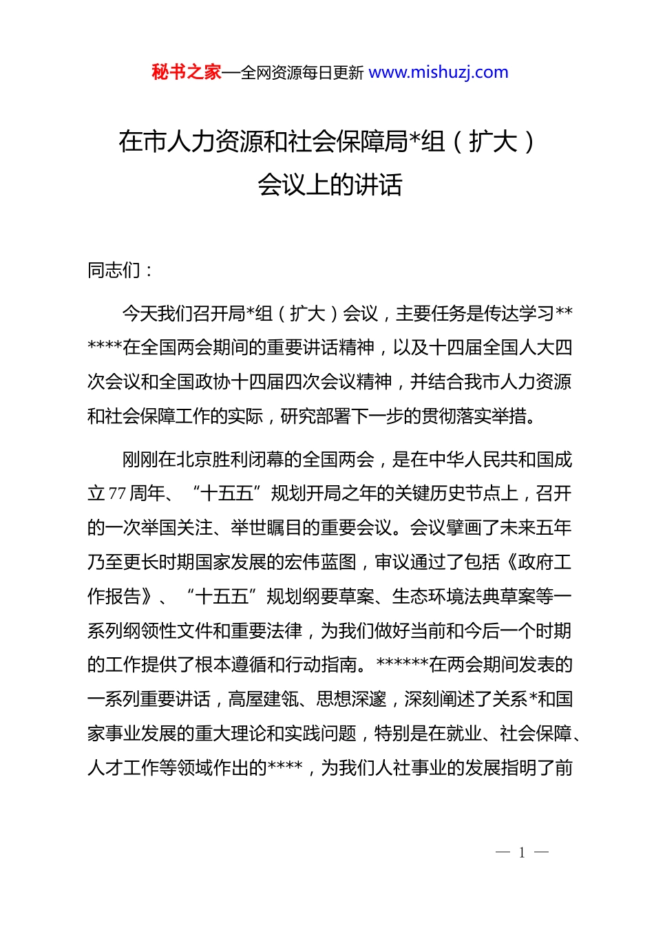 秘书之家—全网资源每日更新 www.mishuzj.com在市人力资源和社会保障局*组(扩大)会议上的讲话同志们:今天我们召开局*组(扩大)会议,主要任务是传达学习******在全国两会期间的重要讲话精神,以及十四届全国人大四次会议和全国政协十四届四次会议精神,并结合我市人力资源和社会保障工作的实际,研究部署下一步的贯彻落实举措。刚刚在北京胜利闭幕的全国两会,是在中华人民共和国成立 77 周年、“十五五”规划开局之年的关键历史节点上,召开的一次举国关注、举世瞩目的重要会议。会议擘画了未来五年乃至更长时期国家发展的宏伟蓝图,审议通过了包括《政府工作报告》、“十五五”规划纲要草案、生态环境法典草案等一系列纲领性文件和重要法律,为我们做好当前和今后一个时期的工作提供了根本遵循和行动指南。******在两会期间发表的一系列重要讲话,高屋建瓴、思想深邃,深刻阐述了关系*和国家事业发展的重大理论和实践问题,特别是在就业、社会保障、人才工作等领域作出的****,为我们人社事业的发展指明了前— 1 —秘书之家—全网资源每日更新 www.mishuzj.com进方向。全局系统必须将学习好、宣传好、贯彻好******重要讲话和全国两会精神,作为当前首要的政治任务。要深刻领悟“两个确立”的决定性意义,坚决做到“两个维护”,切实把思想和行动统一到*中央的决策部署上来,将学习成果转化为推动我市人社事业高质量发展的强大动力和具体实践。下面,我结合我局工作实际,谈几点贯彻落实的意见。一、深刻领会两会精神实质,牢牢把握人社工作的政治方向与时代使命今年的全国两会,释放了一系列强烈的政策信号,为我们理解和把握人社工作的时代方位提供了清晰坐标。一是要深刻把握“高质量发展”这一首要任务。政府工作报告明确将高质量发展作为全面建设社会主义现代化国家的首要任务,并强调构建就业友好型发展方式。人力资源和社会保障工作是经济社会发展的重要组成部分,必须主动融入和服务于高质量发展大局。我们要清醒地认识到,推动高质量发展,核心在于创新驱动,根本在于人才支撑。人社部门作为人才工作的重要职能部门,责任重大。我们不能再简单地把就业看作— 2 —秘书之家—全网资源每日更新 www.mishuzj.com是“找饭碗”,而是要将其视为优化人力资源配置、提升全要素生产率的关键环节。社会保障也不再是简单的兜底,而是调节社会收入分配、促进社会公平、激发经济活力的重要制度安排。二是要深刻把握“以人民为中心”这一根本立场。政府工作报告中,“就业”和“民生”是高频词,明确提出 2026 年城镇新增就业 1200 万人以上、城镇调查失业率 5.5%左右的目标,并强调要织密扎牢社会保障网,稳步提高各项社保待遇水平。这充分体现了*中央对民生福祉的高度关切。人社工作本质上是群众工作,每一项政策、每一份服务都直接关系到人民群众的切身利益。我们必须始终坚持人民至上,把群众的急难愁盼问题作为工作的出发点和落脚点,用我们的“辛苦指数”换取人民群众的“幸福指数”,不断增强人民群众的获得感、幸福感、安全感。三是要深刻把握“改革创新”这一核心动力。两会期间,代表委员围绕人才评价制度、新就业形态劳动者权益保障、技能人才培养等热点难点问题建言献策,国家层面也强调要深化重点领域改革。当前,我市人社领域也面临着诸多挑战,比如高校毕业生等重点群体的就业压力、新就业形态劳动者权益保— 3 —秘书之家—全网资源每日更新 www.mishuzj.com障的制度短板、高层次和高技能人才的结构性短缺等。面对这些新情况新问题,因循守旧没有出路,我们必须发扬改革创新精神,敢于啃“硬骨头”,勇于涉“深水区”,通过制度创新和流程再造,破解发展难题,激发事业活力。二、聚焦两会部署关键任务,奋力开创我市人社事业高质量发展新局面学习贯彻两会精神,关键在于落实。我们要紧密结合我市2026 年地区生产总值增长 5.5%左右、城镇新增就业 16 万人以上等核心经济社会发展目标将两会精神具体化、项目化、责任化,确保各项决策部署在我市人社系统落地生根、开花结果。第一,全力以赴实施就业优先战略,筑牢民生之本。就业是最大的民生。...