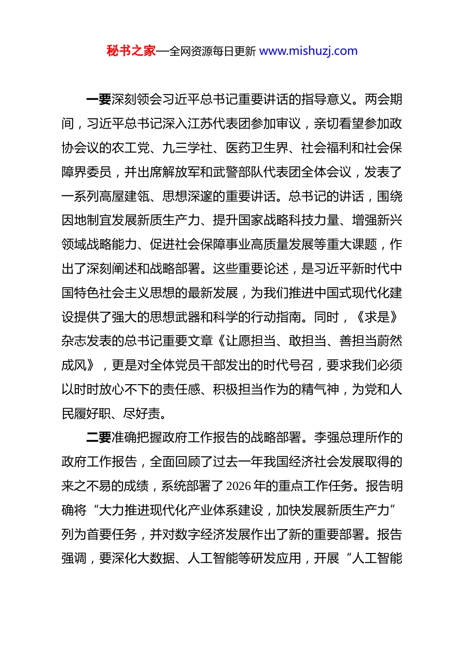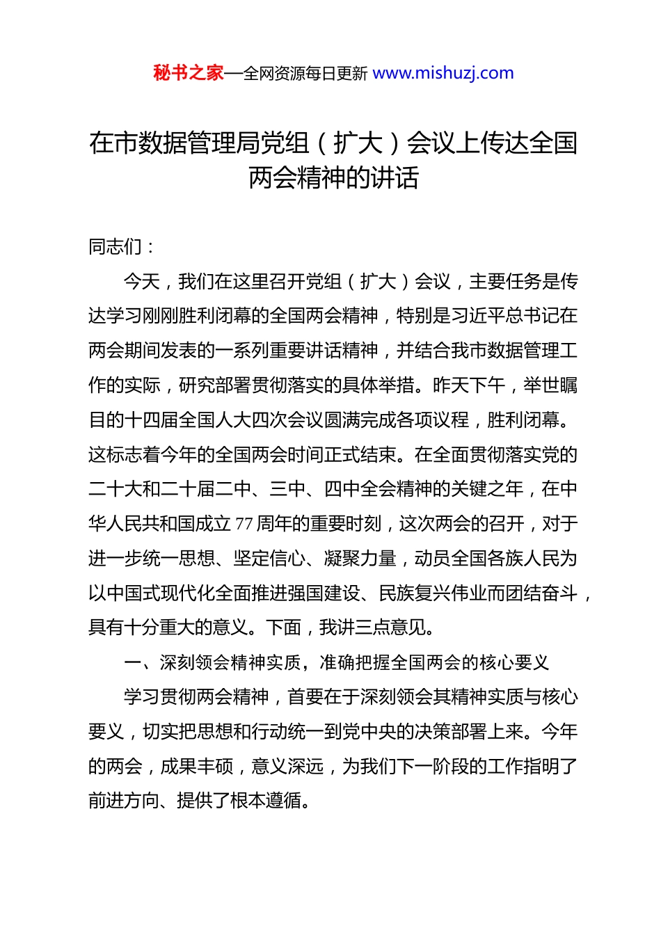 秘书之家—全网资源每日更新 www.mishuzj.com在市数据管理局党组(扩大)会议上传达全国两会精神的讲话 同志们:今天,我们在这里召开党组(扩大)会议,主要任务是传达学习刚刚胜利闭幕的全国两会精神,特别是习近平总书记在两会期间发表的一系列重要讲话精神,并结合我市数据管理工作的实际,研究部署贯彻落实的具体举措。昨天下午,举世瞩目的十四届全国人大四次会议圆满完成各项议程,胜利闭幕。这标志着今年的全国两会时间正式结束。在全面贯彻落实党的二十大和二十届二中、三中、四中全会精神的关键之年,在中华人民共和国成立 77 周年的重要时刻,这次两会的召开,对于进一步统一思想、坚定信心、凝聚力量,动员全国各族人民为以中国式现代化全面推进强国建设、民族复兴伟业而团结奋斗,具有十分重大的意义。下面,我讲三点意见。一、深刻领会精神实质,准确把握全国两会的核心要义学习贯彻两会精神,首要在于深刻领会其精神实质与核心要义,切实把思想和行动统一到党中央的决策部署上来。今年的两会,成果丰硕,意义深远,为我们下一阶段的工作指明了前进方向、提供了根本遵循。秘书之家—全网资源每日更新 www.mishuzj.com一要深刻领会习近平总书记重要讲话的指导意义。两会期间,习近平总书记深入江苏代表团参加审议,亲切看望参加政协会议的农工党、九三学社、医药卫生界、社会福利和社会保障界委员,并出席解放军和武警部队代表团全体会议,发表了一系列高屋建瓴、思想深邃的重要讲话。总书记的讲话,围绕因地制宜发展新质生产力、提升国家战略科技力量、增强新兴领域战略能力、促进社会保障事业高质量发展等重大课题,作出了深刻阐述和战略部署。这些重要论述,是习近平新时代中国特色社会主义思想的最新发展,为我们推进中国式现代化建设提供了强大的思想武器和科学的行动指南。同时,《求是》杂志发表的总书记重要文章《让愿担当、敢担当、善担当蔚然成风》,更是对全体党员干部发出的时代号召,要求我们必须以时时放心不下的责任感、积极担当作为的精气神,为党和人民履好职、尽好责。二要准确把握政府工作报告的战略部署。李强总理所作的政府工作报告,全面回顾了过去一年我国经济社会发展取得的来之不易的成绩,系统部署了 2026 年的重点工作任务。报告明确将“大力推进现代化产业体系建设,加快发展新质生产力”列为首要任务,并对数字经济发展作出了新的重要部署。报告强调,要深化大数据、人工智能等研发应用,开展“人工智能秘书之家—全网资源每日更新 www.mishuzj.com+”行动,打造具有国际竞争力的数字产业集群。特别值得关注的是,报告将数据中心、算力中心的发展提到了新的高度,提出要建设超大规模智算集群,推动算电协同发展,构建全国一体化算力监测调度体系。这些部署,充分彰显了党中央将数字经济视为推动高质量发展的核心引擎的战略决心也为我们数据管理部门的工作划定了重点、明确了靶心。三要全面贯彻两会审议通过的各项决议决定。本次两会审议批准了国民经济和社会发展计划、中央和地方预算,审议通过了全国人大常委会、最高人民法院、最高人民检察院的工作报告。这些文件和报告,全面贯彻了党中央的决策部署,体现了全国人民的共同意志,是指导我们全年工作的纲领性文件。全局上下必须认真学习、坚决执行,确保中央政令畅通,确保各项工作始终沿着正确的政治方向前进。二、聚焦主责主业,找准数字 XX 建设服务中心大局的切入点和着力点学习领会两会精神,关键在于结合实际、推动工作。作为全市数字化建设的主管部门,必须自觉将工作置于全国、全省、全市的发展大局中去思考和谋划,以更高站位、更实举措,奋力开创数字 XX 建设新局面。一是要在服务和发展新质生产力上展现新作为。两会精神秘书之家—全网资源每日更新 www.mishuzj.com的核心之一,就是加快发展新质生产力。数字经济本身就是新质生产力的重要组成部分。XX 市的数字经济规模持续壮大,预计已突破 5000 亿元大关,占地区生产总值的比重不断提升已经成为经济增长的主引擎。下一步,必须乘势而上,推动数字经济从“量的扩张”转向“质的提升”。一方面,要筑牢数...