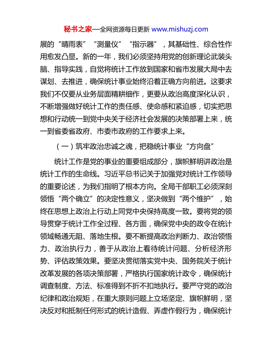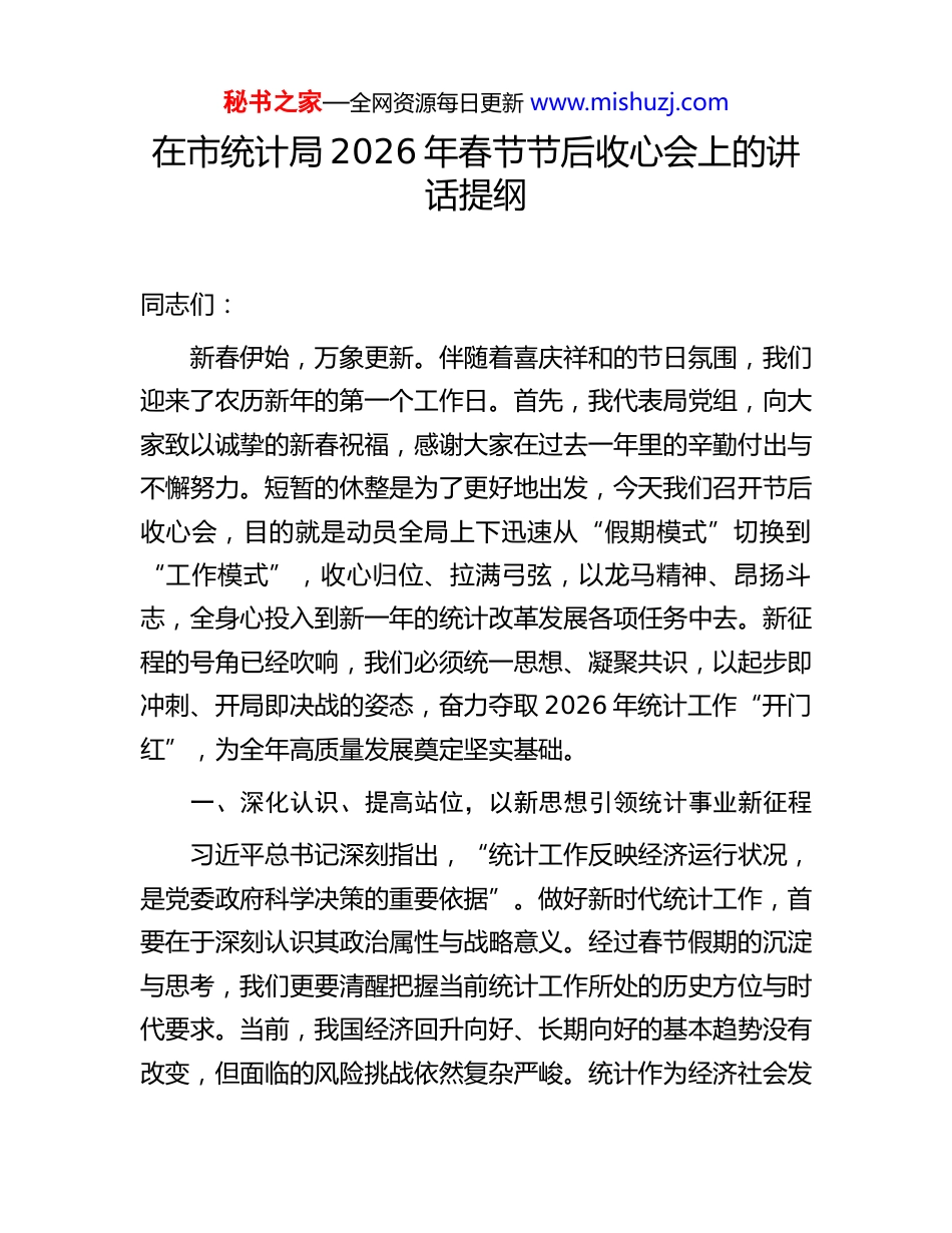 秘书之家—全网资源每日更新 www.mishuzj.com在市统计局 2026 年春节节后收心会上的讲话提纲同志们:新春伊始,万象更新。伴随着喜庆祥和的节日氛围,我们迎来了农历新年的第一个工作日。首先,我代表局党组,向大家致以诚挚的新春祝福,感谢大家在过去一年里的辛勤付出与不懈努力。短暂的休整是为了更好地出发,今天我们召开节后收心会,目的就是动员全局上下迅速从“假期模式”切换到“工作模式”,收心归位、拉满弓弦,以龙马精神、昂扬斗志,全身心投入到新一年的统计改革发展各项任务中去。新征程的号角已经吹响,我们必须统一思想、凝聚共识,以起步即冲刺、开局即决战的姿态,奋力夺取 2026 年统计工作“开门红”,为全年高质量发展奠定坚实基础。一、深化认识、提高站位,以新思想引领统计事业新征程习近平总书记深刻指出,“统计工作反映经济运行状况,是党委政府科学决策的重要依据”。做好新时代统计工作,首要在于深刻认识其政治属性与战略意义。经过春节假期的沉淀与思考,我们更要清醒把握当前统计工作所处的历史方位与时代要求。当前,我国经济回升向好、长期向好的基本趋势没有改变,但面临的风险挑战依然复杂严峻。统计作为经济社会发秘书之家—全网资源每日更新 www.mishuzj.com展的“晴雨表”“测量仪”“指示器”,其基础性、综合性作用愈发凸显。新的一年,我们必须坚持用党的创新理论武装头脑、指导实践,自觉将统计工作放到国家和省市发展大局中去谋划、去推进,确保统计事业始终沿着正确方向前进。这要求我们不仅要从业务层面精耕细作,更要从政治高度深化认识,不断增强做好统计工作的责任感、使命感和紧迫感,切实把思想和行动统一到党中央关于经济社会发展的决策部署上来,统一到省委省政府、市委市政府的工作要求上来。(一)筑牢政治忠诚之魂,把稳统计事业“方向盘”统计工作是党的事业的重要组成部分,旗帜鲜明讲政治是统计工作的生命线。习近平总书记关于加强党对统计工作领导的重要论述,为我们指明了根本方向。全局干部职工必须深刻领悟“两个确立”的决定性意义,坚决做到“两个维护”,始终在思想上政治上行动上同党中央保持高度一致。要将党的领导贯穿于统计工作全过程、各方面,确保党中央的政令在统计领域畅通无阻、落地生根。要不断提高政治判断力、政治领悟力、政治执行力,善于从政治上看待统计问题、分析经济形势、评估政策效果。要坚决贯彻落实党中央、国务院关于统计改革发展的各项决策部署,严格执行国家统计政令,确保统计调查制度、方法、标准得到不折不扣地执行。要严守党的政治纪律和政治规矩,在重大原则问题上立场坚定、旗帜鲜明,坚决反对和抵制任何形式的统计造假、弄虚作假行为,确保统计秘书之家—全网资源每日更新 www.mishuzj.com数据真实准确、完整及时,切实维护政府统计的公信力。要持续巩固拓展主题教育成果,建立健全长效机制,将学习成果转化为推动统计工作高质量发展的强大动力和实际成效,使统计工作更好服务党和国家中心工作,服务宏观决策和社会公众。(二)胸怀国之大者之责,提升服务决策“贡献度”“国之大者”关乎发展全局、事业根本。统计工作必须紧紧围绕“国之大者”来展开,做到党中央关心什么、强调什么,国家需要什么、人民期盼什么,统计调查监测就聚焦什么、服务什么。要深刻把握新发展阶段、完整准确全面贯彻新发展理念、主动服务和融入新发展格局,紧密跟踪监测国家重大战略、重大政策、重大改革在 X 市的实施效果。要聚焦高质量发展这一首要任务,加快构建现代化统计调查体系,完善反映高质量发展的统计指标,加强对科技创新、共同富裕、绿色低碳、安全发展等重点领域的统计监测分析。要密切监测经济运行态势,强化对先行指标、同步指标、滞后指标的深度分析,提高对经济形势研判的前瞻性、精准性,及时发现苗头性、倾向性、潜在性问题,为市委市政府精准调控、有效施策提供坚实可靠的统计支撑。要围绕市委 X 届 X 次全会确定的目标任务和年度重点工作,找准统计服务的切入点和着力点,拓展统计分析研究的广度与深度,提升统计产品的针对性、实用性和时效性,努力打造一批数据详...