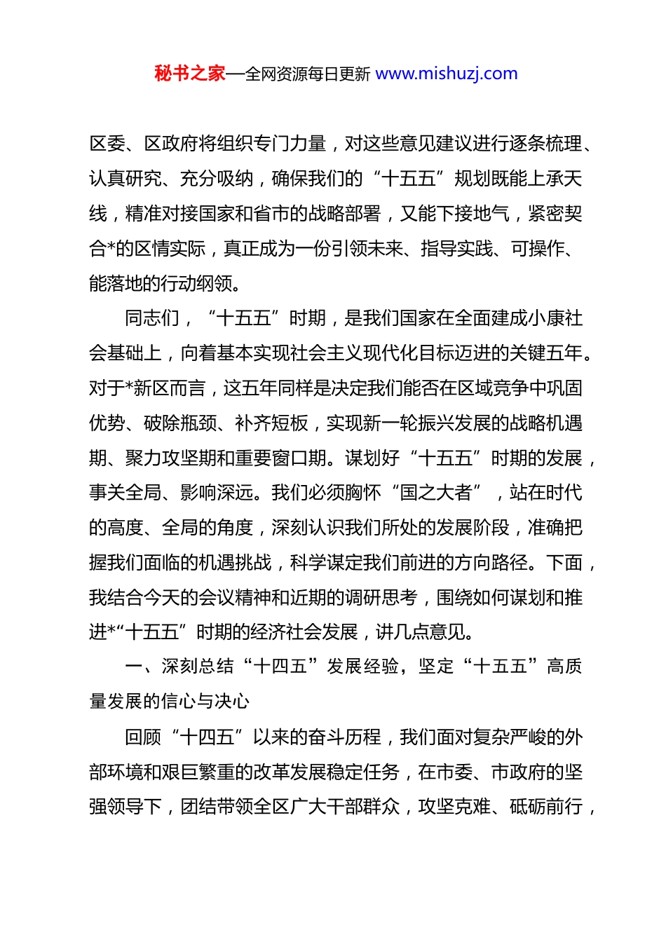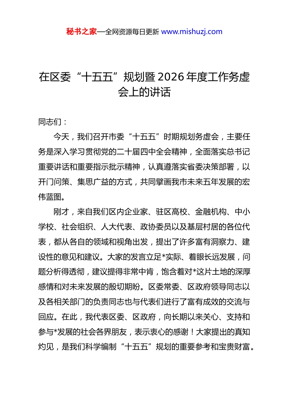 秘书之家—全网资源每日更新 www.mishuzj.com在区委“十五五”规划暨 2026 年度工作务虚会上的讲话同志们:今天,我们召开市委“十五五”时期规划务虚会,主要任务是深入学习贯彻党的二十届四中全会精神,全面落实总书记重要讲话和重要指示批示精神,认真遵落实省委决策部署,以开门问策、集思广益的方式,共同擘画我市未来五年发展的宏伟蓝图。刚才,来自我们区内企业家、驻区高校、金融机构、中小学校、社会组织、人大代表、政协委员以及基层村居的各位代表,都从各自的领域和视角出发,提出了许多富有洞察力、建设性的意见和建议。大家的发言立足*实际、着眼长远发展,问题分析得透彻,建议提得非常中肯,饱含着对*这片土地的深厚感情和对未来发展的殷切期盼。区委常委、区政府领导同志以及各相关部门的负责同志也与代表们进行了富有成效的交流与回应。在此,我代表区委、区政府,向长期以来关心、支持和参与*发展的社会各界朋友,表示衷心的感谢!大家提出的真知灼见,是我们科学编制“十五五”规划的重要参考和宝贵财富。秘书之家—全网资源每日更新 www.mishuzj.com区委、区政府将组织专门力量,对这些意见建议进行逐条梳理、认真研究、充分吸纳,确保我们的“十五五”规划既能上承天线,精准对接国家和省市的战略部署,又能下接地气,紧密契合*的区情实际,真正成为一份引领未来、指导实践、可操作、能落地的行动纲领。同志们,“十五五”时期,是我们国家在全面建成小康社会基础上,向着基本实现社会主义现代化目标迈进的关键五年。对于*新区而言,这五年同样是决定我们能否在区域竞争中巩固优势、破除瓶颈、补齐短板,实现新一轮振兴发展的战略机遇期、聚力攻坚期和重要窗口期。谋划好“十五五”时期的发展,事关全局、影响深远。我们必须胸怀“国之大者”,站在时代的高度、全局的角度,深刻认识我们所处的发展阶段,准确把握我们面临的机遇挑战,科学谋定我们前进的方向路径。下面,我结合今天的会议精神和近期的调研思考,围绕如何谋划和推进*“十五五”时期的经济社会发展,讲几点意见。一、深刻总结“十四五”发展经验,坚定“十五五”高质量发展的信心与决心回顾“十四五”以来的奋斗历程,我们面对复杂严峻的外部环境和艰巨繁重的改革发展稳定任务,在市委、市政府的坚强领导下,团结带领全区广大干部群众,攻坚克难、砥砺前行,秘书之家—全网资源每日更新 www.mishuzj.com推动经济社会发展取得了来之不易的成就。这为我们开启“十五五”新征程奠定了坚实基础。我们深刻体会到,高质量发展是硬道理,综合实力迈上了新台阶。“十四五”期间,我们始终坚持发展是第一要务,全力以赴抓项目、兴产业、强实体。根据市级统计数据,全市地区生产总值从 2020 年的 6923 亿元稳步增长,到 2024 年已突破 9000 亿元大关,年均增长率达到 5.5%。在全市强劲的发展势头带动下,我区经济也保持了稳健增长的良好态势。尽管我们没有掌握到截至目前的精确数据,但从 2024 年、2025年初我们设定的 7%左右的经济增长目标来看我们始终保持着奋发有为的追赶姿态。重点项目建设捷报频传,*新材料产业园、*国际智慧物流港等一批具有战略性、引领性的重大项目拔地而起、投产达效,为区域发展注入了强大动能。我们深刻体会到,创新是第一动力,发展动能实现了新转换。我们坚持把科技创新摆在发展的核心位置,大力推进*科教融合园区建设,积极构建“政产学研金介服”协同创新生态。截至 2025 年初,全区市级以上科创平台预计达到 135 个,新型研发机构达到 10 家。我们通过举办科技成果对接会、“揭榜挂帅”等形式,有效打通了从“实验室”到“生产线”的“最后一公里”。更为可喜的是,产教融合迈出实质性步伐,秘书之家—全网资源每日更新 www.mishuzj.com我们获批建设市域产教联合体,“多校一园”模式得到深化,为区域产业升级提供了坚实的人才和智力支撑。我们深刻体会到,增进民生福祉是根本目的,人民生活品质得到了新提升。我们始终坚持以人民为中心的发展思想,财政支出持续向民生领域倾斜。就业形势保持稳定,“十四五”以来,全市每年城镇新增就业人数稳...