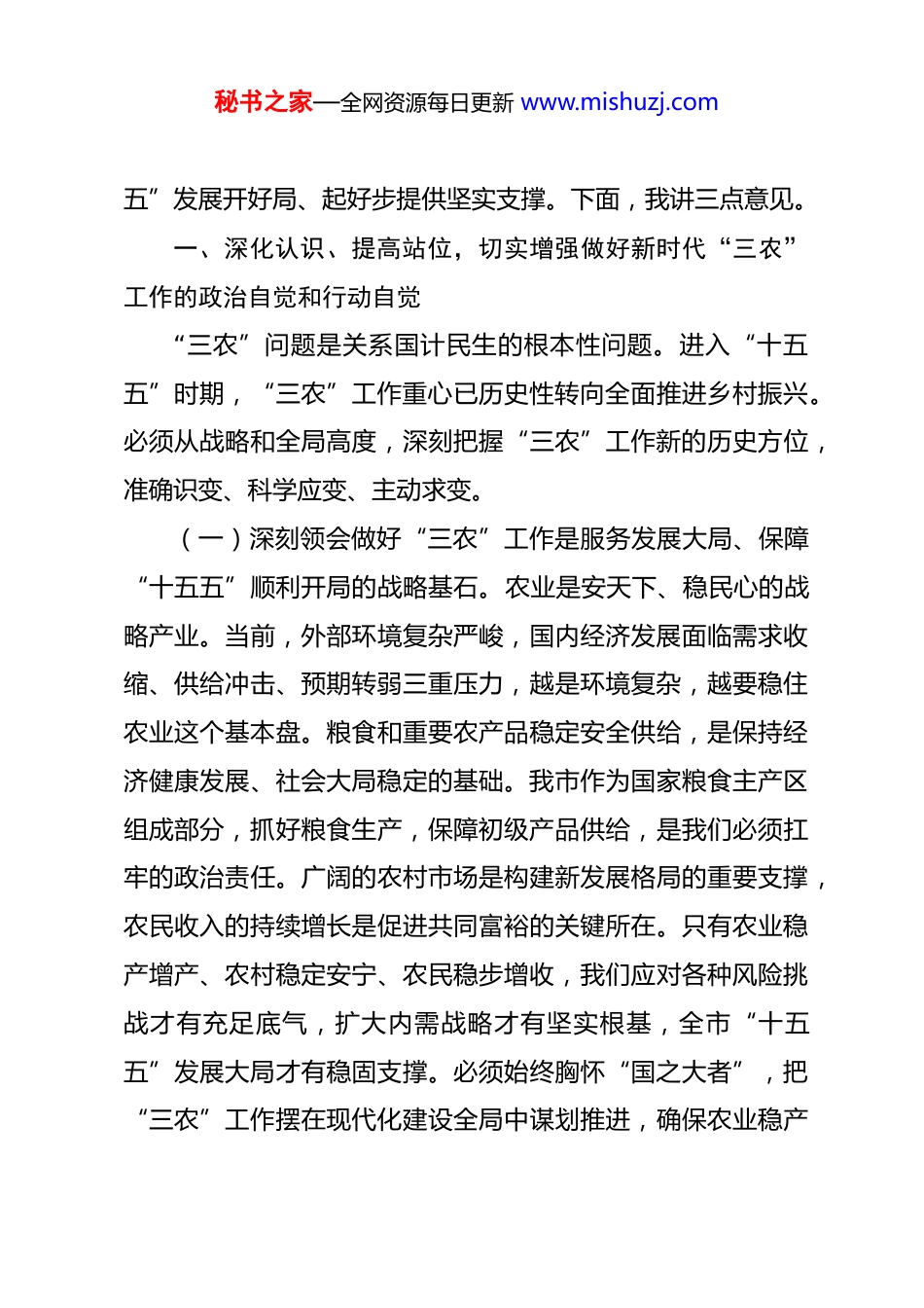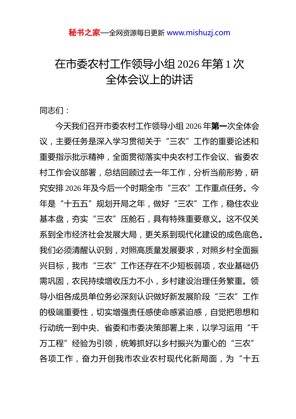 秘书之家—全网资源每日更新 www.mishuzj.com在市委农村工作领导小组 2026 年第 1 次全体会议上的讲话 同志们:今天我们召开市委农村工作领导小组 2026 年第一次全体会议,主要任务是深入学习贯彻关于“三农”工作的重要论述和重要指示批示精神,全面贯彻落实中央农村工作会议、省委农村工作会议部署,总结回顾过去一年工作,分析当前形势,研究安排 2026 年及今后一个时期全市“三农”工作重点任务。今年是“十五五”规划开局之年,做好“三农”工作,稳住农业基本盘,夯实“三农”压舱石,具有特殊重要意义。这不仅关系到全市经济社会发展大局,更关系到现代化建设的成色底色。我们必须清醒认识到,对照高质量发展要求,对照乡村全面振兴目标,我市“三农”工作还存在不少短板弱项,农业基础仍需巩固,农民持续增收压力不小,乡村建设治理任务繁重。领导小组各成员单位务必深刻认识做好新发展阶段“三农”工作的极端重要性,切实增强责任感使命感紧迫感,自觉把思想和行动统一到中央、省委和市委决策部署上来,以学习运用“千万工程”经验为引领,统筹抓好以乡村振兴为重心的“三农”各项工作,奋力开创我市农业农村现代化新局面,为“十五秘书之家—全网资源每日更新 www.mishuzj.com五”发展开好局、起好步提供坚实支撑。下面,我讲三点意见。一、深化认识、提高站位,切实增强做好新时代“三农”工作的政治自觉和行动自觉“三农”问题是关系国计民生的根本性问题。进入“十五五”时期,“三农”工作重心已历史性转向全面推进乡村振兴。必须从战略和全局高度,深刻把握“三农”工作新的历史方位,准确识变、科学应变、主动求变。(一)深刻领会做好“三农”工作是服务发展大局、保障“十五五”顺利开局的战略基石。农业是安天下、稳民心的战略产业。当前,外部环境复杂严峻,国内经济发展面临需求收缩、供给冲击、预期转弱三重压力,越是环境复杂,越要稳住农业这个基本盘。粮食和重要农产品稳定安全供给,是保持经济健康发展、社会大局稳定的基础。我市作为国家粮食主产区组成部分,抓好粮食生产,保障初级产品供给,是我们必须扛牢的政治责任。广阔的农村市场是构建新发展格局的重要支撑,农民收入的持续增长是促进共同富裕的关键所在。只有农业稳产增产、农村稳定安宁、农民稳步增收,我们应对各种风险挑战才有充足底气,扩大内需战略才有坚实根基,全市“十五五”发展大局才有稳固支撑。必须始终胸怀“国之大者”,把“三农”工作摆在现代化建设全局中谋划推进,确保农业稳产秘书之家—全网资源每日更新 www.mishuzj.com保供,确保农村社会稳定,确保农民福祉提升。(二)准确把握做好“三农”工作是全面推进乡村振兴、加快农业农村现代化的核心任务。全面建设社会主义现代化国家,最艰巨最繁重的任务仍然在农村。乡村振兴是新时代“三农”工作总抓手。经过多年接续奋斗,我市农业农村发展取得显著成就,但农业大而不强、农村发展不平衡不充分的问题依然突出。产业发展基础有待夯实,乡村基础设施和公共服务仍有短板,城乡融合发展体制机制尚不健全。全面推进乡村振兴的深度、广度、难度都不亚于脱贫攻坚。我们必须保持战略定力,以更有力的举措、汇聚更强大的力量,推动乡村产业、人才、文化、生态、组织全面振兴。要学习运用“千万工程”所蕴含的发展理念、工作方法和推进机制,坚持农业农村优先发展,坚持城乡融合发展,畅通城乡要素流动,推动人才、资金、技术等更多向乡村流动,加快补上农业农村现代化短板,让广大农民在现代化进程中不掉队、赶上来。(三)清醒认识做好“三农”工作是提升治理效能、巩固党在农村执政基础的必然要求。农村是社会治理的基础。党的二十届四中全会对坚持和完善中国特色社会主义制度、推进国家治理体系和治理能力现代化作出系统部署,对健全党组织领导的自治、法治、德治相结合的城乡基层治理体系提出明确要秘书之家—全网资源每日更新 www.mishuzj.com求。乡村治理是国家治理的基石,治理有效是乡村振兴的重要保障。当前,农村社会结构、利益格局、思想观念深刻变化,农民诉求日益多元,乡村治理面临新情况新挑战。必须坚...