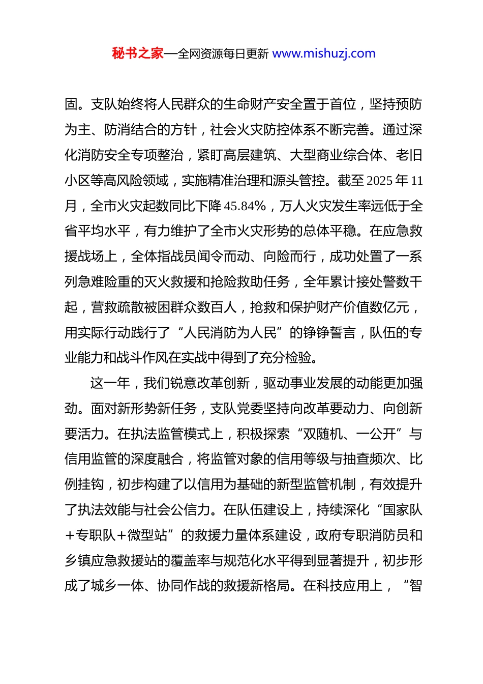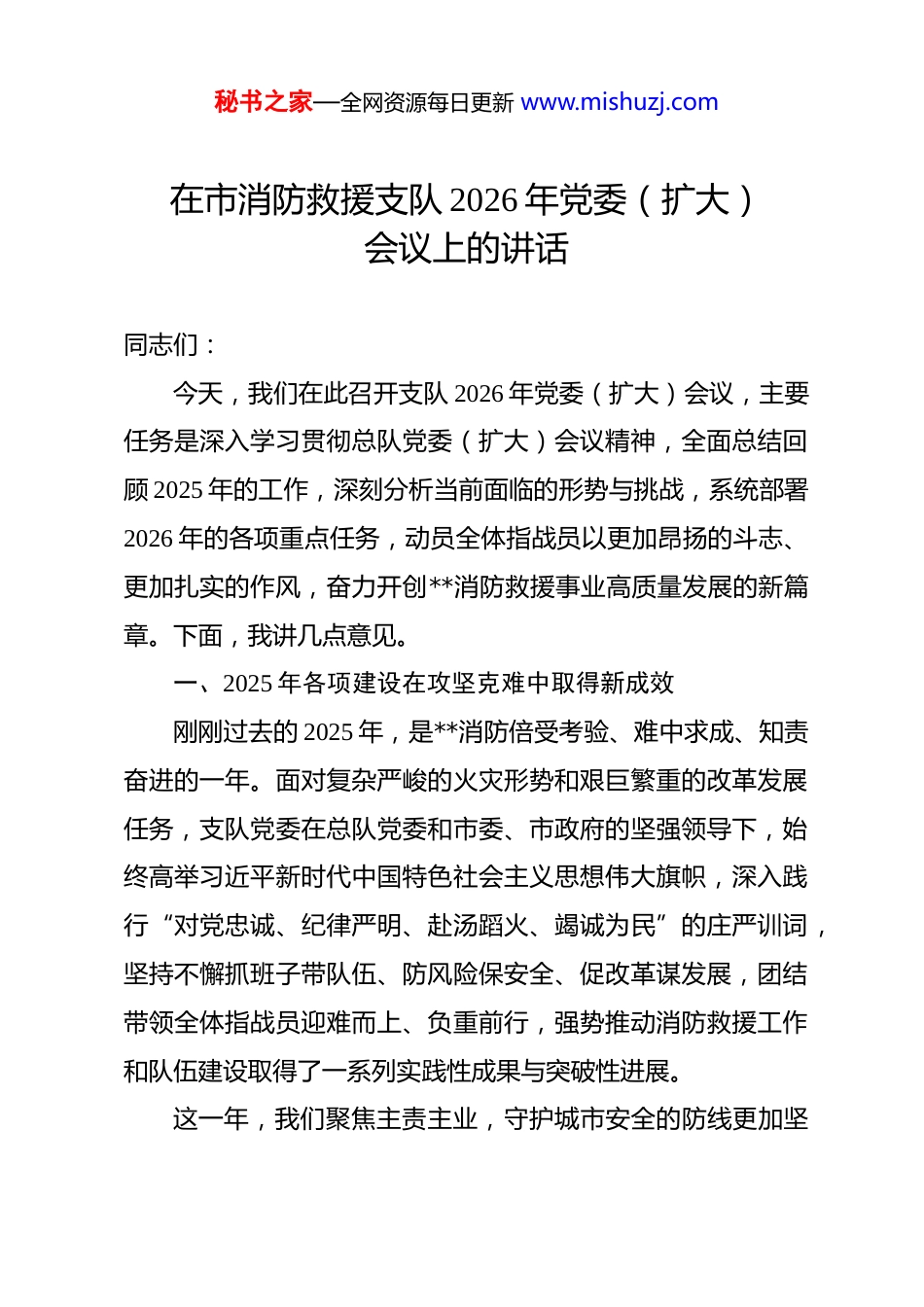 秘书之家—全网资源每日更新 www.mishuzj.com在市消防救援支队 2026 年党委(扩大)会议上的讲话 同志们:今天,我们在此召开支队 2026 年党委(扩大)会议,主要任务是深入学习贯彻总队党委(扩大)会议精神,全面总结回顾 2025 年的工作,深刻分析当前面临的形势与挑战,系统部署2026 年的各项重点任务,动员全体指战员以更加昂扬的斗志、更加扎实的作风,奋力开创**消防救援事业高质量发展的新篇章。下面,我讲几点意见。一、2025 年各项建设在攻坚克难中取得新成效刚刚过去的 2025 年,是**消防倍受考验、难中求成、知责奋进的一年。面对复杂严峻的火灾形势和艰巨繁重的改革发展任务,支队党委在总队党委和市委、市政府的坚强领导下,始终高举习近平新时代中国特色社会主义思想伟大旗帜,深入践行“对党忠诚、纪律严明、赴汤蹈火、竭诚为民”的庄严训词,坚持不懈抓班子带队伍、防风险保安全、促改革谋发展,团结带领全体指战员迎难而上、负重前行,强势推动消防救援工作和队伍建设取得了一系列实践性成果与突破性进展。这一年,我们聚焦主责主业,守护城市安全的防线更加坚秘书之家—全网资源每日更新 www.mishuzj.com固。支队始终将人民群众的生命财产安全置于首位,坚持预防为主、防消结合的方针,社会火灾防控体系不断完善。通过深化消防安全专项整治,紧盯高层建筑、大型商业综合体、老旧小区等高风险领域,实施精准治理和源头管控。截至 2025 年 11月,全市火灾起数同比下降 45.84%,万人火灾发生率远低于全省平均水平,有力维护了全市火灾形势的总体平稳。在应急救援战场上,全体指战员闻令而动、向险而行,成功处置了一系列急难险重的灭火救援和抢险救助任务,全年累计接处警数千起,营救疏散被困群众数百人,抢救和保护财产价值数亿元,用实际行动践行了“人民消防为人民”的铮铮誓言,队伍的专业能力和战斗作风在实战中得到了充分检验。这一年,我们锐意改革创新,驱动事业发展的动能更加强劲。面对新形势新任务,支队党委坚持向改革要动力、向创新要活力。在执法监管模式上,积极探索“双随机、一公开”与信用监管的深度融合,将监管对象的信用等级与抽查频次、比例挂钩,初步构建了以信用为基础的新型监管机制,有效提升了执法效能与社会公信力。在队伍建设上,持续深化“国家队+专职队+微型站”的救援力量体系建设,政府专职消防员和乡镇应急救援站的覆盖率与规范化水平得到显著提升,初步形成了城乡一体、协同作战的救援新格局。在科技应用上,“智秘书之家—全网资源每日更新 www.mishuzj.com能接警+人工研判”双轨模式的推行,有效缩短了应急响应时间,无人机、机器人等高精尖装备的投入使用,为复杂条件下的灭火救援行动提供了有力的科技支撑。这一年,我们坚持政治建队,忠诚履职尽责的根基更加牢固。支队党委始终把政治建设摆在首位,不断强化党对消防救援队伍的绝对领导。通过常态化开展政治理论学习,特别是对党的最新理论成果的深入研讨,确保了全体指战员在思想上政治上行动上同党中央保持高度一致。基层党组织的战斗堡垒作用持续增强,党员先锋模范作用在各项急难险重任务中得到充分彰显。“培育战斗精神、砥砺血性胆气”主题教育活动的深入开展,极大地激发了队伍的战斗热情和奉献精神。“蓝焰精品课堂”等文化品牌的影响力不断扩大,一批先进典型和集体受到表彰,为队伍注入了强大的正能量。成绩的取得,是上级党委正确领导的结果,是地方党委政府关心支持的结果,更是全体指战员、专职消防员、文员同志们团结拼搏、无私奉献的结果。在此,我代表支队党委,向大家表示衷心的感谢和崇高的敬意!在肯定成绩的同时,也必须清醒地认识到,我们的工作中仍然存在一些不容忽视的短板和弱项。例如,社会面火灾防控的基础尚不牢固,一些领域的火灾隐患依然突出;队伍的实战秘书之家—全网资源每日更新 www.mishuzj.com化训练水平与应对“高低大化”等复杂灾害事故的需求相比,仍有差距;部分干部的能力素质与新时代应急救援事业发展的要求还不完全适应;队伍正规化管理水平有待进一步提升。对于这些问题,必须高度重视,并在未来的工作中...