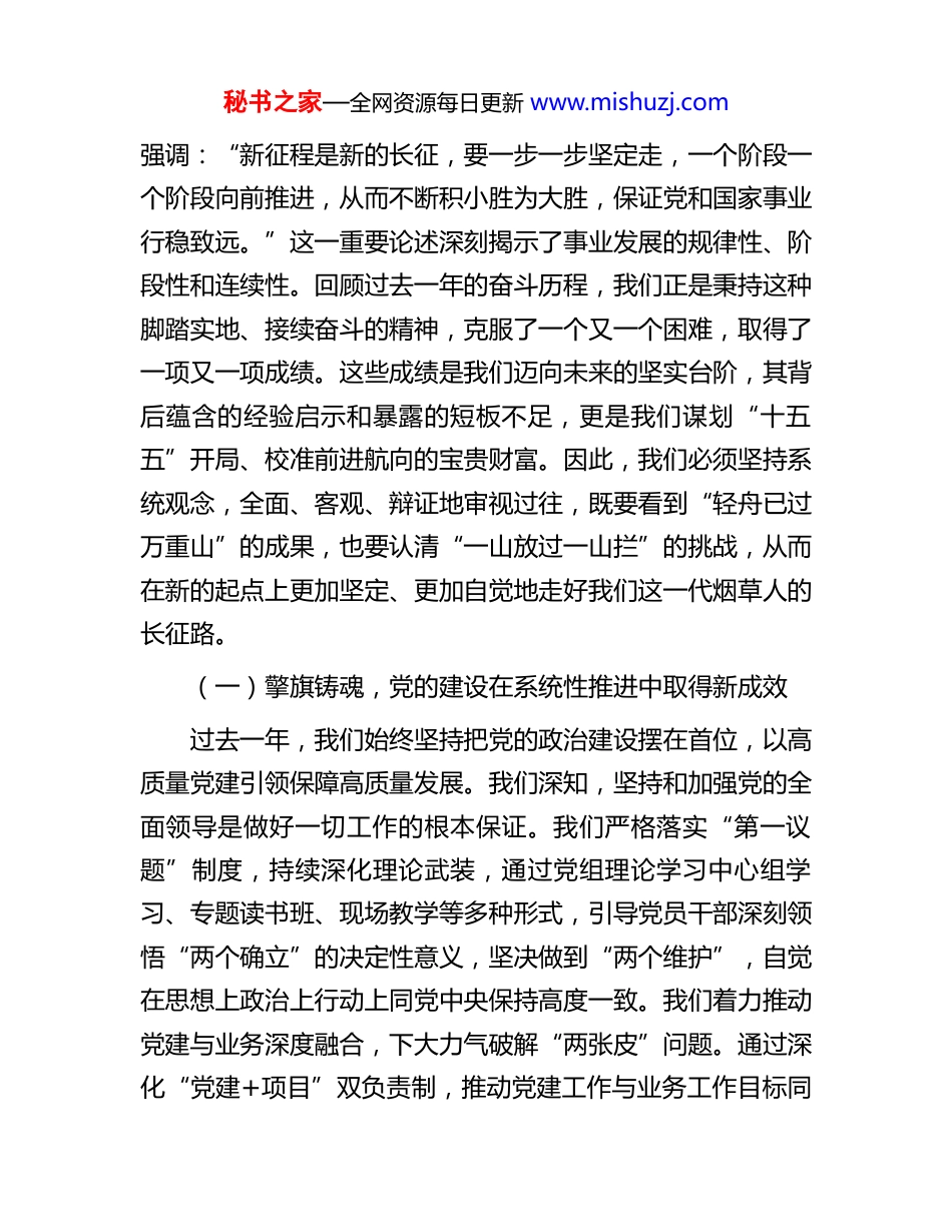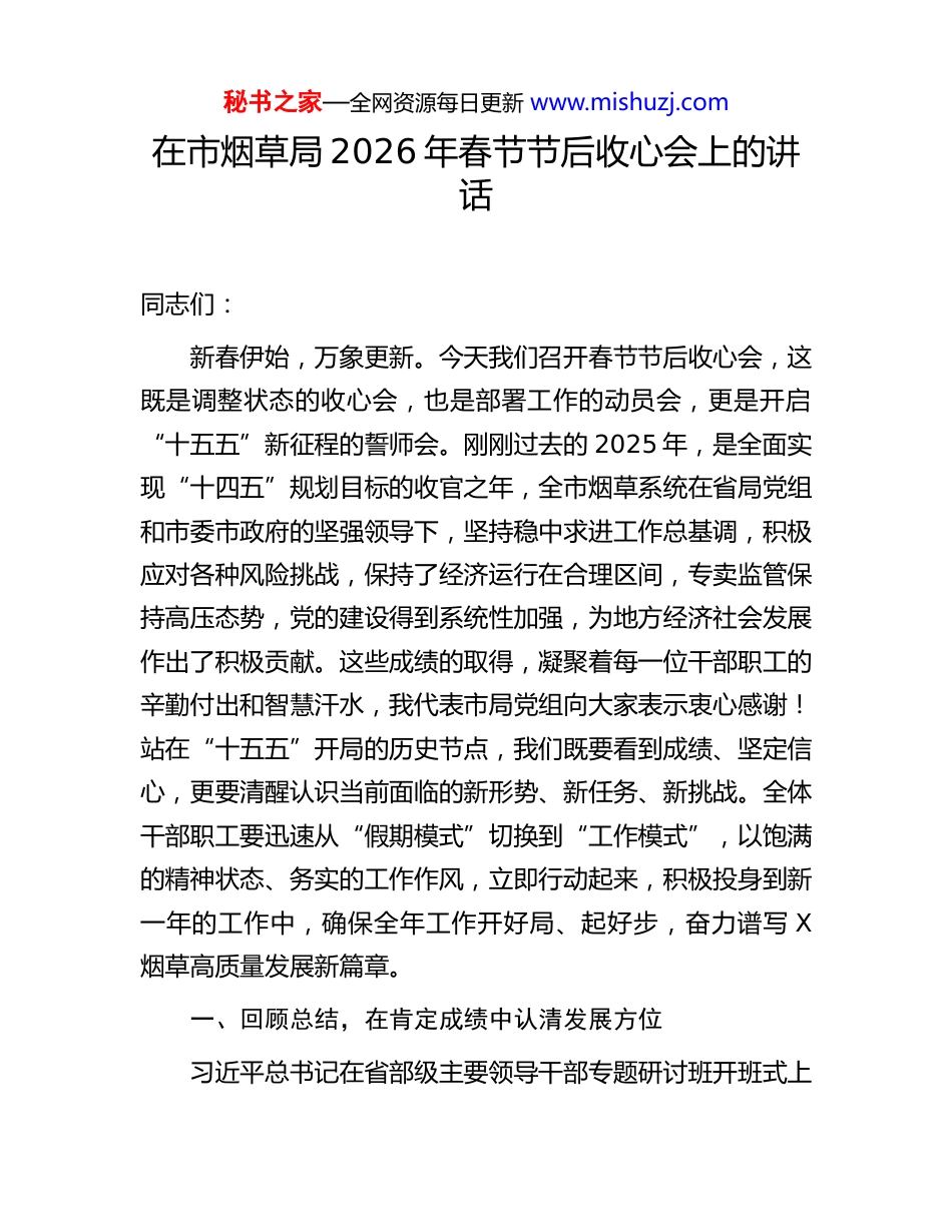 秘书之家—全网资源每日更新 www.mishuzj.com在市烟草局 2026 年春节节后收心会上的讲话同志们:新春伊始,万象更新。今天我们召开春节节后收心会,这既是调整状态的收心会,也是部署工作的动员会,更是开启“十五五”新征程的誓师会。刚刚过去的 2025 年,是全面实现“十四五”规划目标的收官之年,全市烟草系统在省局党组和市委市政府的坚强领导下,坚持稳中求进工作总基调,积极应对各种风险挑战,保持了经济运行在合理区间,专卖监管保持高压态势,党的建设得到系统性加强,为地方经济社会发展作出了积极贡献。这些成绩的取得,凝聚着每一位干部职工的辛勤付出和智慧汗水,我代表市局党组向大家表示衷心感谢!站在“十五五”开局的历史节点,我们既要看到成绩、坚定信心,更要清醒认识当前面临的新形势、新任务、新挑战。全体干部职工要迅速从“假期模式”切换到“工作模式”,以饱满的精神状态、务实的工作作风,立即行动起来,积极投身到新一年的工作中,确保全年工作开好局、起好步,奋力谱写 X烟草高质量发展新篇章。一、回顾总结,在肯定成绩中认清发展方位习近平总书记在省部级主要领导干部专题研讨班开班式上秘书之家—全网资源每日更新 www.mishuzj.com强调:“新征程是新的长征,要一步一步坚定走,一个阶段一个阶段向前推进,从而不断积小胜为大胜,保证党和国家事业行稳致远。”这一重要论述深刻揭示了事业发展的规律性、阶段性和连续性。回顾过去一年的奋斗历程,我们正是秉持这种脚踏实地、接续奋斗的精神,克服了一个又一个困难,取得了一项又一项成绩。这些成绩是我们迈向未来的坚实台阶,其背后蕴含的经验启示和暴露的短板不足,更是我们谋划“十五五”开局、校准前进航向的宝贵财富。因此,我们必须坚持系统观念,全面、客观、辩证地审视过往,既要看到“轻舟已过万重山”的成果,也要认清“一山放过一山拦”的挑战,从而在新的起点上更加坚定、更加自觉地走好我们这一代烟草人的长征路。(一)擎旗铸魂,党的建设在系统性推进中取得新成效过去一年,我们始终坚持把党的政治建设摆在首位,以高质量党建引领保障高质量发展。我们深知,坚持和加强党的全面领导是做好一切工作的根本保证。我们严格落实“第一议题”制度,持续深化理论武装,通过党组理论学习中心组学习、专题读书班、现场教学等多种形式,引导党员干部深刻领悟“两个确立”的决定性意义,坚决做到“两个维护”,自觉在思想上政治上行动上同党中央保持高度一致。我们着力推动党建与业务深度融合,下大力气破解“两张皮”问题。通过深化“党建+项目”双负责制,推动党建工作与业务工作目标同秘书之家—全网资源每日更新 www.mishuzj.com向、部署同步、考核同频;通过打造“金叶扬帆·实干先锋”主品牌及“一科室一品牌”矩阵,将党组织的政治优势、组织优势转化为发展优势。我们持续正风肃纪,营造了风清气正的政治生态。严格落实中央八项规定及其实施细则精神,靶向纠治“四风”问题;扎实开展作风建设专项自查,制定并落实整改措施;通过常态化纪律教育、廉政文化月活动、家风建设等,筑牢党员干部拒腐防变的思想堤坝,为企业行稳致远提供了坚强的纪律保障。一年来,我们更加深刻地体会到,党建工作的成效最终要体现在推动发展、服务大局的实际效果上。我们部分单位在推动理论学习成果向工作创新、治理效能提升转化方面还存在不足,党建品牌的内涵挖掘和影响力有待进一步加强。这提示我们,加强党的建设必须坚持问题导向和效果导向,不断探索党建与业务在理念、机制、载体、考核上深度融合的新路径,切实把党建活力转化为发展动力,把党建优势转化为治理效能,确保党中央及上级党组织的各项决策部署在 X烟草条条落实、件件落地、事事见效。(二)利剑护航,市场监管在高压性态势下实现新突破专卖管理是烟草行业的“生命线”,是履行法定职责、维护国家利益和消费者利益的根本手段。过去一年,我们坚持“守土有责、守土尽责”,以“零容忍”的态度向各类涉烟违法犯罪活动发起凌厉攻势,市场监管成效显著,为行业健康发展守住了底线、净化了环境。我们保持打假打私高压态势,查秘书之家—...
