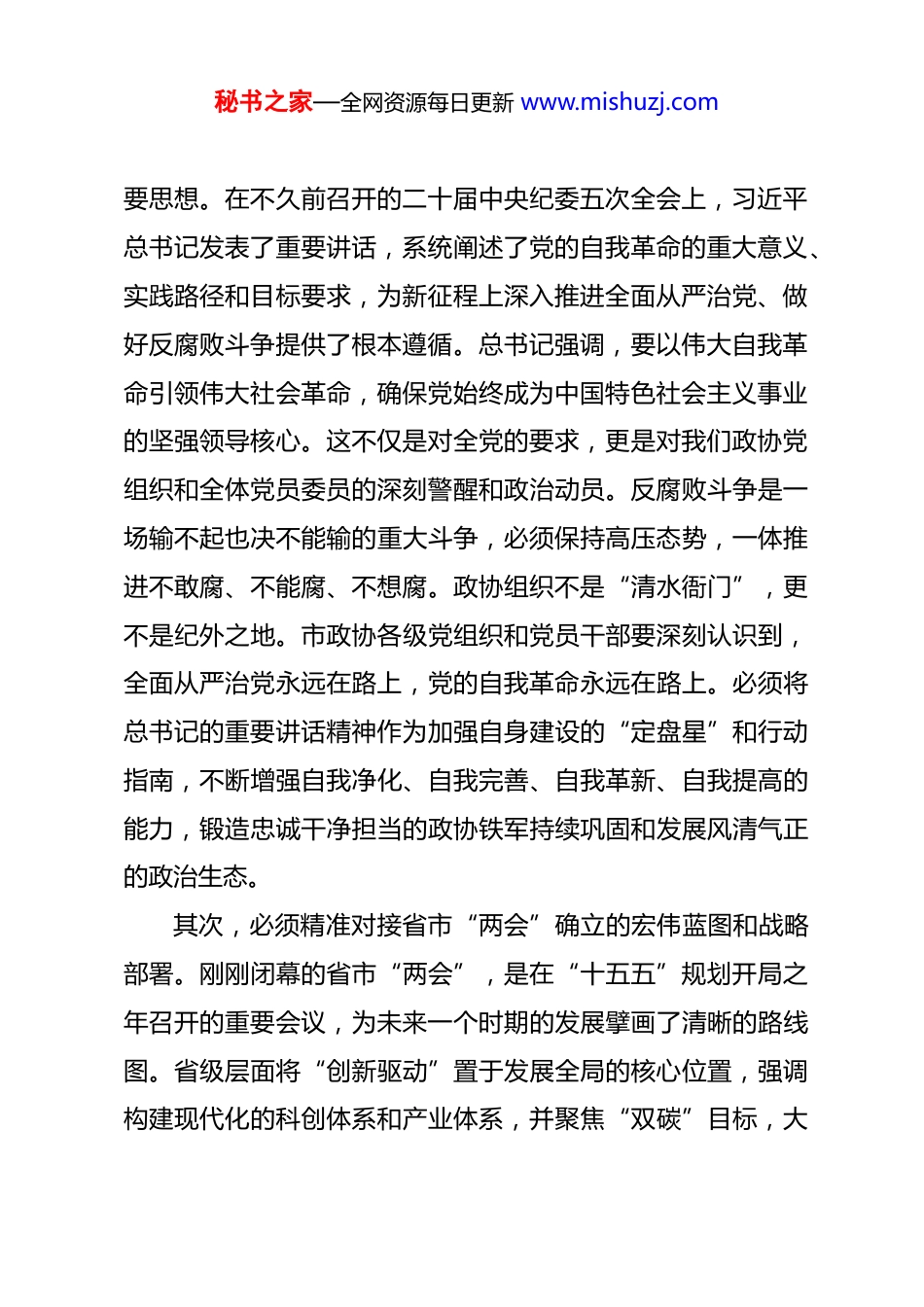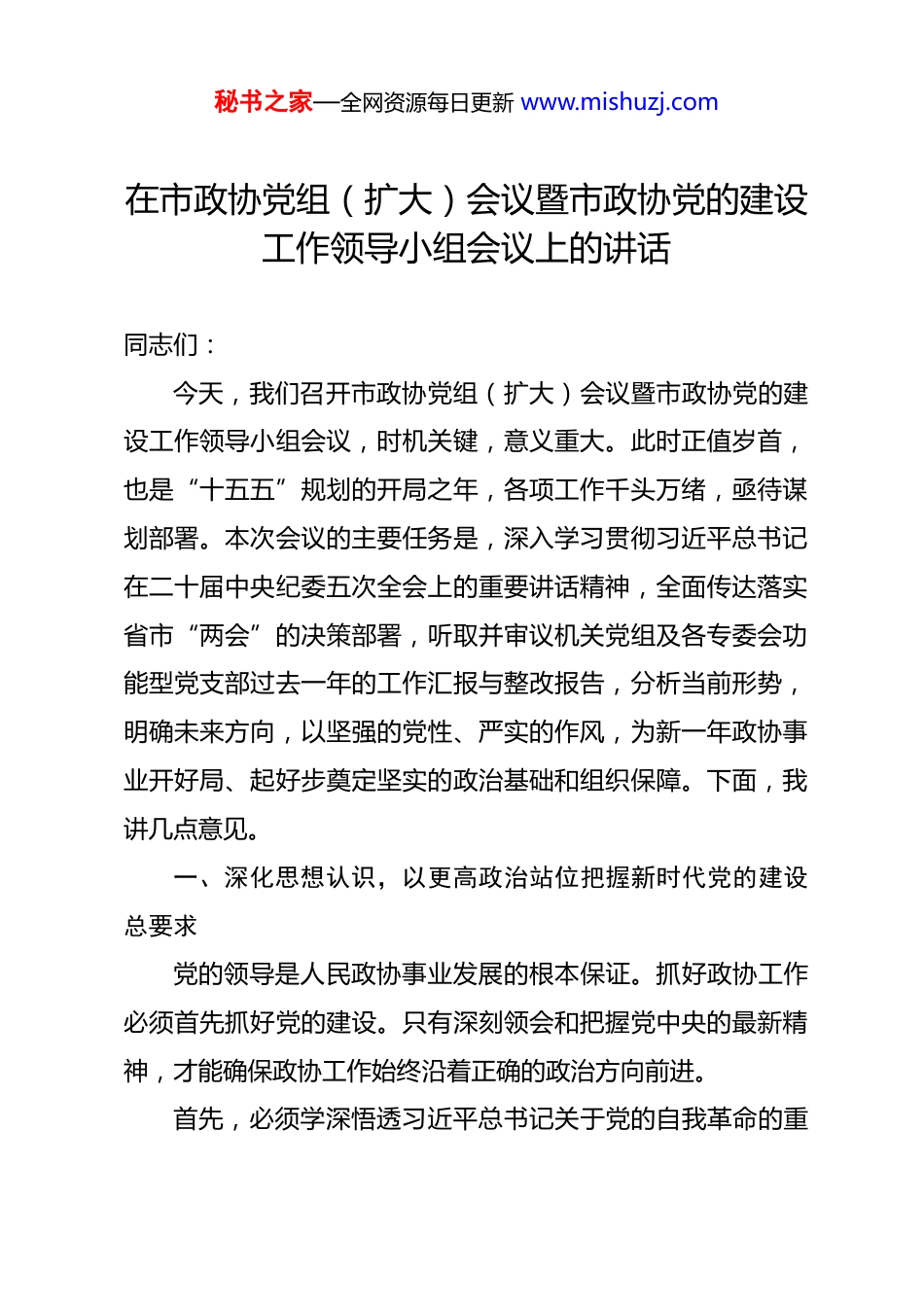 秘书之家—全网资源每日更新 www.mishuzj.com在市政协党组(扩大)会议暨市政协党的建设工作领导小组会议上的讲话 同志们:今天,我们召开市政协党组(扩大)会议暨市政协党的建设工作领导小组会议,时机关键,意义重大。此时正值岁首,也是“十五五”规划的开局之年,各项工作千头万绪,亟待谋划部署。本次会议的主要任务是,深入学习贯彻习近平总书记在二十届中央纪委五次全会上的重要讲话精神,全面传达落实省市“两会”的决策部署,听取并审议机关党组及各专委会功能型党支部过去一年的工作汇报与整改报告,分析当前形势,明确未来方向,以坚强的党性、严实的作风,为新一年政协事业开好局、起好步奠定坚实的政治基础和组织保障。下面,我讲几点意见。一、深化思想认识,以更高政治站位把握新时代党的建设总要求党的领导是人民政协事业发展的根本保证。抓好政协工作必须首先抓好党的建设。只有深刻领会和把握党中央的最新精神,才能确保政协工作始终沿着正确的政治方向前进。首先,必须学深悟透习近平总书记关于党的自我革命的重秘书之家—全网资源每日更新 www.mishuzj.com要思想。在不久前召开的二十届中央纪委五次全会上,习近平总书记发表了重要讲话,系统阐述了党的自我革命的重大意义、实践路径和目标要求,为新征程上深入推进全面从严治党、做好反腐败斗争提供了根本遵循。总书记强调,要以伟大自我革命引领伟大社会革命,确保党始终成为中国特色社会主义事业的坚强领导核心。这不仅是对全党的要求,更是对我们政协党组织和全体党员委员的深刻警醒和政治动员。反腐败斗争是一场输不起也决不能输的重大斗争,必须保持高压态势,一体推进不敢腐、不能腐、不想腐。政协组织不是“清水衙门”,更不是纪外之地。市政协各级党组织和党员干部要深刻认识到,全面从严治党永远在路上,党的自我革命永远在路上。必须将总书记的重要讲话精神作为加强自身建设的“定盘星”和行动指南,不断增强自我净化、自我完善、自我革新、自我提高的能力,锻造忠诚干净担当的政协铁军持续巩固和发展风清气正的政治生态。其次,必须精准对接省市“两会”确立的宏伟蓝图和战略部署。刚刚闭幕的省市“两会”,是在“十五五”规划开局之年召开的重要会议,为未来一个时期的发展擘画了清晰的路线图。省级层面将“创新驱动”置于发展全局的核心位置,强调构建现代化的科创体系和产业体系,并聚焦“双碳”目标,大秘书之家—全网资源每日更新 www.mishuzj.com力发展新质生产力。市级层面则紧密围绕“六个新**”建设目标,提出了优品质、惠民生、定格局、攀高峰的发展要求,将提振消费、人工智能、城市更新、教育振兴等列为年度关键词。这些部署既是经济社会发展的“任务书”,也是人民政协履职尽责的“坐标系”。政协党建工作的成效,最终要体现在服务中心大局的实际行动上。要将学习贯彻省市“两会”精神与政协履职实践紧密结合,引导广大委员和机关干部深刻理解全市发展面临的机遇与挑战,找准政治协商的切入点、民主监督的关键点、参政议政的着力点,确保政协的“智”献在关键处,“力”出在点子上。二、客观总结过往,以更高标准审视党建工作成效与不足回顾过去的一年,市政协机关党组和各专委会功能型党支部在市委的坚强领导下,围绕中心、服务大局,党的建设各项工作取得了新的进展和成效。今天会议听取了相关工作汇报,总体上看,成绩值得肯定。在过去的一年里,政协党的组织体系和工作机制得到进一步健全。依托“政协党组+机关党组+专委会功能型党支部”的组织架构,党的领导实现了对政协工作的全覆盖。各专委会功能型党支部在加强思想政治引领、广泛凝聚共识方面各具特色,党组织的战斗堡垒作用不断强化。通过组织专题学习、开秘书之家—全网资源每日更新 www.mishuzj.com展主题党日活动、将党建工作融入履职全过程等方式,党员委员的先锋模范作用和委员的主体作用得到有效发挥。这些努力直接转化为高质量的履职成果。例如,2025 年市政协共立案各类提案 426 件,办复率和满意率均达到了 100%,这背后凝结着各级党组织和广大党员委员的心血与智慧。在正视成绩的同时,更要清醒地看到...