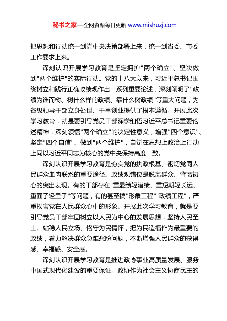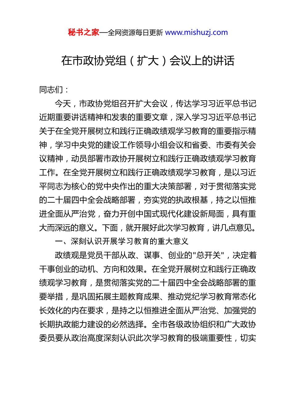 秘书之家—全网资源每日更新 www.mishuzj.com在市政协党组(扩大)会议上的讲话 同志们:今天,市政协党组召开扩大会议,传达学习习近平总书记近期重要讲话精神和发表的重要文章,深入学习习近平总书记关于在全党开展树立和践行正确政绩观学习教育的重要指示精神,学习中央党的建设工作领导小组会议和省委、市委有关会议精神,动员部署市政协开展树立和践行正确政绩观学习教育工作。在全党开展树立和践行正确政绩观学习教育,是以习近平同志为核心的党中央作出的重大决策部署,对于贯彻落实党的二十届四中全会战略部署,夯实党的执政根基,持之以恒推进全面从严治党,奋力开创中国式现代化建设新局面,具有重大而深远的意义。下面,就开展好此次学习教育,讲几点意见。一、深刻认识开展学习教育的重大意义政绩观是党员干部从政、谋事、创业的"总开关",决定着干事创业的动机、方向和效果。在全党开展树立和践行正确政绩观学习教育,是贯彻落实党的二十届四中全会战略部署的重要举措,是巩固拓展主题教育成果、推动党纪学习教育常态化长效化的内在要求,是持之以恒推进全面从严治党、加强党的长期执政能力建设的必然选择。全市各级政协组织和广大政协委员要从政治高度深刻认识此次学习教育的极端重要性,切实秘书之家—全网资源每日更新 www.mishuzj.com把思想和行动统一到党中央决策部署上来,统一到省委、市委工作要求上来。深刻认识开展学习教育是坚定拥护"两个确立"、坚决做到"两个维护"的实际行动。党的十八大以来,习近平总书记围绕树立和践行正确政绩观作出一系列重要论述,深刻阐明了"政绩为谁而树、树什么样的政绩、靠什么树政绩"等重大问题,为各级领导干部立身处世、干事创业提供了根本遵循。开展此次学习教育,就是要引导党员干部深学细悟习近平总书记重要论述精神,深刻领悟"两个确立"的决定性意义,增强"四个意识"、坚定"四个自信"、做到"两个维护",自觉在思想上政治上行动上同以习近平同志为核心的党中央保持高度一致。深刻认识开展学习教育是夯实党的执政根基、密切党同人民群众血肉联系的重要途径。政绩观错位是脱离群众、背离初心的突出表现。有的干部存在"重显绩轻潜绩、重短期轻长远、重面子轻里子"等问题,有的甚至搞"形象工程""政绩工程",严重损害党在人民群众心中的形象。开展此次学习教育,就是要引导党员干部牢固树立以人民为中心的发展思想,坚持人民至上、站稳人民立场、恪守为民情怀,把为民造福作为最重要的政绩,着力解决群众急难愁盼问题,不断增强人民群众的获得感、幸福感、安全感。深刻认识开展学习教育是推进政协事业高质量发展、服务中国式现代化建设的重要保证。政协作为社会主义协商民主的秘书之家—全网资源每日更新 www.mishuzj.com重要渠道和专门协商机构,承担着建言资政、凝聚共识的重要职能。政绩观正不正,直接关系到政协履职的方向和效果。开展此次学习教育,就是要引导政协干部和政协委员树立正确的履职观、政绩观,坚持质量优先、实效至上,努力创造经得起实践、人民、历史检验的实绩,为推动 XX 高质量发展贡献智慧和力量。二、牢牢把握学习教育的总体要求和目标任务此次学习教育以习近平新时代中国特色社会主义思想为指导,全面贯彻党的二十大和二十届三中、四中全会精神,牢牢把握立党为公、为民造福、科学决策、真抓实干的总要求,坚持学思用贯通、知信行统一,着力解决政绩观错位、责任心缺失等问题,推动党员干部进一步树立和践行正确政绩观。在目标任务上,要着力实现"四个提升"。一是政治站位进一步提升。深刻认识正确政绩观的政治属性,把树立和践行正确政绩观作为检验政治判断力、政治领悟力、政治执行力的重要标尺,自觉在党和国家事业大局中谋划和推进工作。二是宗旨意识进一步提升。牢固树立以人民为中心的发展思想,坚持发展为民、执政为民,把人民拥护不拥护、赞成不赞成、高兴不高兴、答应不答应作为衡量一切工作得失的根本标准。三是履职能力进一步提升。坚持质量导向、效果导向,提高调查研究能力、协商议政能力、民主监督能力,增强建言资政的前瞻性、针对性、实效性。四是工作作风进一步提升。坚决反...