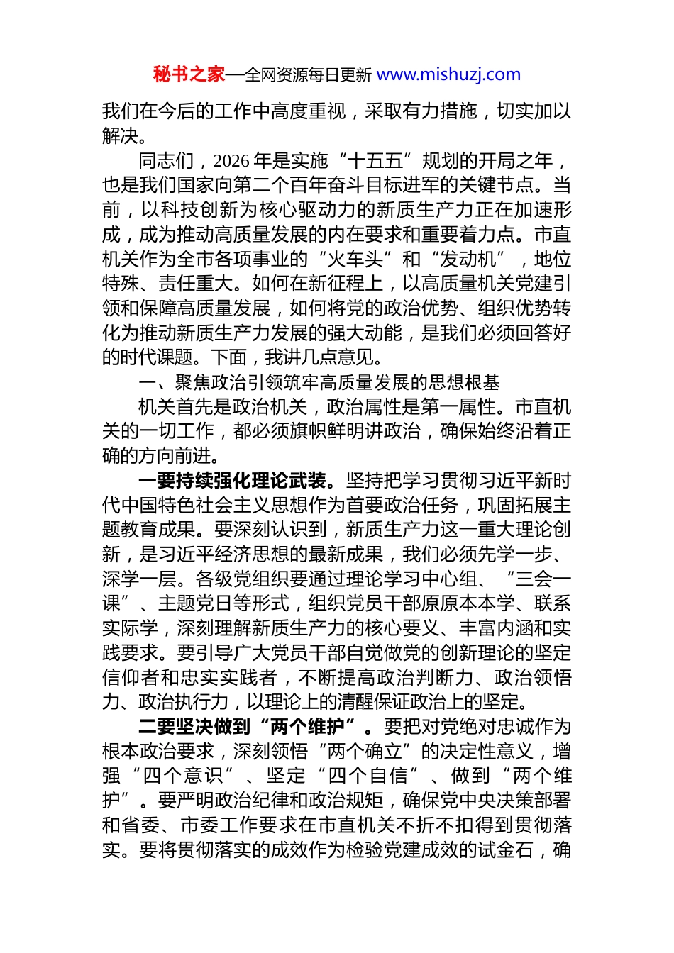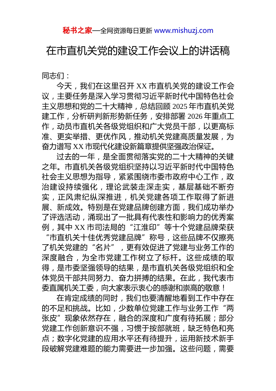 秘书之家—全网资源每日更新 www.mishuzj.com在市直机关党的建设工作会议上的讲话稿同志们:今天,我们在这里召开 XX 市直机关党的建设工作会议,主要任务是深入学习贯彻习近平新时代中国特色社会主义思想和党的二十大精神,总结回顾 2025 年市直机关党建工作,分析研判新形势新任务,安排部署 2026 年重点工作,动员市直机关各级党组织和广大党员干部,以更高标准、更实举措、更优作风,推动机关党建高质量发展,为奋力谱写 XX 市现代化建设新篇章提供坚强政治保证。过去的一年,是全面贯彻落实党的二十大精神的关键之年。市直机关各级党组织坚持以习近平新时代中国特色社会主义思想为指导,紧紧围绕市委市政府中心工作,政治建设持续强化,理论武装走深走实,基层基础不断夯实,正风肃纪纵深推进,机关党建各项工作取得了新进展、新成效。特别是在党建品牌创建方面,我们成功举办了评选活动,涌现出了一批具有代表性和影响力的优秀案例,其中 XX 市司法局的“江淮印”等十个党建品牌荣获“市直机关十佳优秀党建品牌”称号,这些品牌不仅擦亮了机关党建的“名片”,更有效促进了党建与业务工作的深度融合,为全市党建工作树立了标杆。这些成绩的取得,是市委坚强领导的结果,是市直机关各级党组织和全体党员干部共同努力、奋力拼搏的结果。在此,我代表市委直属机关工委,向大家表示衷心的感谢和崇高的敬意!在肯定成绩的同时,我们也要清醒地看到工作中存在的不足和挑战。比如,少数单位党建工作与业务工作“两张皮”现象依然存在,融合的深度和广度有待拓展;部分党建工作创新意识不强,习惯于按部就班,缺乏特色和亮点;数字化党建的应用水平还有待提升,运用新技术新手段破解党建难题的能力需要进一步加强。这些问题,需要秘书之家—全网资源每日更新 www.mishuzj.com我们在今后的工作中高度重视,采取有力措施,切实加以解决。同志们,2026 年是实施“十五五”规划的开局之年,也是我们国家向第二个百年奋斗目标进军的关键节点。当前,以科技创新为核心驱动力的新质生产力正在加速形成,成为推动高质量发展的内在要求和重要着力点。市直机关作为全市各项事业的“火车头”和“发动机”,地位特殊、责任重大。如何在新征程上,以高质量机关党建引领和保障高质量发展,如何将党的政治优势、组织优势转化为推动新质生产力发展的强大动能,是我们必须回答好的时代课题。下面,我讲几点意见。一、聚焦政治引领筑牢高质量发展的思想根基机关首先是政治机关,政治属性是第一属性。市直机关的一切工作,都必须旗帜鲜明讲政治,确保始终沿着正确的方向前进。一要持续强化理论武装。坚持把学习贯彻习近平新时代中国特色社会主义思想作为首要政治任务,巩固拓展主题教育成果。要深刻认识到,新质生产力这一重大理论创新,是习近平经济思想的最新成果,我们必须先学一步、深学一层。各级党组织要通过理论学习中心组、“三会一课”、主题党日等形式,组织党员干部原原本本学、联系实际学,深刻理解新质生产力的核心要义、丰富内涵和实践要求。要引导广大党员干部自觉做党的创新理论的坚定信仰者和忠实实践者,不断提高政治判断力、政治领悟力、政治执行力,以理论上的清醒保证政治上的坚定。二要坚决做到“两个维护”。要把对党绝对忠诚作为根本政治要求,深刻领悟“两个确立”的决定性意义,增强“四个意识”、坚定“四个自信”、做到“两个维护”。要严明政治纪律和政治规矩,确保党中央决策部署和省委、市委工作要求在市直机关不折不扣得到贯彻落实。要将贯彻落实的成效作为检验党建成效的试金石,确秘书之家—全网资源每日更新 www.mishuzj.com保市委市政府的各项工作部署,特别是关于发展新质生产力、推进高质量发展的战略举措,都能在市直机关落地生根、开花结果。三要严肃党内政治生活。高质量的党内政治生活是淬炼党性、提升政治能力的重要熔炉。要严格执行新形势下党内政治生活若干准则,提高民主生活会和组织生活会质量,用好批评和自我批评这个锐利武器,让党员干部在严肃认真的党内政治生活中“红脸出汗”、排毒治病。要认真落实 2026 年市直机关主题党日活动...