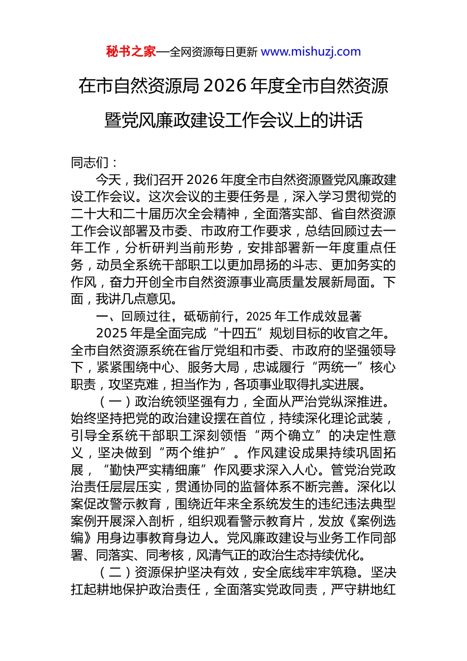 秘书之家—全网资源每日更新 www.mishuzj.com在市自然资源局 2026 年度全市自然资源暨党风廉政建设工作会议上的讲话同志们:今天,我们召开 2026 年度全市自然资源暨党风廉政建设工作会议。这次会议的主要任务是,深入学习贯彻党的二十大和二十届历次全会精神,全面落实部、省自然资源工作会议部署及市委、市政府工作要求,总结回顾过去一年工作,分析研判当前形势,安排部署新一年度重点任务,动员全系统干部职工以更加昂扬的斗志、更加务实的作风,奋力开创全市自然资源事业高质量发展新局面。下面,我讲几点意见。一、回顾过往,砥砺前行,2025 年工作成效显著2025 年是全面完成“十四五”规划目标的收官之年。全市自然资源系统在省厅党组和市委、市政府的坚强领导下,紧紧围绕中心、服务大局,忠诚履行“两统一”核心职责,攻坚克难,担当作为,各项事业取得扎实进展。(一)政治统领坚强有力,全面从严治党纵深推进。始终坚持把党的政治建设摆在首位,持续深化理论武装,引导全系统干部职工深刻领悟“两个确立”的决定性意义,坚决做到“两个维护”。作风建设成果持续巩固拓展,“勤快严实精细廉”作风要求深入人心。管党治党政治责任层层压实,贯通协同的监督体系不断完善。深化以案促改警示教育,围绕近年来全系统发生的违纪违法典型案例开展深入剖析,组织观看警示教育片,发放《案例选编》用身边事教育身边人。党风廉政建设与业务工作同部署、同落实、同考核,风清气正的政治生态持续优化。(二)资源保护坚决有效,安全底线牢牢筑稳。坚决扛起耕地保护政治责任,全面落实党政同责,严守耕地红秘书之家—全网资源每日更新 www.mishuzj.com线。2024 年,全市实现耕地总量 15.235 万亩,耕地和永久基本农田保有量首次实现净增长。进入 2025 年,保护力度持续加大,创新占补平衡管理机制,全年为各类重点建设项目补充耕地 2602.85 亩。全面推行“田长制”,建立市、县、镇、村四级责任体系,“智慧耕保”监管系统广泛应用,AI 智能识别、移动 APP 巡查成为常态,耕地保护的数字化、智能化水平显著提升。矿产资源管理规范有序,安全生产责任压紧压实。地质灾害综合防治体系不断完善,“人防+技防”能力稳步提升。执法监管保持高压态势,2023 年全市违法占用耕地面积占新增建设用地占用耕地总面积的比例降至 0.82%;2025 年持续加大重大典型案件查处力度,坚决遏制耕地“非农化”、防止“非粮化”,自然资源管理秩序持续向好。(三)服务发展精准高效,要素保障扎实有为。坚持“要素跟着项目走”,全力保障省市重大项目、基础设施、民生工程用地需求。国土空间规划的战略引领和刚性约束作用不断增强,“三区三线”划定成果全面应用。节约集约用地水平持续提升,存量土地盘活利用取得新进展。深入推进“放管服”改革,不动产登记“六办”模式、跨省通办等便民利企服务新模式有效推广。历史遗留问题化解成效明显,一批长期困扰企业和群众的问题得到有效解决。(四)生态修复系统推进,绿色本底更加厚植。牢固树立和践行“绿水青山就是金山银山”理念,坚持节约优先、保护优先、自然恢复为主的方针,统筹推进山水林田湖草沙一体化保护修复。我市在全省率先编制实施市级国土空间生态修复规划,并建立市级专家库。2023 年实施生态修复项目 8 个,累计投资 2996 万元,其中 XX 县大巴山区历史遗留矿山生态修复工程入选省级典型案例。2025年,生态保护修复工作扎实有力,实施重点区域生态修复治理 48.9 万亩,完成营造林 36 万亩。秦岭石蝴蝶保护与秘书之家—全网资源每日更新 www.mishuzj.com野外回归实现新突破,朱鹦国家保护研究中心落地 XX,生物多样性保护取得显著成效。全市累计完成矿山生态修复治理面积 736 公顷,嘉陵江上游 XX 座尾矿库综合治理全面完成,秦巴生态安全屏障更加牢固。过去一年的成绩来之不易,这是省厅和市委、市政府正确领导的结果,是全系统广大干部职工团结拼搏、辛勤付出的结果。在此,我代表局党组,向大家表示衷心的感谢!二、认清形势,把握机遇,切实增强做好 2026 年工作的责任感和使命感2026 年是实施“...