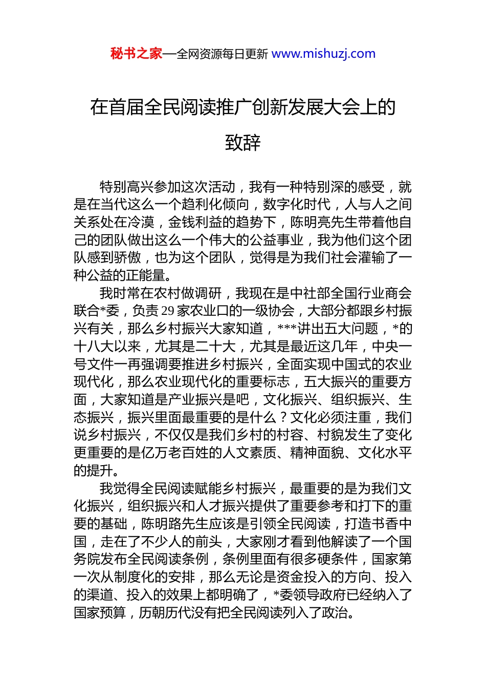 秘书之家—全网资源每日更新 www.mishuzj.com在首届全民阅读推广创新发展大会上的致辞特别高兴参加这次活动,我有一种特别深的感受,就是在当代这么一个趋利化倾向,数字化时代,人与人之间关系处在冷漠,金钱利益的趋势下,陈明亮先生带着他自己的团队做出这么一个伟大的公益事业,我为他们这个团队感到骄傲,也为这个团队,觉得是为我们社会灌输了一种公益的正能量。我时常在农村做调研,我现在是中社部全国行业商会联合*委,负责 29 家农业口的一级协会,大部分都跟乡村振兴有关,那么乡村振兴大家知道,***讲出五大问题,*的十八大以来,尤其是二十大,尤其是最近这几年,中央一号文件一再强调要推进乡村振兴,全面实现中国式的农业现代化,那么农业现代化的重要标志,五大振兴的重要方面,大家知道是产业振兴是吧,文化振兴、组织振兴、生态振兴,振兴里面最重要的是什么?文化必须注重,我们说乡村振兴,不仅仅是我们乡村的村容、村貌发生了变化更重要的是亿万老百姓的人文素质、精神面貌、文化水平的提升。我觉得全民阅读赋能乡村振兴,最重要的是为我们文化振兴,组织振兴和人才振兴提供了重要参考和打下的重要的基础,陈明路先生应该是引领全民阅读,打造书香中国,走在了不少人的前头,大家刚才看到他解读了一个国务院发布全民阅读条例,条例里面有很多硬条件,国家第一次从制度化的安排,那么无论是资金投入的方向、投入的渠道、投入的效果上都明确了,*委领导政府已经纳入了国家预算,历朝历代没有把全民阅读列入了政治。秘书之家—全网资源每日更新 www.mishuzj.com我们说阅读既是个人的事,也是国家的事,也是民族的事,更是父母的事情,刚才明亮解读的时候特别好,全民阅读不仅仅是我们,在座的各位是代表老中青一代又一代人,我们知道历朝历代达官贵人也好,社会的进步,社会的前进,都离不开书籍,那整个社会的我们,现在说打造书香中国,乡村要全面振兴,没有全民阅读,我们难以想象,我们乡村振兴,我们的人才、我们的组织、我们的社会如何呢?我们知道中国的农业现代化,现在全面进入到了推进全面振兴的阶段,脱贫攻坚已经完成了历史性,但是在脱贫攻坚和乡村振兴之间还有一个漫长的过渡期,国家在这方面政策力度的有限,那么全民阅读恰恰的是我们进一步推进乡村全面振兴的重要举措。所以我们刚才启动了一个叫全民阅读中国行,这是前不久跟明亮先生一块儿讨论的时候,我的一部分协会的同志,搞农村报道的一部分,新闻媒体,我们为什么要推动全民阅读中国行,我过去在央视的时候,我们做过美丽中国乡村,我们做过乡村振兴博鳌论坛,我们做过方方面面的打造的一系列的推动农村文化发展的品牌活动,以我们的央视的全国三农人的榜样推荐,我们全国的致富典型的推荐,全国的十大最美乡村的推荐等等, 重要的一个指标,就是文化,就是读书。我曾经记得这个推荐中国美丽乡村的时候,北京市有一个叫韩村河村,韩村河村之所以成为致富的先进者,全国的典型村,除了它的经济社会发展以外,更重要的家家户户进报纸,家家户户有网络,每天晚上 7 点钟看新闻联播,现在为止,你到村屯去,还是家家有一份农民日报,当然国家在这一方面也投了很大的力气,中央财政的安排,几年前在安排乡村振兴资金的时候,给西部边疆少数民族地区,大概每年要送百万份各类报纸,当然不光是农民对报我在农民日报工作过,我知道这个情况,大概每年要给边疆贫困地区,每个村送一份报纸,财政连续多年发起,赋秘书之家—全网资源每日更新 www.mishuzj.com能我们的乡村文化建设,赋能我们农民的素质的提升。那么在通过这个报纸书刊进社区、进乡村,进我们的村委会,提升了我们整一块农民的文化素质,大家都知道一批电商平台上。网络直播、网络红人已经成为农村农产品销售的一个重要的组成部分,产业振兴的产品怎么出去还得有文化的一代人来推荐、宣传、提升我们乡村振兴的整体的素质。所以我在这想陈明亮先生,全民阅读行动,走在了国家强有力之前,在座的各位都是有利于我们整个社会阅读的引路人,我特别的为我们这个团队骄傲,我想,我们下一个的全民阅读中国行要不断的发现更好的典型,...