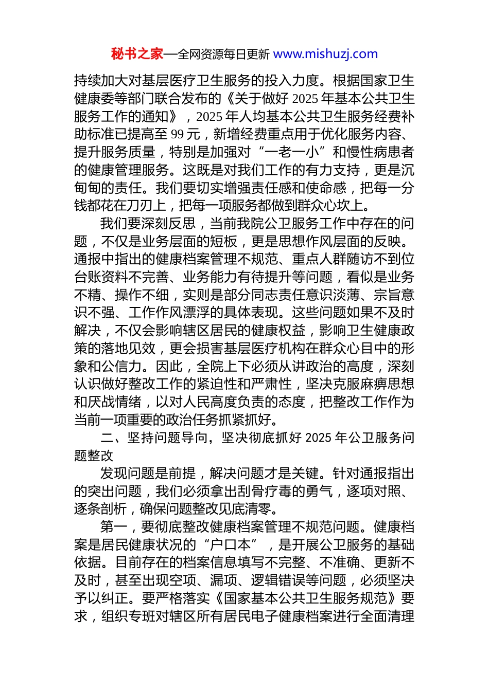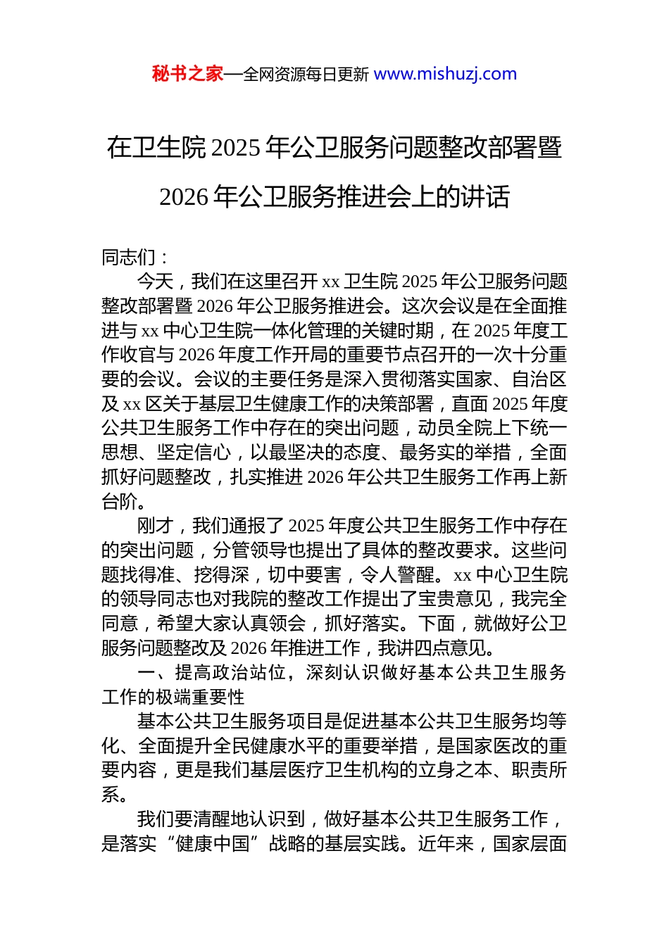 秘书之家—全网资源每日更新 www.mishuzj.com在卫生院 2025 年公卫服务问题整改部署暨2026 年公卫服务推进会上的讲话同志们:今天,我们在这里召开 xx 卫生院 2025 年公卫服务问题整改部署暨 2026 年公卫服务推进会。这次会议是在全面推进与 xx 中心卫生院一体化管理的关键时期,在 2025 年度工作收官与 2026 年度工作开局的重要节点召开的一次十分重要的会议。会议的主要任务是深入贯彻落实国家、自治区及 xx 区关于基层卫生健康工作的决策部署,直面 2025 年度公共卫生服务工作中存在的突出问题,动员全院上下统一思想、坚定信心,以最坚决的态度、最务实的举措,全面抓好问题整改,扎实推进 2026 年公共卫生服务工作再上新台阶。刚才,我们通报了 2025 年度公共卫生服务工作中存在的突出问题,分管领导也提出了具体的整改要求。这些问题找得准、挖得深,切中要害,令人警醒。xx 中心卫生院的领导同志也对我院的整改工作提出了宝贵意见,我完全同意,希望大家认真领会,抓好落实。下面,就做好公卫服务问题整改及 2026 年推进工作,我讲四点意见。一、提高政治站位,深刻认识做好基本公共卫生服务工作的极端重要性基本公共卫生服务项目是促进基本公共卫生服务均等化、全面提升全民健康水平的重要举措,是国家医改的重要内容,更是我们基层医疗卫生机构的立身之本、职责所系。我们要清醒地认识到,做好基本公共卫生服务工作,是落实“健康中国”战略的基层实践。近年来,国家层面秘书之家—全网资源每日更新 www.mishuzj.com持续加大对基层医疗卫生服务的投入力度。根据国家卫生健康委等部门联合发布的《关于做好 2025 年基本公共卫生服务工作的通知》,2025 年人均基本公共卫生服务经费补助标准已提高至 99 元,新增经费重点用于优化服务内容、提升服务质量,特别是加强对“一老一小”和慢性病患者的健康管理服务。这既是对我们工作的有力支持,更是沉甸甸的责任。我们要切实增强责任感和使命感,把每一分钱都花在刀刃上,把每一项服务都做到群众心坎上。我们要深刻反思,当前我院公卫服务工作中存在的问题,不仅是业务层面的短板,更是思想作风层面的反映。通报中指出的健康档案管理不规范、重点人群随访不到位台账资料不完善、业务能力有待提升等问题,看似是业务不精、操作不细,实则是部分同志责任意识淡薄、宗旨意识不强、工作作风漂浮的具体表现。这些问题如果不及时解决,不仅会影响辖区居民的健康权益,影响卫生健康政策的落地见效,更会损害基层医疗机构在群众心目中的形象和公信力。因此,全院上下必须从讲政治的高度,深刻认识做好整改工作的紧迫性和严肃性,坚决克服麻痹思想和厌战情绪,以对人民高度负责的态度,把整改工作作为当前一项重要的政治任务抓紧抓好。二、坚持问题导向,坚决彻底抓好 2025 年公卫服务问题整改发现问题是前提,解决问题才是关键。针对通报指出的突出问题,我们必须拿出刮骨疗毒的勇气,逐项对照、逐条剖析,确保问题整改见底清零。第一,要彻底整改健康档案管理不规范问题。健康档案是居民健康状况的“户口本”,是开展公卫服务的基础依据。目前存在的档案信息填写不完整、不准确、更新不及时,甚至出现空项、漏项、逻辑错误等问题,必须坚决予以纠正。要严格落实《国家基本公共卫生服务规范》要求,组织专班对辖区所有居民电子健康档案进行全面清理秘书之家—全网资源每日更新 www.mishuzj.com核查,确保档案信息的真实性、完整性和时效性。要坚决杜绝虚假填报和事后补录行为,凡是发现编造健康档案、虚构随访记录的,要严肃追究相关责任人的责任,绝不姑息。要规范工作台账管理,统一台账标准,做到数据真实记录完整、更新及时,确保每一份档案都能真实反映居民的健康状况和服务轨迹。第二,要彻底整改重点人群随访不到位问题。重点人群健康管理是基本公共卫生服务的核心内容。当前,我们在高血压、糖尿病、严重精神障碍患者以及老年人、孕产妇、儿童等重点人群的随访管理上,还存在漏管、失管现象,随访流于形式、服务质量不高的问题较为突出。要严格执行分类管理要求,对确诊的慢性病患者,必须...