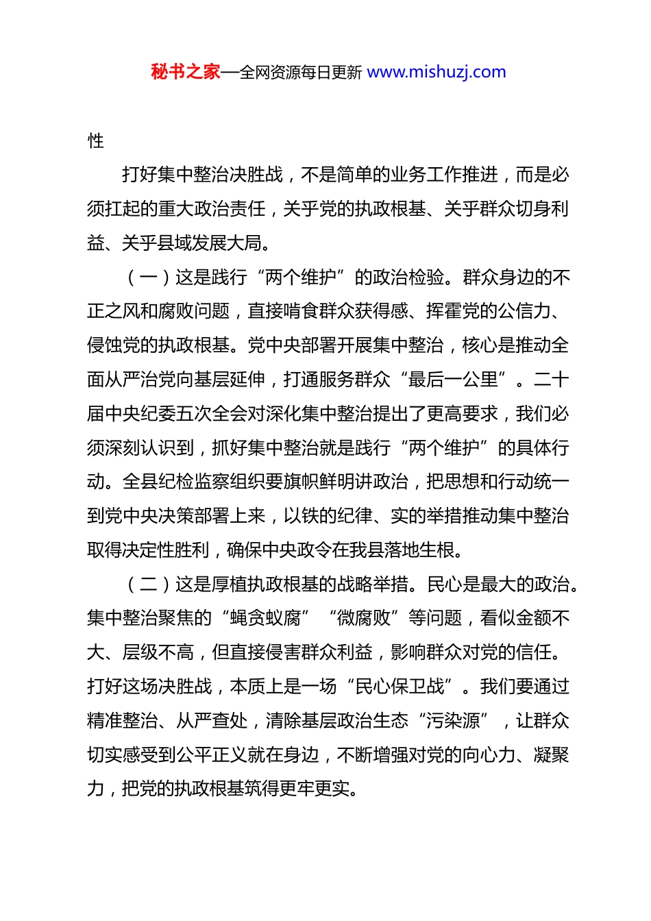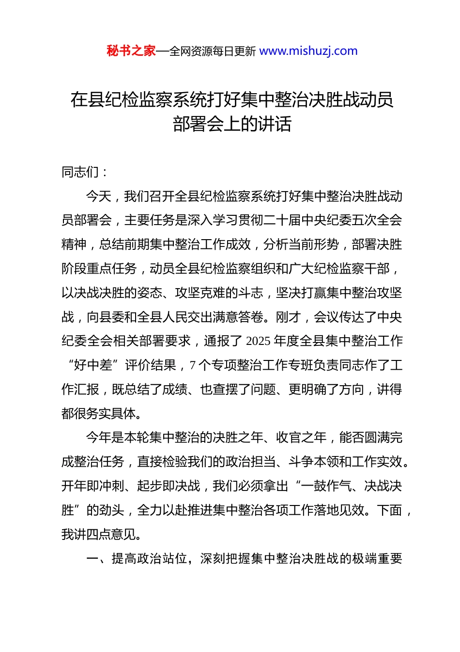 秘书之家—全网资源每日更新 www.mishuzj.com在县纪检监察系统打好集中整治决胜战动员部署会上的讲话 同志们:今天,我们召开全县纪检监察系统打好集中整治决胜战动员部署会,主要任务是深入学习贯彻二十届中央纪委五次全会精神,总结前期集中整治工作成效,分析当前形势,部署决胜阶段重点任务,动员全县纪检监察组织和广大纪检监察干部,以决战决胜的姿态、攻坚克难的斗志,坚决打赢集中整治攻坚战,向县委和全县人民交出满意答卷。刚才,会议传达了中央纪委全会相关部署要求,通报了 2025 年度全县集中整治工作“好中差”评价结果,7 个专项整治工作专班负责同志作了工作汇报,既总结了成绩、也查摆了问题、更明确了方向,讲得都很务实具体。今年是本轮集中整治的决胜之年、收官之年,能否圆满完成整治任务,直接检验我们的政治担当、斗争本领和工作实效。开年即冲刺、起步即决战,我们必须拿出“一鼓作气、决战决胜”的劲头,全力以赴推进集中整治各项工作落地见效。下面,我讲四点意见。一、提高政治站位,深刻把握集中整治决胜战的极端重要秘书之家—全网资源每日更新 www.mishuzj.com性打好集中整治决胜战,不是简单的业务工作推进,而是必须扛起的重大政治责任,关乎党的执政根基、关乎群众切身利益、关乎县域发展大局。(一)这是践行“两个维护”的政治检验。群众身边的不正之风和腐败问题,直接啃食群众获得感、挥霍党的公信力、侵蚀党的执政根基。党中央部署开展集中整治,核心是推动全面从严治党向基层延伸,打通服务群众“最后一公里”。二十届中央纪委五次全会对深化集中整治提出了更高要求,我们必须深刻认识到,抓好集中整治就是践行“两个维护”的具体行动。全县纪检监察组织要旗帜鲜明讲政治,把思想和行动统一到党中央决策部署上来,以铁的纪律、实的举措推动集中整治取得决定性胜利,确保中央政令在我县落地生根。(二)这是厚植执政根基的战略举措。民心是最大的政治。集中整治聚焦的“蝇贪蚁腐”“微腐败”等问题,看似金额不大、层级不高,但直接侵害群众利益,影响群众对党的信任。打好这场决胜战,本质上是一场“民心保卫战”。我们要通过精准整治、从严查处,清除基层政治生态“污染源”,让群众切实感受到公平正义就在身边,不断增强对党的向心力、凝聚力,把党的执政根基筑得更牢更实。秘书之家—全网资源每日更新 www.mishuzj.com(三)这是护航高质量发展的现实需要。风清气正的政治生态、公平公正的发展环境,是县域转型发展、追赶跨越的重要保障。当前,我县正处在高质量发展的关键时期,而群众身边的腐败和作风问题,往往成为阻碍政策落地、影响项目推进、破坏营商环境的“绊脚石”。打好集中整治决胜战,就是要以雷霆之势扫除发展道路上的障碍,为全县经济社会发展清障护航,让企业家安心投资、群众舒心生活,凝聚起推动发展的强大合力。二、正视成绩不足,以清醒认知扛起决胜使命回顾过去一年的集中整治工作,在省市纪委监委的有力指导和县委的坚强领导下,在全县纪检监察干部的辛勤付出和群众的广泛支持下,我们取得了阶段性成效,一批突出问题得到整治、一批典型案件被查处、一批制度漏洞被堵塞,政治生态持续向好。但“行百里者半九十”,决胜阶段往往是最艰难、最关键的阶段,我们必须既要珍视成果、坚定信心,更要正视短板、补齐弱项。(一)总结成功经验,筑牢决胜基础。在前期工作中,我们探索形成了一批行之有效的好做法:比如“专班推进+片区协作”模式,有效整合监督力量,提升了办案质效;“线索清零+重点攻坚”机制,聚焦突出问题靶向发力,形成了强力震秘书之家—全网资源每日更新 www.mishuzj.com慑;“以案促改+警示教育”组合拳,推动整治从“治标”向“治本”延伸。这些宝贵经验是我们打赢决胜战的“法宝”,要继续坚持、固化提升,运用到整治工作全过程。(二)查摆突出短板,破解决胜难题。从通报和汇报情况来看,我们仍存在一些不容忽视的问题:一是思想认识仍有偏差,部分单位存在“上热下冷”“敷衍应付”现象,整治主动性不足;二是案件查办质效不高,部分线索核查不深不透,深挖背后利益链条、关联问题不够;...