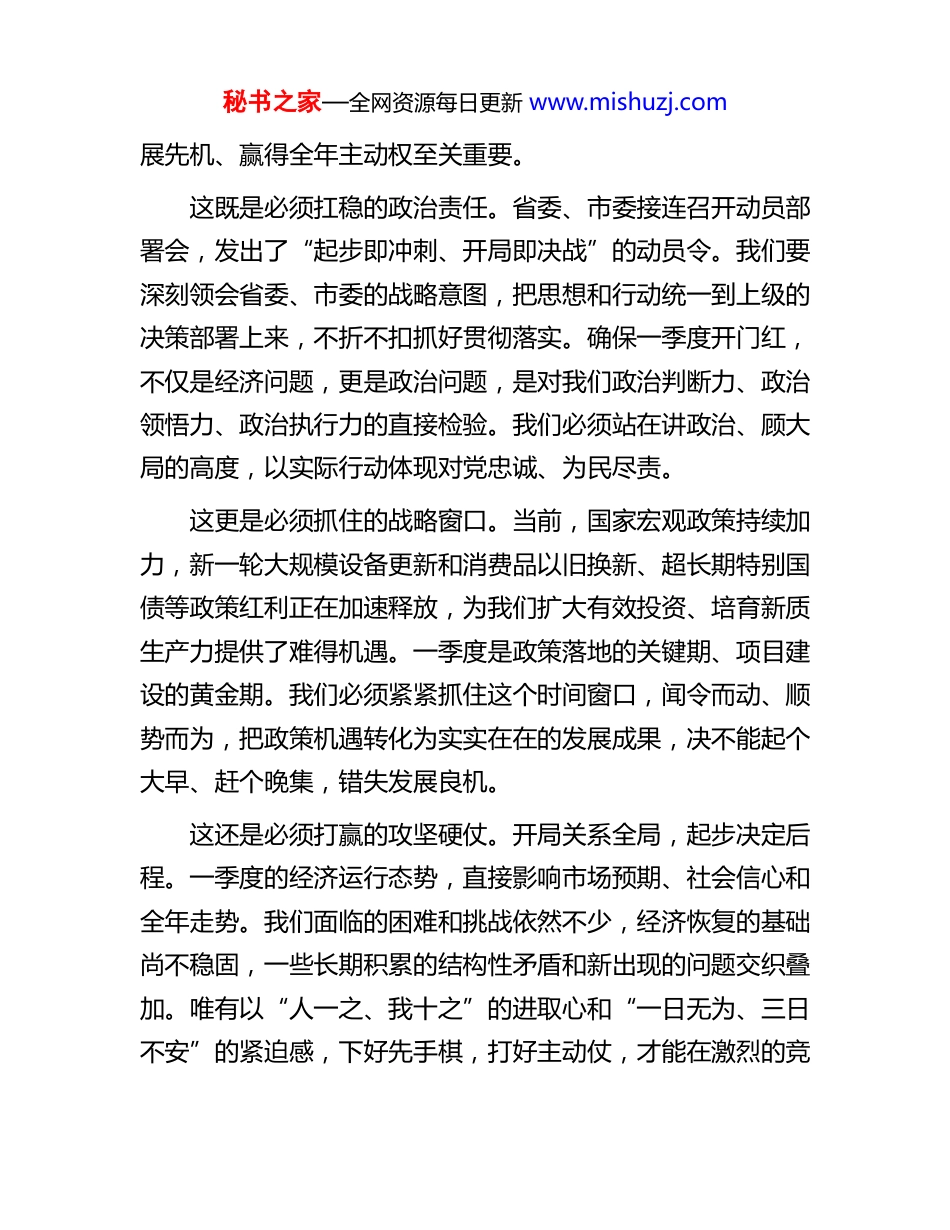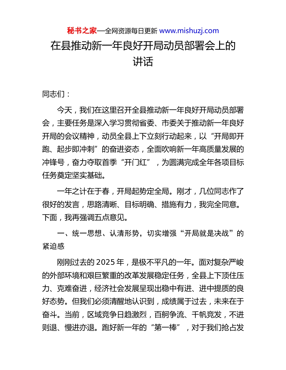 秘书之家—全网资源每日更新 www.mishuzj.com在县推动新一年良好开局动员部署会上的讲话同志们:今天,我们在这里召开全县推动新一年良好开局动员部署会,主要任务是深入学习贯彻省委、市委关于推动新一年良好开局的会议精神,动员全县上下立刻行动起来,以“开局即开跑、起步即冲刺”的奋进姿态,全面吹响新一年高质量发展的冲锋号,奋力夺取首季“开门红”,为圆满完成全年各项目标任务奠定坚实基础。一年之计在于春,开局起势定全局。刚才,几位同志作了很好的发言,思路清晰、目标明确、措施有力,我完全同意。下面,我再强调五点意见。一、统一思想、认清形势,切实增强“开局就是决战”的紧迫感刚刚过去的 2025 年,是极不平凡的一年。面对复杂严峻的外部环境和艰巨繁重的改革发展稳定任务,全县上下顶住压力、克难奋进,经济社会发展呈现出稳中有进、进中提质的良好态势。但我们必须清醒地认识到,成绩属于过去,未来在于奋斗。当前,区域竞争日趋激烈,百舸争流、千帆竞发,不进则退、慢进亦退。跑好新一年的“第一棒”,对于我们抢占发秘书之家—全网资源每日更新 www.mishuzj.com展先机、赢得全年主动权至关重要。这既是必须扛稳的政治责任。省委、市委接连召开动员部署会,发出了“起步即冲刺、开局即决战”的动员令。我们要深刻领会省委、市委的战略意图,把思想和行动统一到上级的决策部署上来,不折不扣抓好贯彻落实。确保一季度开门红,不仅是经济问题,更是政治问题,是对我们政治判断力、政治领悟力、政治执行力的直接检验。我们必须站在讲政治、顾大局的高度,以实际行动体现对党忠诚、为民尽责。这更是必须抓住的战略窗口。当前,国家宏观政策持续加力,新一轮大规模设备更新和消费品以旧换新、超长期特别国债等政策红利正在加速释放,为我们扩大有效投资、培育新质生产力提供了难得机遇。一季度是政策落地的关键期、项目建设的黄金期。我们必须紧紧抓住这个时间窗口,闻令而动、顺势而为,把政策机遇转化为实实在在的发展成果,决不能起个大早、赶个晚集,错失发展良机。这还是必须打赢的攻坚硬仗。开局关系全局,起步决定后程。一季度的经济运行态势,直接影响市场预期、社会信心和全年走势。我们面临的困难和挑战依然不少,经济恢复的基础尚不稳固,一些长期积累的结构性矛盾和新出现的问题交织叠加。唯有以“人一之、我十之”的进取心和“一日无为、三日不安”的紧迫感,下好先手棋,打好主动仗,才能在激烈的竞秘书之家—全网资源每日更新 www.mishuzj.com争中脱颖而出,牢牢把握发展主动权。二、聚焦关键、精准发力,奋力夺取“首季开门红”的决定性胜利实现一季度“开门红”,必须要有硬招数、实举措。全县各级各部门要牢固树立“项目为王、环境是金”的理念,围绕重点领域和关键环节,全力以赴拼经济、搞建设、抓发展。一要全力提速项目建设,筑牢发展“压舱石”。项目是经济发展的生命线。要坚持一切围绕项目转、一切盯着项目干,迅速掀起新一轮项目建设热潮。要跑出项目复工“加速度”,建立重点项目复工复产台账,实行清单化管理,确保XX 新区基础设施建设、XX 产业园二期工程等 15 个省市县重点项目在 2 月底前全面复工,一季度固定资产投资增长确保达到 10%以上。要跑出项目建设“新进度”,严格落实“一个项目、一名领导、一个专班、一抓到底”的工作机制,挂图作战、倒排工期,全力破解征地拆迁、要素保障等瓶颈制约,推动 XX 高端装备制造基地等在建项目加快形成更多实物工作量。要跑出项目谋划“高质量”,紧盯国家政策导向和投资方向,聚焦新能源、新材料、数字经济等领域,精心谋划储备一批打基础、利长远、增后劲的大项目、好项目,确保项目库储备充足、梯次接续。二要全力攻坚招商引资,激活发展“新引擎”。要把招秘书之家—全网资源每日更新 www.mishuzj.com商引资作为经济工作的“头号工程”,坚持全员齐上阵,迅速形成大抓招商、大抓项目的浓厚氛围。要聚焦主导产业,围绕我们确定的“2+3”现代产业体系,绘制产业图谱和招商地图,瞄准 XX、XX 等重点区域,开展精准招商、产业链招商。要创新方式方法,既要发挥好“...