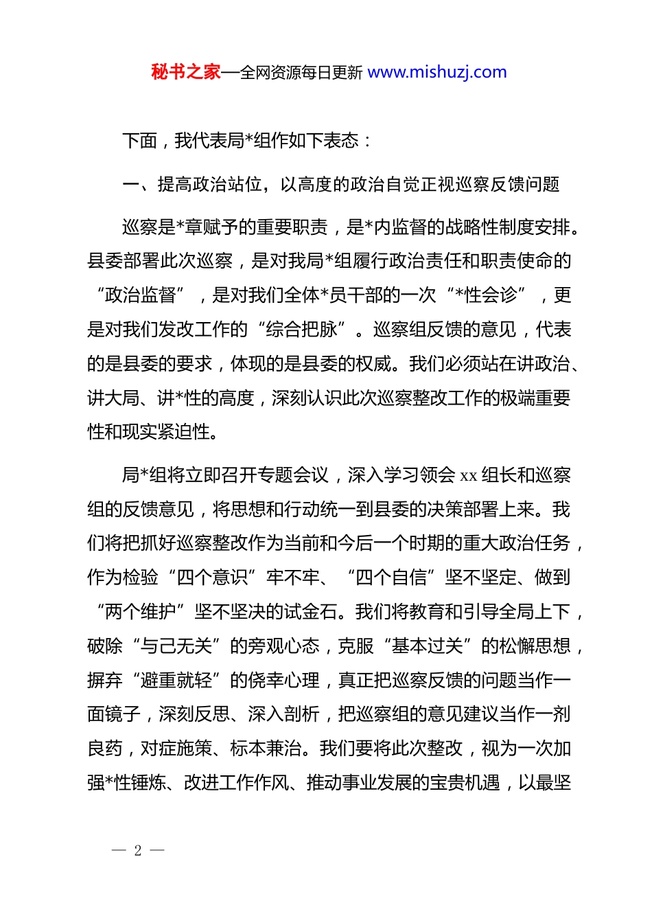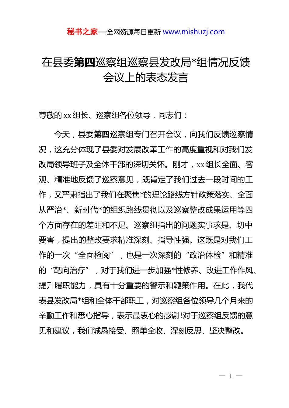 秘书之家—全网资源每日更新 www.mishuzj.com在县委第四巡察组巡察县发改局*组情况反馈会议上的表态发言尊敬的 xx 组长、巡察组各位领导,同志们:今天,县委第四巡察组专门召开会议,向我们反馈巡察情况,这充分体现了县委对发展改革工作的高度重视和对我们发改局领导班子及全体干部的深切关怀。刚才,xx 组长全面、客观、精准地反馈了巡察意见,既肯定了我们过去一段时间的工作,又严肃指出了我们在聚焦*的理论路线方针政策落实、全面从严治*、新时代*的组织路线贯彻以及巡察整改成果运用等四个方面存在的差距和不足。巡察组指出的问题实事求是、切中要害,提出的整改要求精准深刻、指导性强。这既是对我们工作的一次“全面检阅”,也是一次深刻的“政治体检”和精准的“靶向治疗”,对于我们进一步加强*性修养、改进工作作风、提升履职能力,具有十分重要的警示和鞭策作用。在此,我代表县发改局*组和全体干部职工,对巡察组各位领导几个月来的辛勤工作和悉心指导,表示最衷心的感谢!对于巡察组反馈的意见和建议,我们诚恳接受、照单全收、深刻反思、坚决整改。— 1 —秘书之家—全网资源每日更新 www.mishuzj.com下面,我代表局*组作如下表态:一、提高政治站位,以高度的政治自觉正视巡察反馈问题巡察是*章赋予的重要职责,是*内监督的战略性制度安排。县委部署此次巡察,是对我局*组履行政治责任和职责使命的“政治监督”,是对我们全体*员干部的一次“*性会诊”,更是对我们发改工作的“综合把脉”。巡察组反馈的意见,代表的是县委的要求,体现的是县委的权威。我们必须站在讲政治、讲大局、讲*性的高度,深刻认识此次巡察整改工作的极端重要性和现实紧迫性。局*组将立即召开专题会议,深入学习领会 xx 组长和巡察组的反馈意见,将思想和行动统一到县委的决策部署上来。我们将把抓好巡察整改作为当前和今后一个时期的重大政治任务,作为检验“四个意识”牢不牢、“四个自信”坚不坚定、做到“两个维护”坚不坚决的试金石。我们将教育和引导全局上下,破除“与己无关”的旁观心态,克服“基本过关”的松懈思想,摒弃“避重就轻”的侥幸心理,真正把巡察反馈的问题当作一面镜子,深刻反思、深入剖析,把巡察组的意见建议当作一剂良药,对症施策、标本兼治。我们要将此次整改,视为一次加强*性锤炼、改进工作作风、推动事业发展的宝贵机遇,以最坚— 2 —秘书之家—全网资源每日更新 www.mishuzj.com决的态度、最果断的措施、最有力的行动,不折不扣地把各项整改要求落到实处。二、强化责任担当,以过硬的组织举措确保整改任务落实巡察发现问题是前提,整改落实是关键。针对巡察组指出的问题,我们将坚持问题导向,聚焦病灶、深挖根源,以“钉钉子”的精神,全力以赴抓好整改落实,确保问题整改见底清零。一是立即成立整改领导小组。由我担任组长,作为巡察整改的第一责任人,对整改工作负总责、亲自抓。其他班子成员按照“一岗双责”要求,主动认领分管领域内的整改任务,靠前指挥,具体抓、抓具体。我们将迅速组建工作专班,确保整改工作有专门机构负责、有专职人员推进。二是科学制定整改方案。我们将逐条逐项对照巡察反馈的问题,深入研究,细致梳理,在两周内制定出详尽的《巡察整改工作方案》。方案将建立“问题清单、任务清单、责任清单”三张清单,把整改任务精准分解到具体责任领导、责任科室和责任人,确保每一项任务都目标清晰、责任明确。我们将坚持举一反三,不仅就事论事解决具体问题,更要深挖问题背— 3 —秘书之家—全网资源每日更新 www.mishuzj.com后的体制机制障碍和思想根源性问题,做到整改一个问题、堵塞一批漏洞、完善一套制度。三是严格实行销号管理。我们将采取“挂图作战”的方式,明确整改时限,实行台账式管理、项目化推进。对于能够立即解决的问题,我们将立行立改,确保在最短时间内见到成效。对于需要一定时间解决的,我们将明确时间节点,倒排工期,持续跟踪督办,确保按期完成。对于需要长期坚持的,我们将建立长效机制,常抓不懈,防止问题反弹回潮。我们将定期召开*组会议听取整改工作进展汇报,研究解决整改过程中的难点...