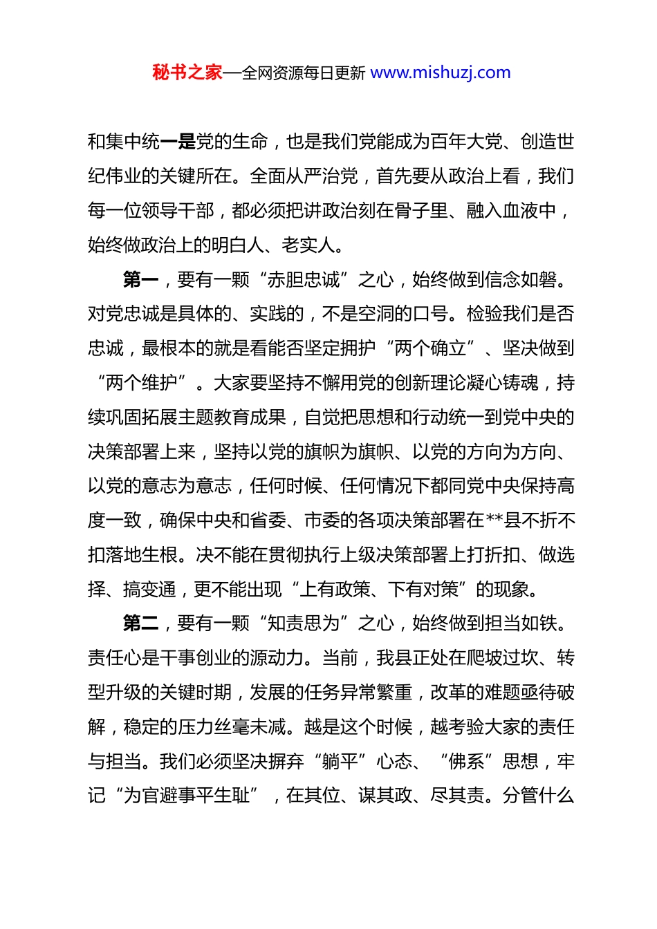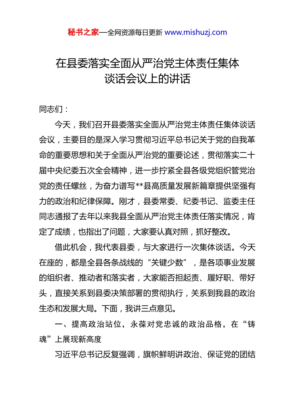 秘书之家—全网资源每日更新 www.mishuzj.com在县委落实全面从严治党主体责任集体谈话会议上的讲话 同志们:今天,我们召开县委落实全面从严治党主体责任集体谈话会议,主要目的是深入学习贯彻习近平总书记关于党的自我革命的重要思想和关于全面从严治党的重要论述,贯彻落实二十届中央纪委五次全会精神,进一步拧紧全县各级党组织管党治党的责任螺丝,为奋力谱写**县高质量发展新篇章提供坚强有力的政治和纪律保障。刚才,县委常委、纪委书记、监委主任同志通报了去年以来我县全面从严治党主体责任落实情况,肯定了成绩,也指出了问题,大家要认真对照,抓好整改。借此机会,我代表县委,与大家进行一次集体谈话。今天在座的,都是全县各条战线的“关键少数”,是各项事业发展的组织者、推动者和落实者,大家能否担起责、履好职、带好头,直接关系到县委决策部署的贯彻执行,关系到我县的政治生态和发展大局。下面,我讲三点意见。一、提高政治站位,永葆对党忠诚的政治品格,在“铸魂”上展现新高度习近平总书记反复强调,旗帜鲜明讲政治、保证党的团结秘书之家—全网资源每日更新 www.mishuzj.com和集中统一是党的生命,也是我们党能成为百年大党、创造世纪伟业的关键所在。全面从严治党,首先要从政治上看,我们每一位领导干部,都必须把讲政治刻在骨子里、融入血液中,始终做政治上的明白人、老实人。第一,要有一颗“赤胆忠诚”之心,始终做到信念如磐。对党忠诚是具体的、实践的,不是空洞的口号。检验我们是否忠诚,最根本的就是看能否坚定拥护“两个确立”、坚决做到“两个维护”。大家要坚持不懈用党的创新理论凝心铸魂,持续巩固拓展主题教育成果,自觉把思想和行动统一到党中央的决策部署上来,坚持以党的旗帜为旗帜、以党的方向为方向、以党的意志为意志,任何时候、任何情况下都同党中央保持高度一致,确保中央和省委、市委的各项决策部署在**县不折不扣落地生根。决不能在贯彻执行上级决策部署上打折扣、做选择、搞变通,更不能出现“上有政策、下有对策”的现象。第二,要有一颗“知责思为”之心,始终做到担当如铁。责任心是干事创业的源动力。当前,我县正处在爬坡过坎、转型升级的关键时期,发展的任务异常繁重,改革的难题亟待破解,稳定的压力丝毫未减。越是这个时候,越考验大家的责任与担当。我们必须坚决摒弃“躺平”心态、“佛系”思想,牢记“为官避事平生耻”,在其位、谋其政、尽其责。分管什么秘书之家—全网资源每日更新 www.mishuzj.com工作,就要心无旁骛地把这项工作抓实抓好;联系哪个乡镇、哪个部门,就要真心实意地帮助解决实际困难。要把心思用在谋发展上,把精力花在抓落实上,把功夫下在解难题上,切实把分管领域的工作和群众关心的问题扛在肩上、抓在手上,做到守土有责、守土负责、守土尽责。第三,要有一颗“奋发进取”之心,始终做到追求如一。身处百舸争流、千帆竞发的时代,不进则退,慢进也是退。我们不能满足于守摊子、过得去,必须要有“跳起来摘桃子”的闯劲和“无功便是过”的危机感。要主动把**县的工作放到全市、全省乃至全国的大局中去审视、去谋划、去推动,努力在各自的领域创造特色、树立品牌、作出示范。要敢于同先进比高下,敢于同自己过不去,推动各项工作在全市乃至全省争先进位。比如,我们的工业园区建设、乡村全面振兴、文旅融合发展等重点工作,都要有更高的目标定位,要拿出具体的、可操作的、能见效的思路举措,力争干出一批经得起实践、人民和历史检验的业绩。二、聚焦中心任务,践行人民至上的根本立场,在“担当”上干出新作为权力是党和人民赋予的,是为党和人民做事的。我们手中的权力,只能用来为民谋利。每一位领导干部都要始终牢记秘书之家—全网资源每日更新 www.mishuzj.com“我是谁、为了谁、依靠谁”这个根本问题,走好“为官一任、造福一方”的人间正道。第一,要答好“发展之问”,在服务大局中展现**担当。发展是解决一切问题的基础和关键。当前,我县的经济社会发展取得了一定成效,但面临的挑战依然严峻。大家要自觉立足全局、服务大局,紧紧围绕县委确定的年度目标任务,聚焦扩大有效投...