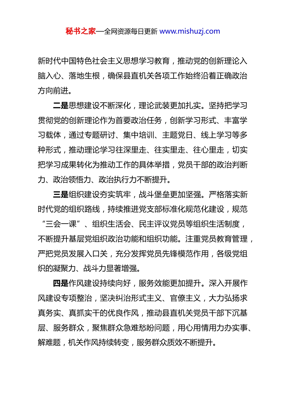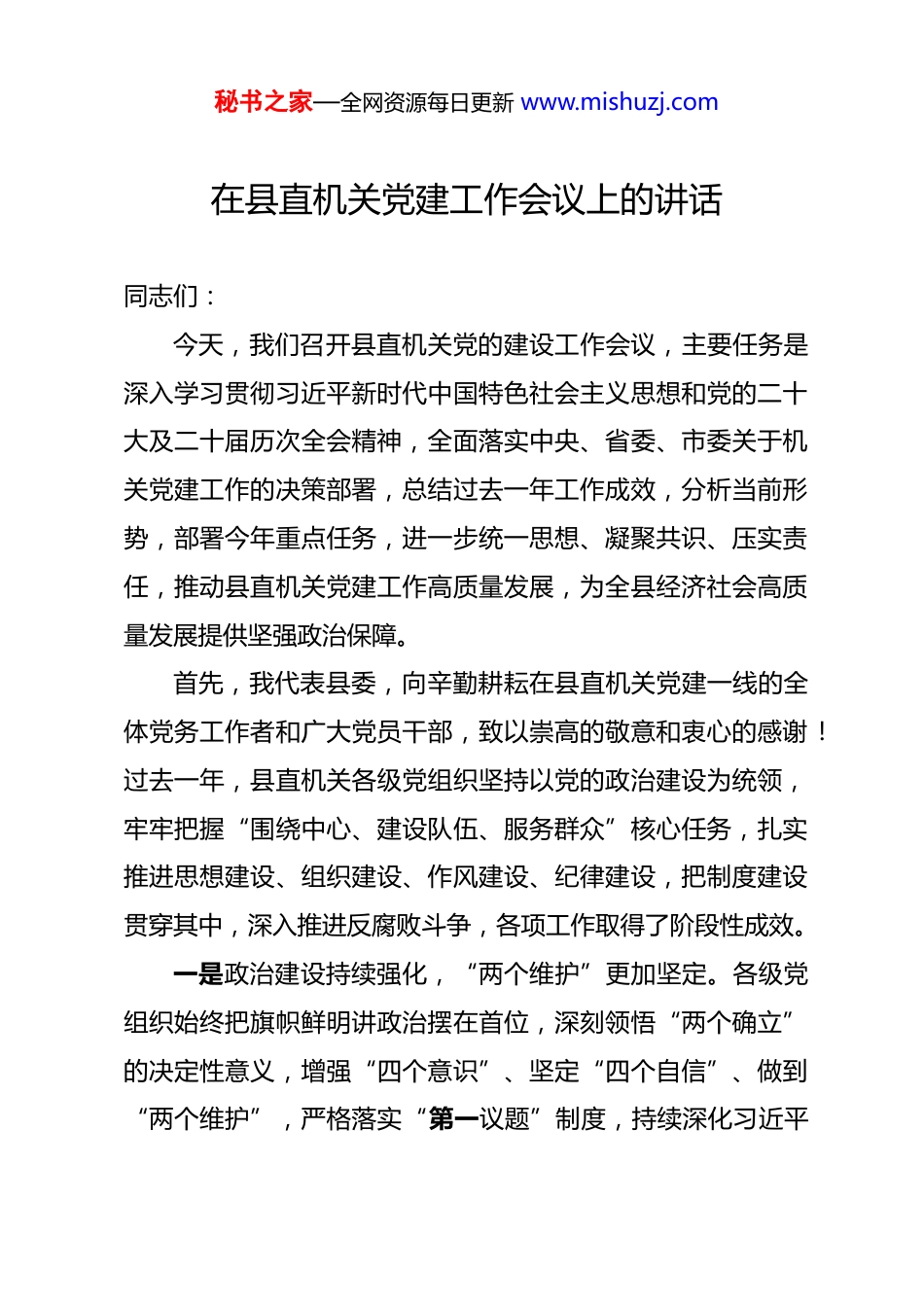 秘书之家—全网资源每日更新 www.mishuzj.com在县直机关党建工作会议上的讲话 同志们:今天,我们召开县直机关党的建设工作会议,主要任务是深入学习贯彻习近平新时代中国特色社会主义思想和党的二十大及二十届历次全会精神,全面落实中央、省委、市委关于机关党建工作的决策部署,总结过去一年工作成效,分析当前形势,部署今年重点任务,进一步统一思想、凝聚共识、压实责任,推动县直机关党建工作高质量发展,为全县经济社会高质量发展提供坚强政治保障。首先,我代表县委,向辛勤耕耘在县直机关党建一线的全体党务工作者和广大党员干部,致以崇高的敬意和衷心的感谢!过去一年,县直机关各级党组织坚持以党的政治建设为统领,牢牢把握“围绕中心、建设队伍、服务群众”核心任务,扎实推进思想建设、组织建设、作风建设、纪律建设,把制度建设贯穿其中,深入推进反腐败斗争,各项工作取得了阶段性成效。一是政治建设持续强化,“两个维护”更加坚定。各级党组织始终把旗帜鲜明讲政治摆在首位,深刻领悟“两个确立”的决定性意义,增强“四个意识”、坚定“四个自信”、做到“两个维护”,严格落实“第一议题”制度,持续深化习近平秘书之家—全网资源每日更新 www.mishuzj.com新时代中国特色社会主义思想学习教育,推动党的创新理论入脑入心、落地生根,确保县直机关各项工作始终沿着正确政治方向前进。二是思想建设不断深化,理论武装更加扎实。坚持把学习贯彻党的创新理论作为首要政治任务,创新学习形式、丰富学习载体,通过专题研讨、集中培训、主题党日、线上学习等多种形式,推动理论学习往深里走、往实里走、往心里走,切实把学习成果转化为推动工作的具体举措,党员干部的政治判断力、政治领悟力、政治执行力不断提升。三是组织建设夯实筑牢,战斗堡垒更加坚强。严格落实新时代党的组织路线,持续推进党支部标准化规范化建设,规范“三会一课”、组织生活会、民主评议党员等组织生活制度,不断提升基层党组织政治功能和组织功能。注重党员教育管理,严把党员发展入口关,充分发挥党员先锋模范作用,各级党组织的凝聚力、战斗力显著增强。四是作风建设持续向好,服务效能更加提升。深入开展作风建设专项整治,坚决纠治形式主义、官僚主义,大力弘扬求真务实、真抓实干的优良作风,推动县直机关党员干部下沉基层、服务群众,聚焦群众急难愁盼问题,用心用情用力办实事、解难题,机关作风持续转变,服务群众质效不断提升。秘书之家—全网资源每日更新 www.mishuzj.com五是纪律建设刚性约束,政治生态更加清朗。始终坚持严的主基调不动摇,加强党风廉政教育,常态化开展警示教育,引导党员干部知敬畏、存戒惧、守底线。严格落实全面从严治党主体责任,强化监督执纪问责,严肃查处违纪违法问题,着力营造风清气正、干事创业的良好政治生态。在肯定成绩的同时,我们也要清醒地认识到,当前县直机关党建工作还存在一些不容忽视的问题和短板:一是部分党组织对党建工作重要性认识不足,存在“重业务、轻党建”的现象,党建与业务融合不够深入,“两张皮”问题仍未根本解决;二是少数基层党组织建设标准不高,组织生活不够规范,“三会一课”质量不高,政治功能和组织功能发挥不够充分;三是部分党员干部先锋模范作用发挥不明显,担当作为意识不强,工作作风不够严实,存在庸懒散拖等问题;四是党建工作创新意识不足,方式方法较为传统,针对性和实效性不够强,缺乏特色亮点;五是部分党务工作者业务能力有待提升,履职尽责的主动性和创造性不够,难以适应新时代机关党建工作的新要求。这些问题,我们必须高度重视,在今后的工作中认真加以解决。同志们,2026 年是中国共产党成立 105 周年,是“十五五”开局之年,抓好县直机关党建工作意义重大、责任重大。秘书之家—全网资源每日更新 www.mishuzj.com今年县直机关党建工作的总体要求是:坚持以习近平新时代中国特色社会主义思想为指导,全面贯彻党的二十大及二十届历次全会精神,深入落实习近平总书记关于党的建设的重要思想、关于党的自我革命的重要思想,以党的政治建设为统领,聚焦“服务中心、建设队伍”核心任务...