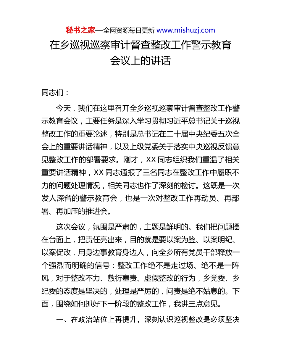 秘书之家—全网资源每日更新 www.mishuzj.com在乡巡视巡察审计督查整改工作警示教育会议上的讲话同志们:今天,我们在这里召开全乡巡视巡察审计督查整改工作警示教育会议,主要任务是深入学习贯彻习近平总书记关于巡视整改工作的重要论述,特别是总书记在二十届中央纪委五次全会上的重要讲话精神,以及上级党委关于落实中央巡视反馈意见整改工作的部署要求。刚才,XX 同志组织我们重温了相关重要讲话精神,XX 同志通报了三名同志在整改工作中履职不力的问题处理情况,相关同志也作了深刻的检讨。这既是一次发人深省的警示教育会,也是一次对整改工作再动员、再部署、再加压的推进会。这次会议,氛围是严肃的,主题是鲜明的。我们把问题摆在台面上,把责任亮出来,目的就是要以案为鉴、以案明纪、以案促改,用身边事教育身边人,向全乡所有党员干部释放一个强烈而明确的信号:整改工作绝不是走过场、绝不是一阵风,对于整改不力、敷衍塞责、虚假整改的行为,乡党委、乡纪委的态度是坚决的,处理是严厉的,问责是绝不姑息的。下面,围绕如何抓好下一阶段的整改工作,我讲三点意见。一、在政治站位上再提升,深刻认识巡视整改是必须坚决秘书之家—全网资源每日更新 www.mishuzj.com扛起的重大政治责任习近平总书记反复强调,巡视发现问题的目的是解决问题,巡视整改不落实,就是对党不忠诚、对人民不负责。我们必须清醒地认识到,巡视巡察是党之利器、国之利器,是上级党组织对我们进行的全面“政治体检”,而整改落实就是我们必须服从的“政治医嘱”,是对我们“四个意识”强不强、“两个维护”做得好不好的直接检验。抓好整改,是政治任务,更是政治纪律和政治规矩。刚才通报的问题,虽然发生在那三个村,但根子却值得我们全乡每一位党员干部深思。这三个案例,看似是具体工作上的疏漏和懈怠,但本质上是政治站位不高、思想认识不到位、责任担当不强的突出表现。他们没有把巡视巡察反馈的问题当作一面镜子来照、一把尺子来量,没有真正从政治高度去审视和推动整改,导致整改工作打了折扣、走了过场。这不仅仅是个别同志、个别村的问题,它严重损害了我们全乡整改工作的严肃性和整体成效,更损害了党委、政府在人民群众心中的形象和公信力。如果我们对这些问题视而不见、麻木不仁,那么小问题就会演变成大问题,小管涌就会沦为大塌方,最终侵蚀的是我们党的执政根基。全乡上下,每一个党组织、每一名党员干部,都必须把自己摆进去、把职责摆进去、把工作摆进去,进行一次深刻的秘书之家—全网资源每日更新 www.mishuzj.com“政治对表”和“思想扫描”。要扪心自问:我们是否真正把整改工作当作头等大事来抓?我们是否对反馈的问题清单和整改要求了然于胸?我们是否在整改中做到了举一反三、标本兼治?我们是否真正以对党、对人民、对事业高度负责的态度来推动工作?全乡各级党组织和党员干部要从讲政治的高度,深刻理解整改工作的极端重要性。要坚决摒弃“与己无关”的看客心态、“蒙混过关”的侥幸心理、“新官不理旧账”的错误观念。巡视巡察反馈的问题,无论涉及到哪个领域、哪个层级、哪个人,都是我们 XX 乡共同的问题,整改的责任我们必须共同承担。我们必须以“坐不住”的紧张感、“等不起”的责任感、“慢不得”的危机感,真正把巡视巡察审计督查的整改工作作为当前最重要、最紧迫的政治任务抓紧抓实抓好,以实际行动诠释对党的绝对忠诚。二、在思想认识上再强化,深刻理解问题整改是必须动真碰硬的攻坚战役发现问题不整改,比不发现问题的后果更严重。这是我们反复强调的一句话。基层书记作为整改工作的第一责任人,不抓整改、抓不好整改,就是严重的失职。我们必须在思想认识层面,对整改工作进行再细化、再深化,坚决杜绝“纸上整改”“虚假整改”“表面整改”等形式主义、官僚主义问题。秘书之家—全网资源每日更新 www.mishuzj.com一要强化“主动研究”的意识,做到深挖根源、精准画像。整改不能停留在“头痛医头、脚痛医脚”的浅表层次。对于反馈的每一个问题,我们都不能简单地就事论事。要组织力量,深入开展调查研究,透过现象看本质,把问题的来龙去脉搞清...